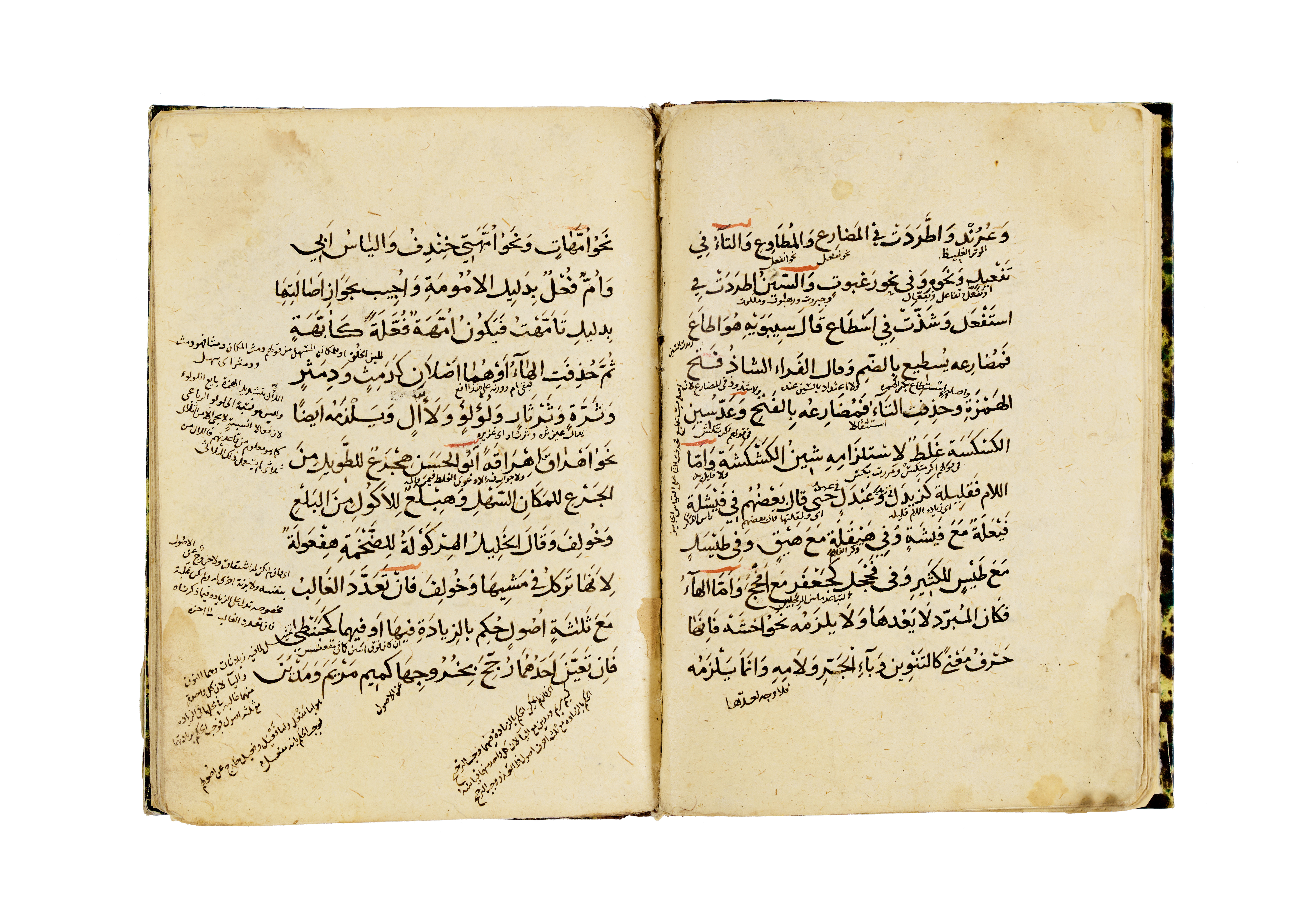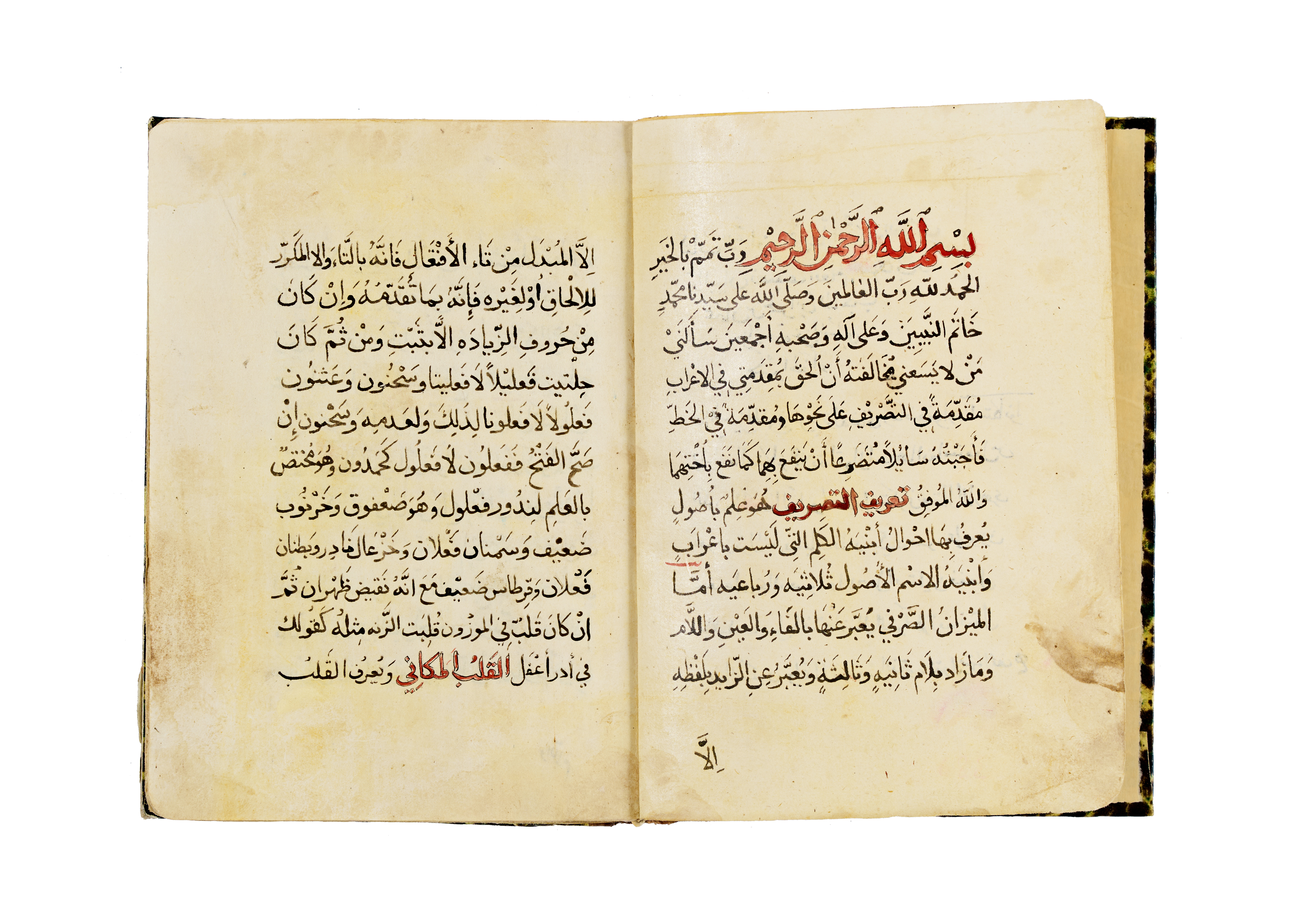 Written in clear black naskh script with rubrication in red, the text opens with a dedication to the science of sarf (morphology) and proceeds through detailed theoretical discussion, combining grammatical rules with logical structure. The layout is carefully ruled, and the manuscript includes poetic flourishes and classical didactic features that were used to aid memorisation and scholarly transmission. The manuscript is bound in a marbled-paper cover in shades of green, brown, and yellow, with a leather spine.