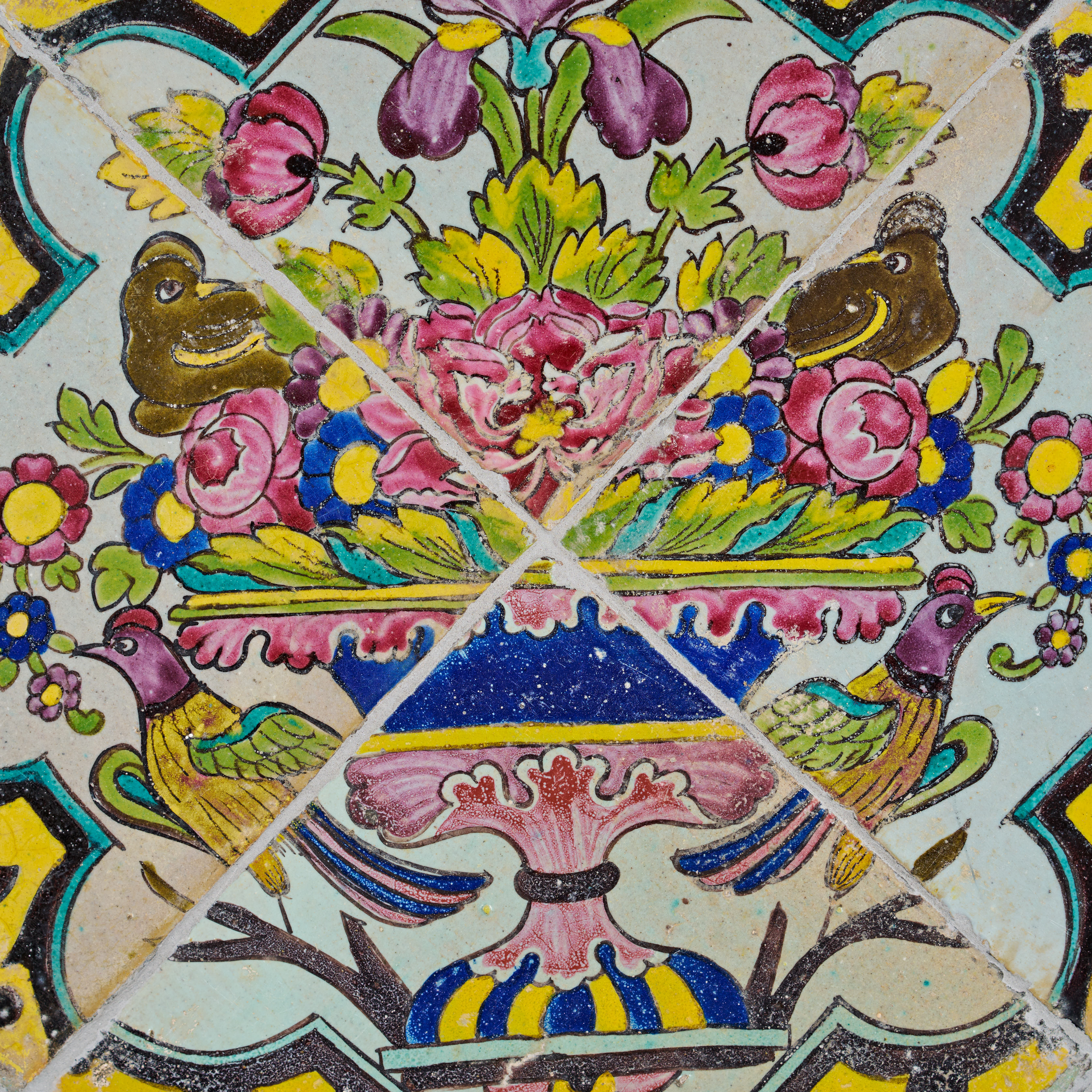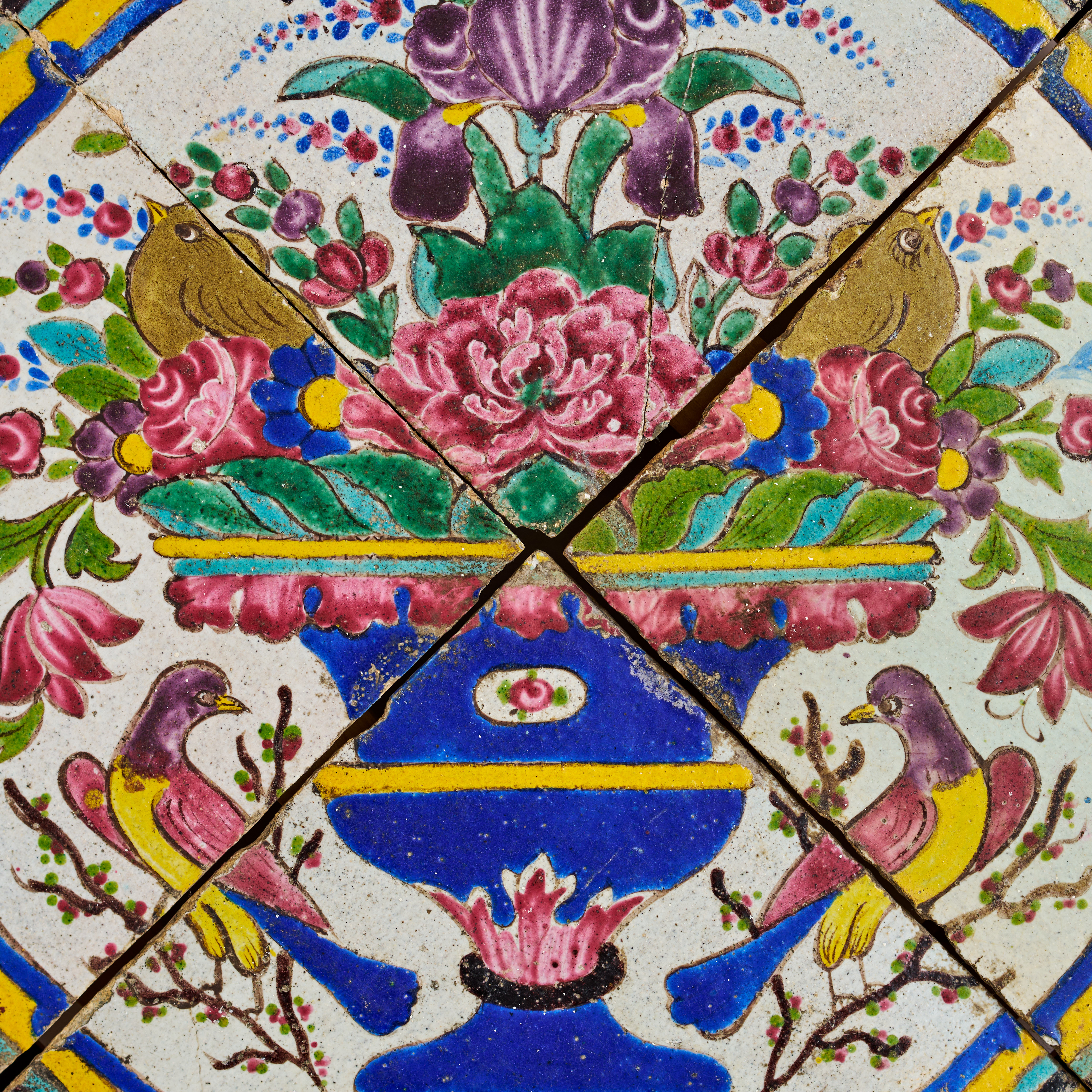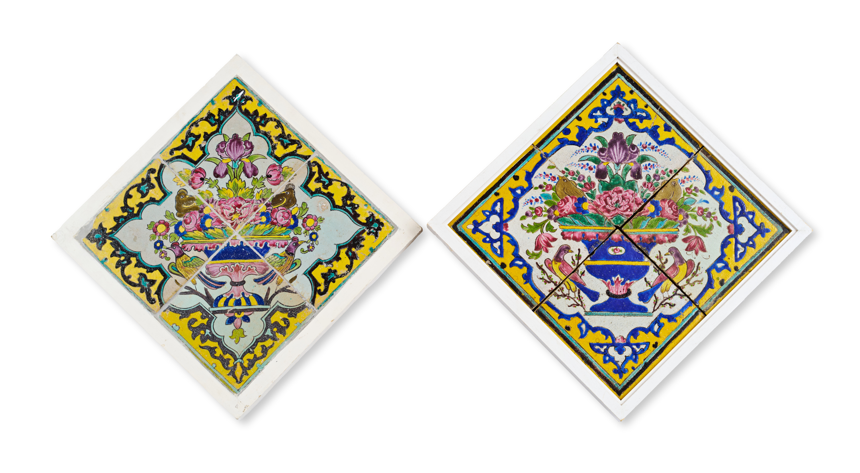 Two Cuerda Seca tile panels are each composed of four tiles arranged in a diamond-shaped format and mounted within a white frame. Each panel is richly decorated with a central floral bouquet overflowing from an ornate vase or bowl, flanked by pairs of birds.