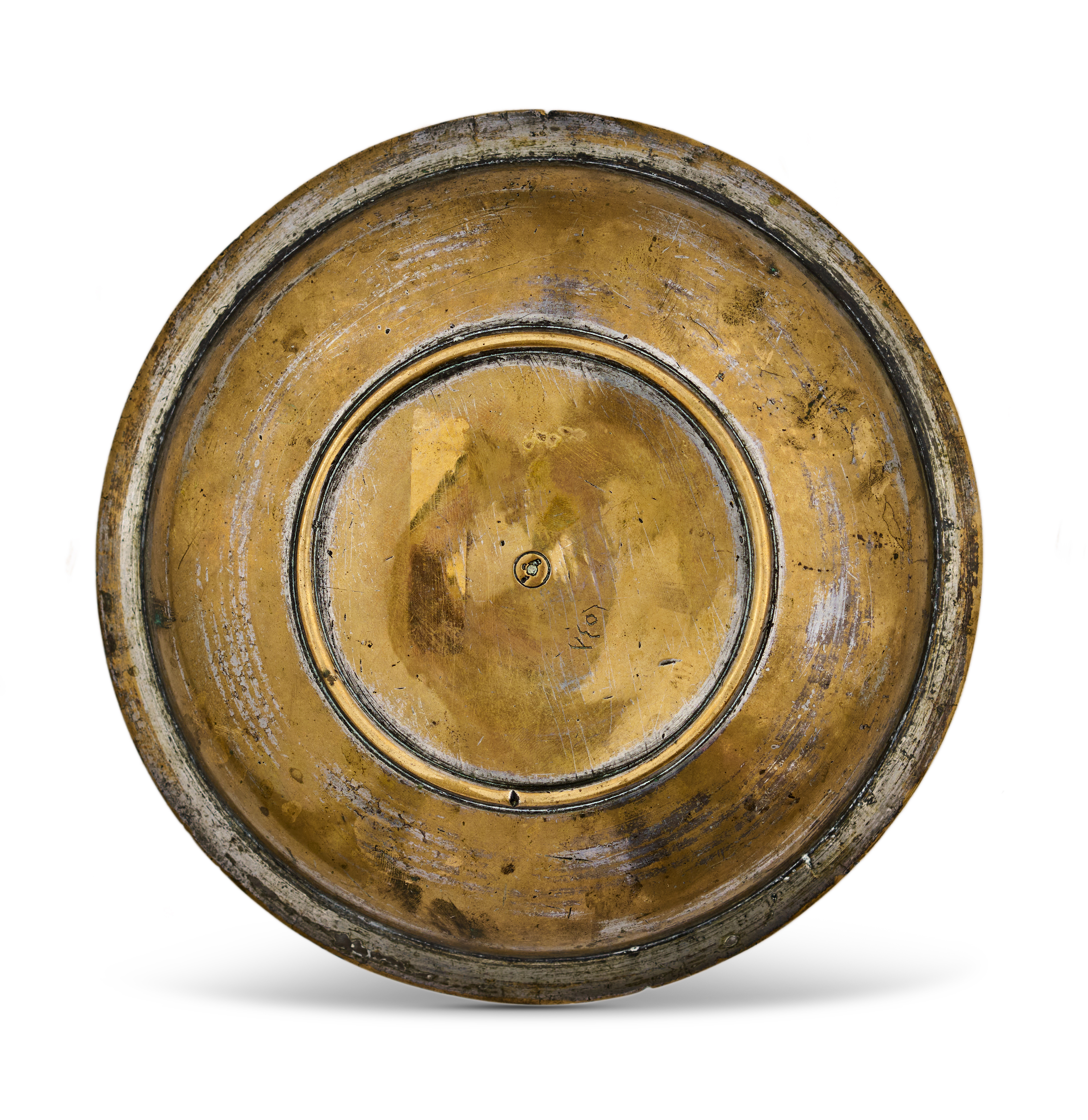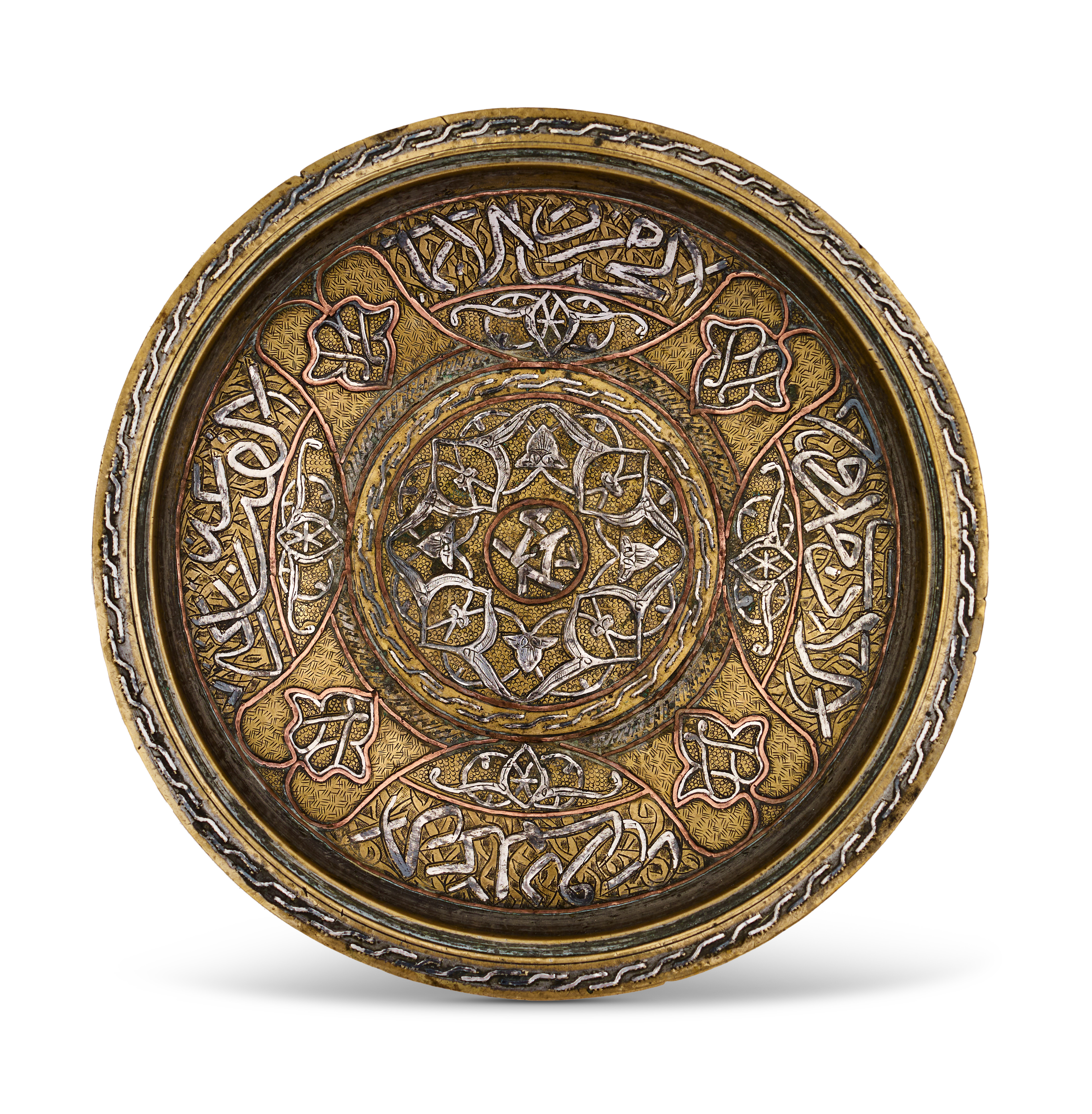 Of shallow form with rounded sides, richly inlaid with silver and copper in thuluth script interspersed with geometric and vegetal motifs, the reverse plain with a mark.