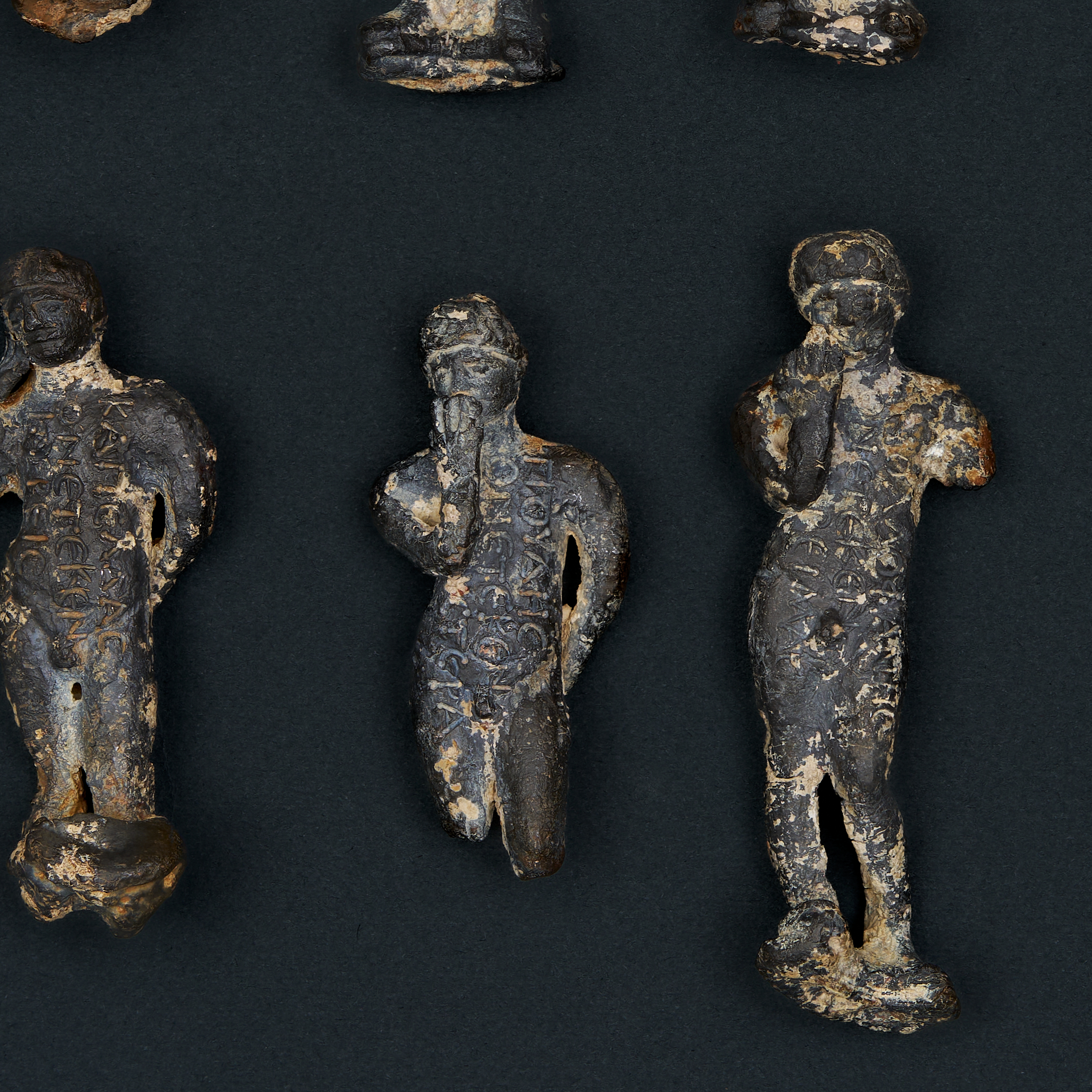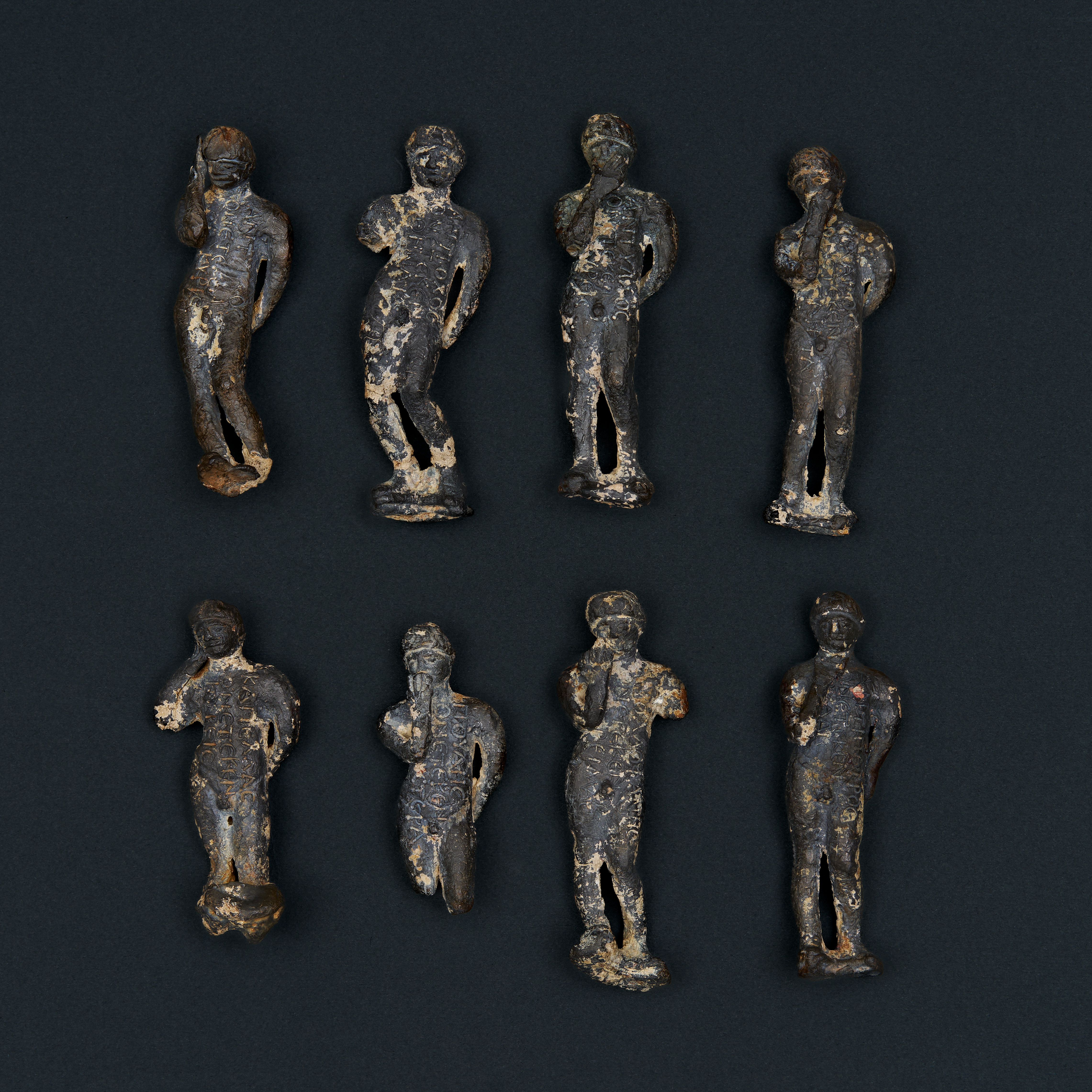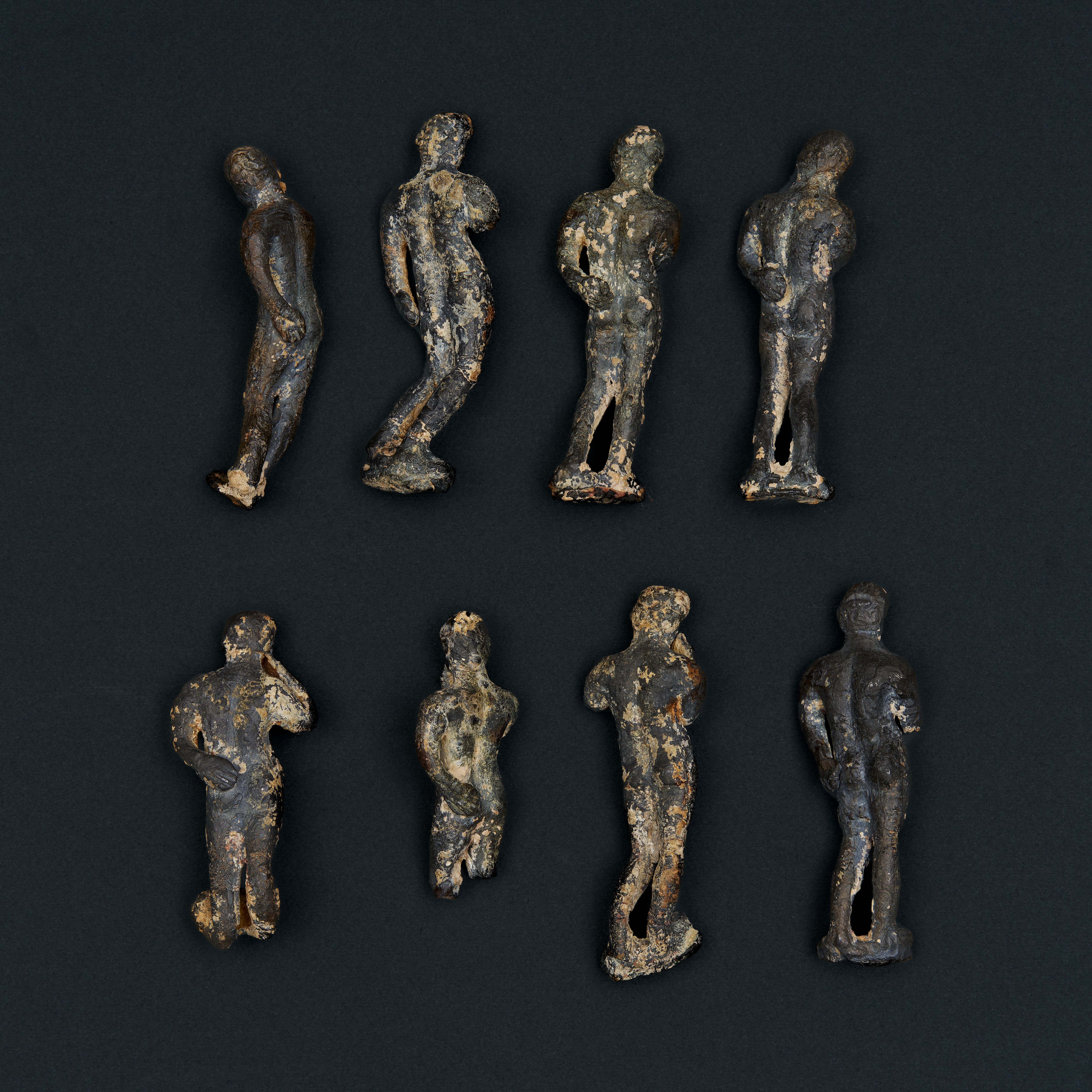 A rare and evocative assemblage of eight cast lead figures from the late Roman Empire, dating to approximately the 3rd–4th century A.D. Each figure is depicted standing or slightly shifting in posture, with a hand raised to the mouth or chin—a gesture often associated with votive behavior, ritual silence, or penitence.