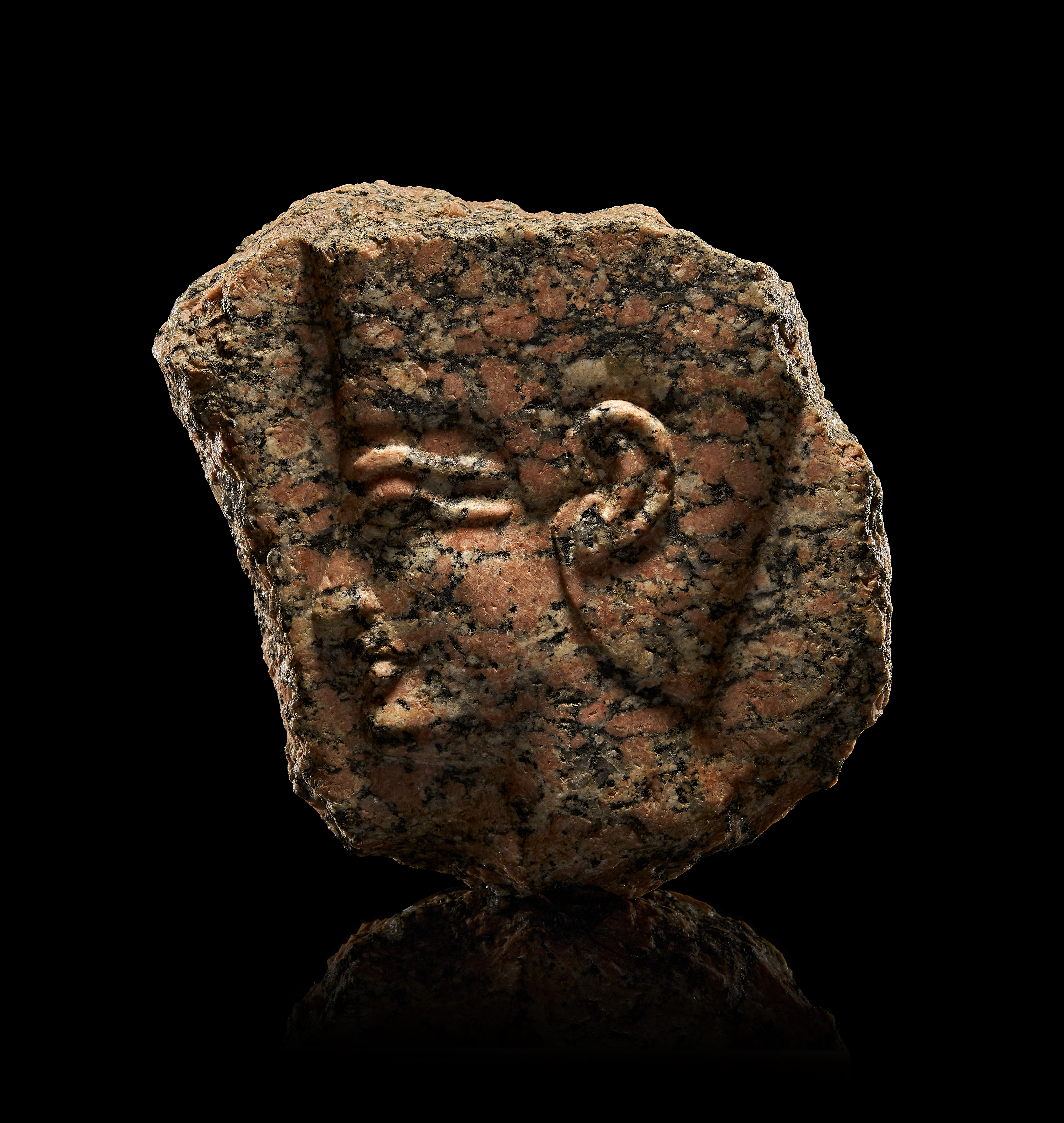 Carved from rich reddish granite flecked with dark inclusions, the fragment is a compelling testament to the precision and durability of Egyptian stonework. Despite its fragmentary state, the remaining details exhibit exceptional quality in both material and craftsmanship. The front-facing crown and stylistic execution suggest the piece once belonged to a larger monumental sculpture or temple relief, perhaps commemorating a ruler or used in a royal cult context.
