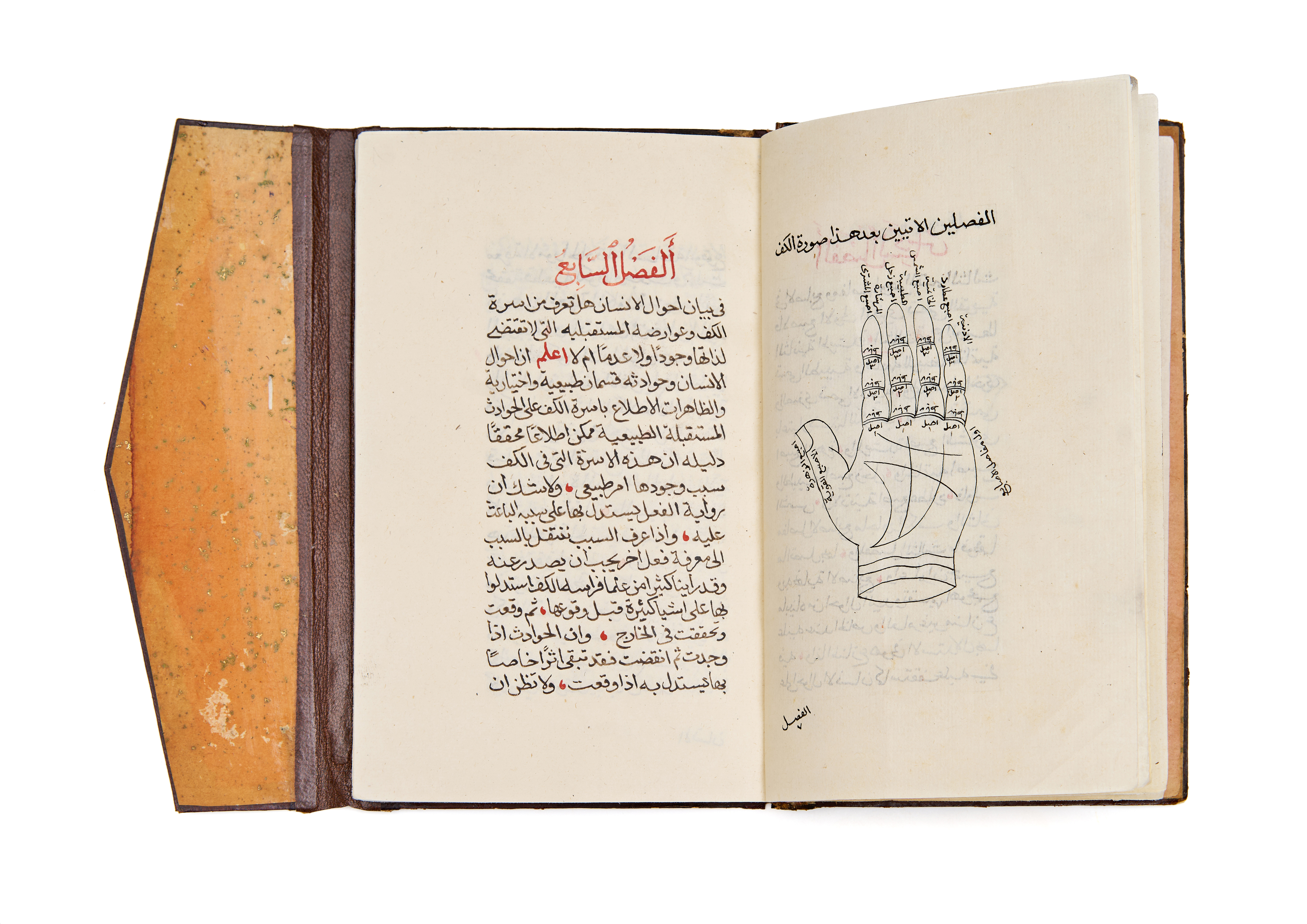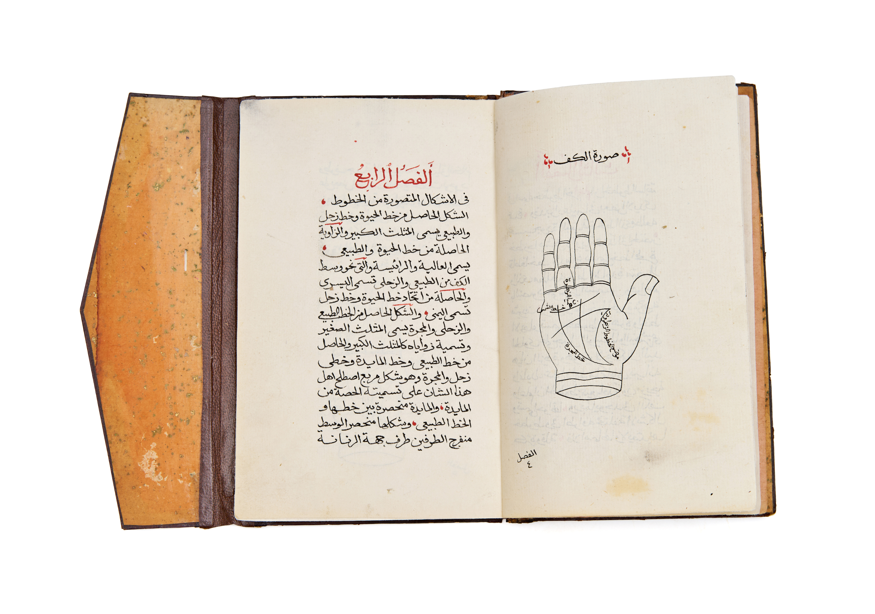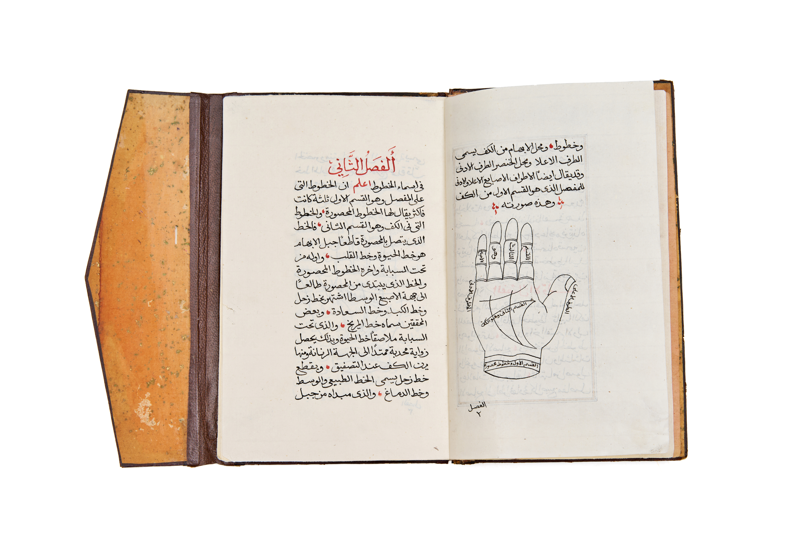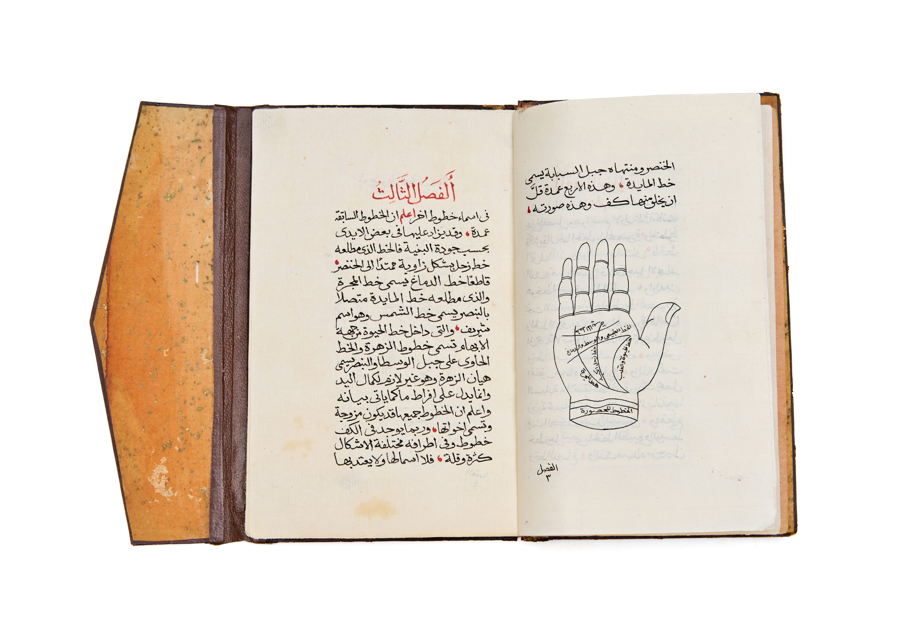 A rare and beautifully preserved 1629 illuminated Arabic manuscript on palmistry, originally authored by Fakher al-Deen bin Omar Al-Razi, translated into French by a European orientalist, and retranslated into Arabic by Abdul Maseeh Al-Halabi, featuring detailed hand diagrams, ornate calligraphy, and its original leather binding.