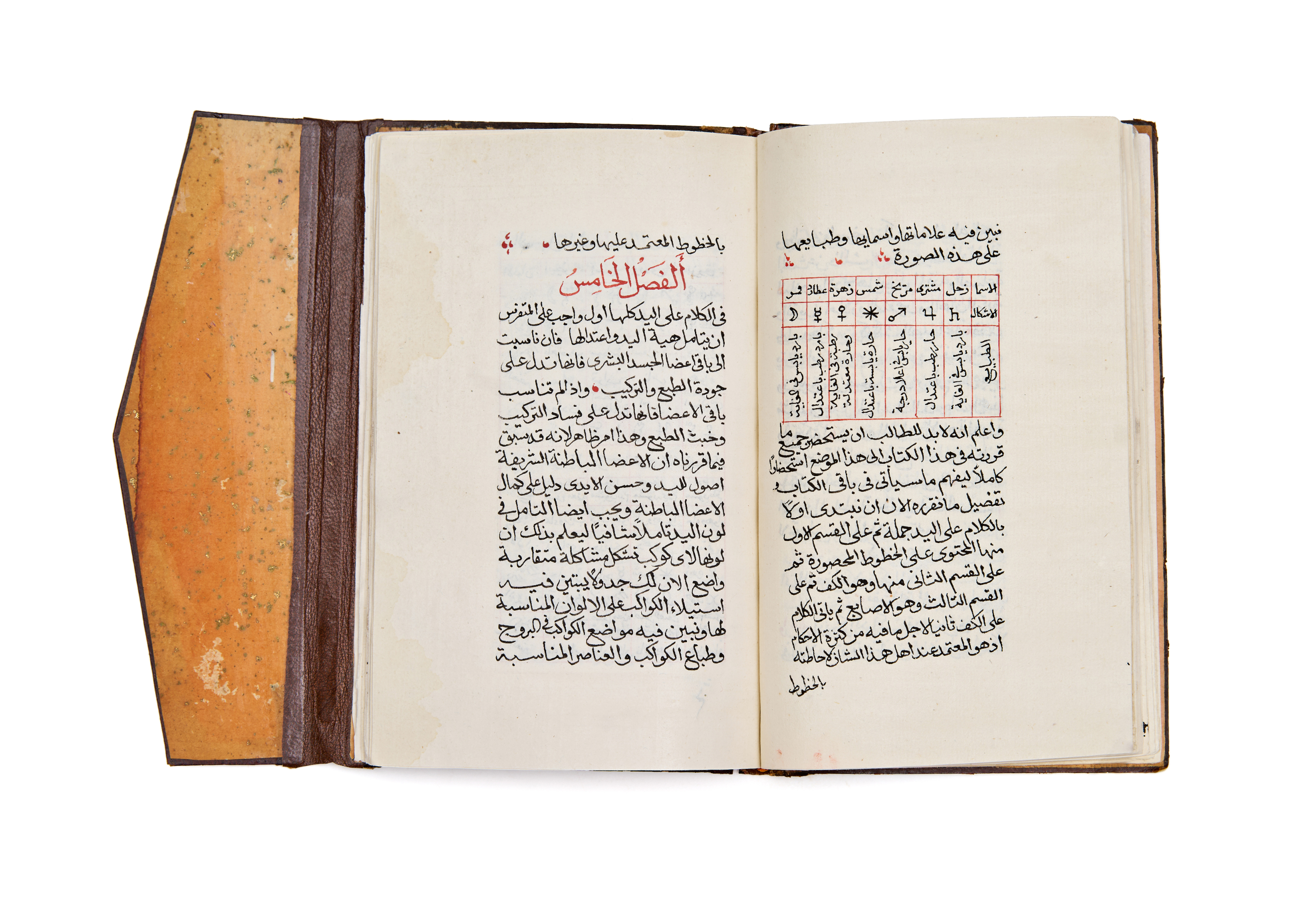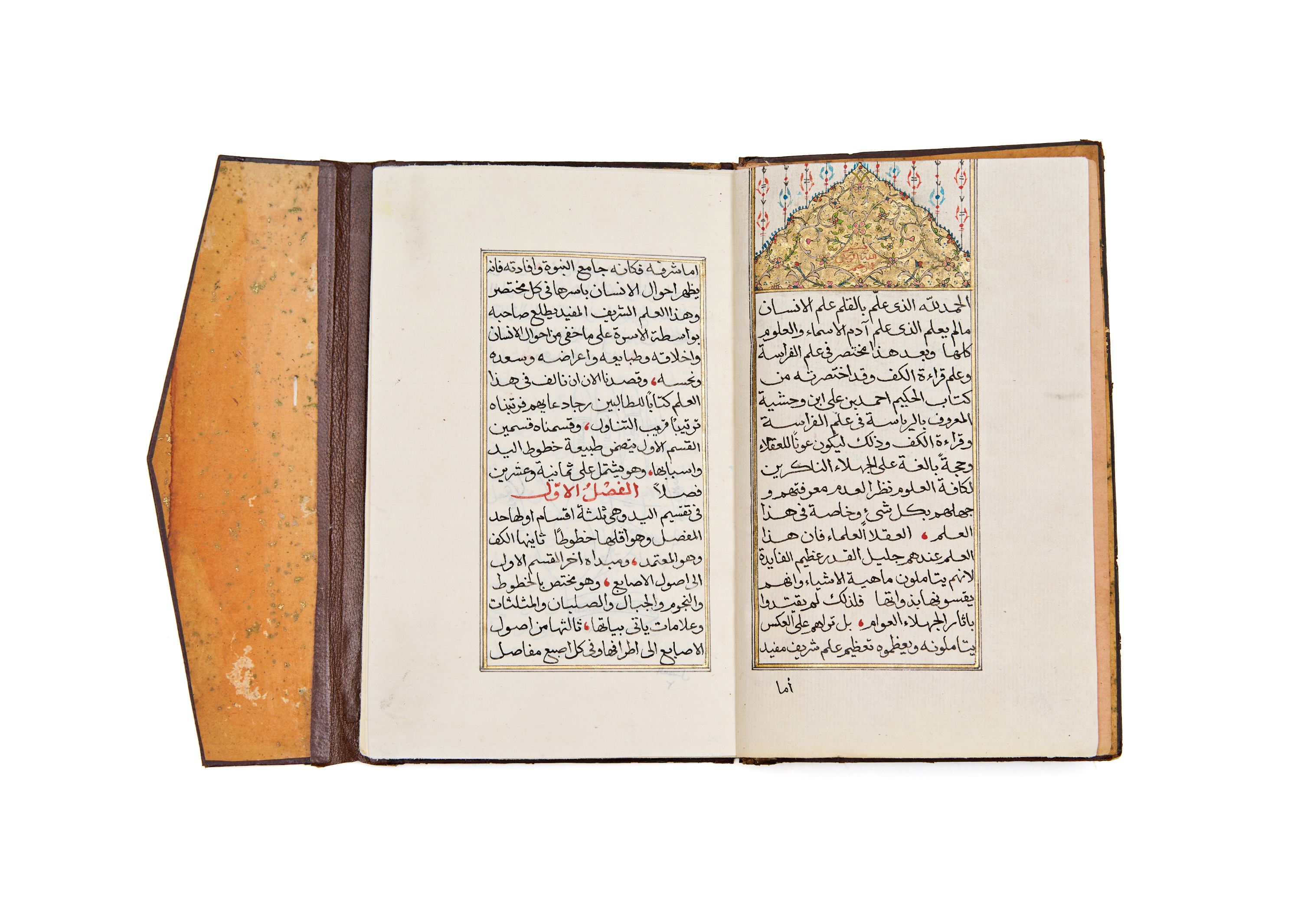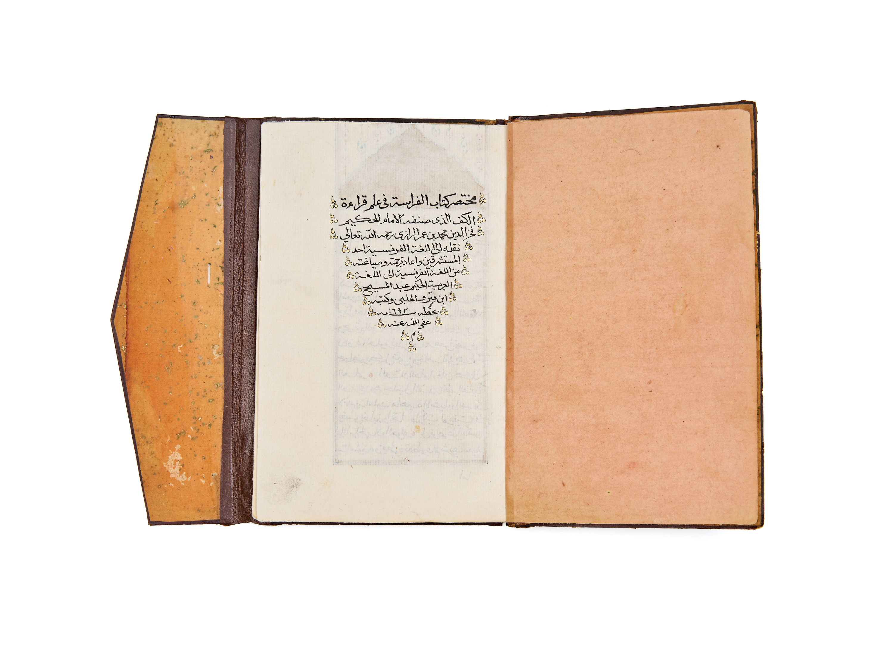 A rare and beautifully preserved 1629 illuminated Arabic manuscript on palmistry, originally authored by Fakher al-Deen bin Omar Al-Razi, translated into French by a European orientalist, and retranslated into Arabic by Abdul Maseeh Al-Halabi, featuring detailed hand diagrams, ornate calligraphy, and its original leather binding.