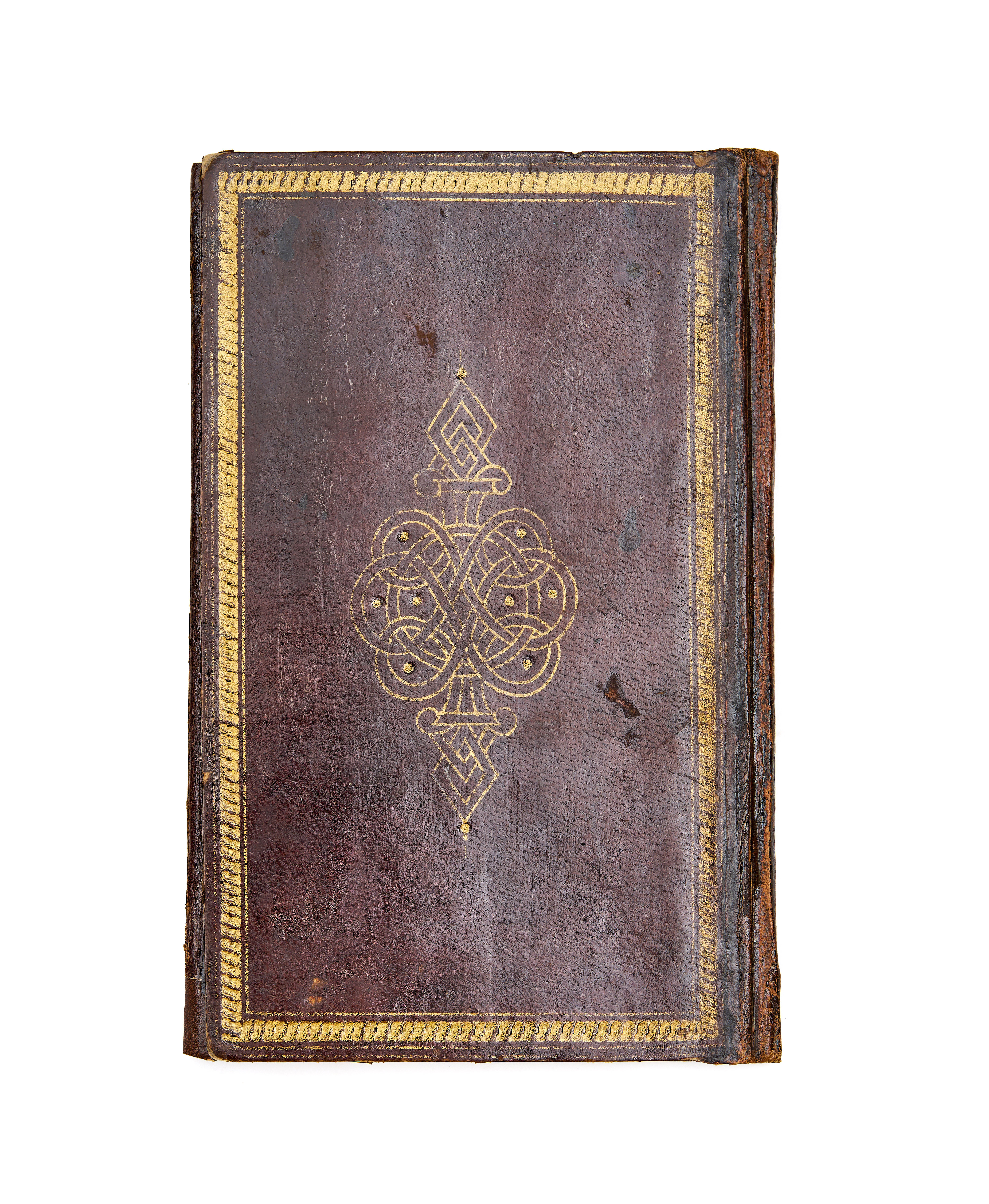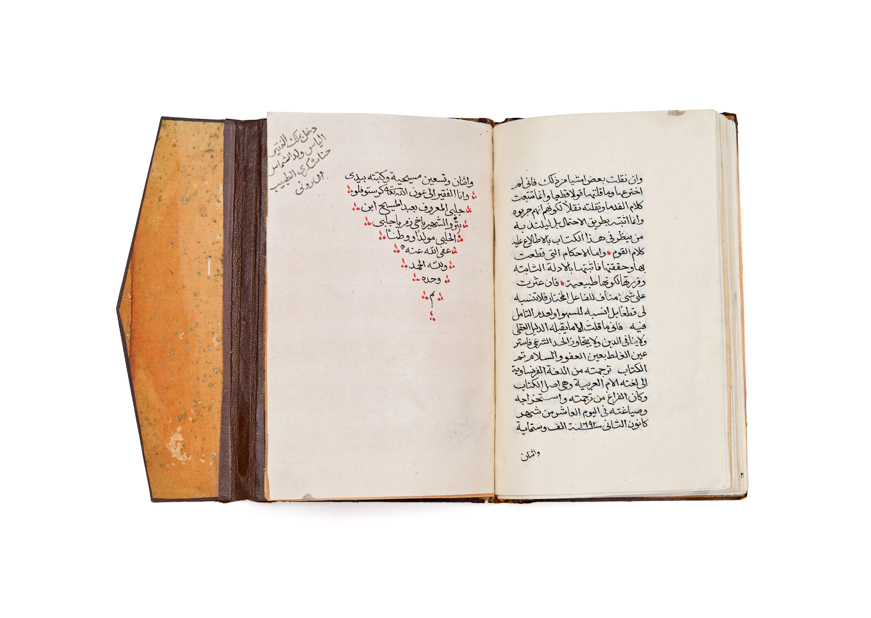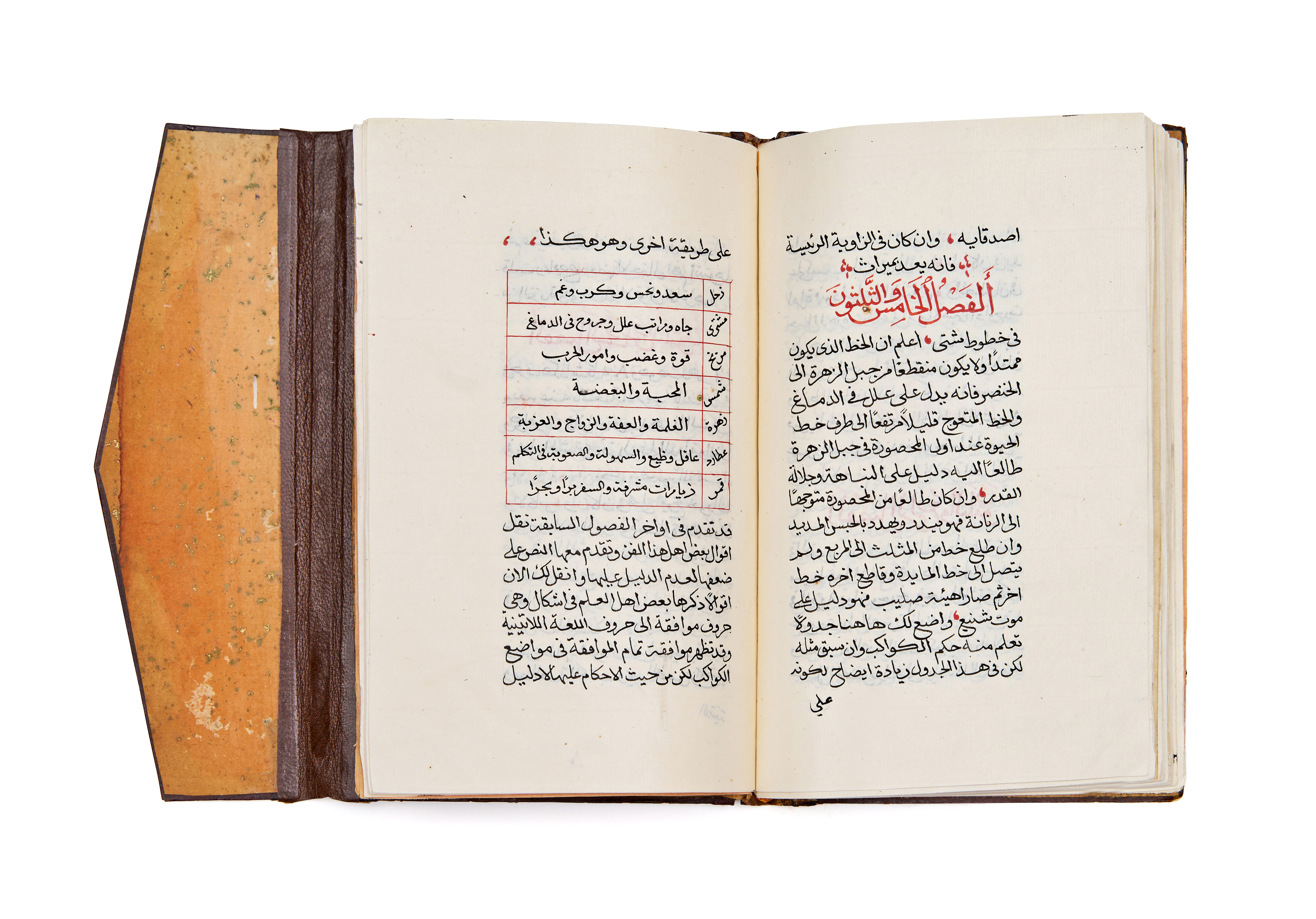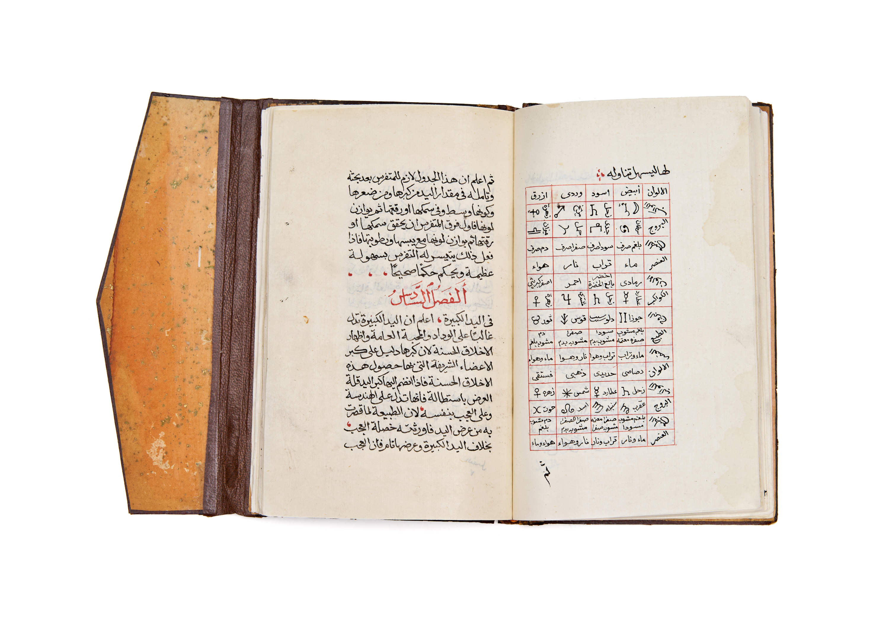A rare and beautifully preserved 1629 illuminated Arabic manuscript on palmistry, originally authored by Fakher al-Deen bin Omar Al-Razi, translated into French by a European orientalist, and retranslated into Arabic by Abdul Maseeh Al-Halabi, featuring detailed hand diagrams, ornate calligraphy, and its original leather binding.