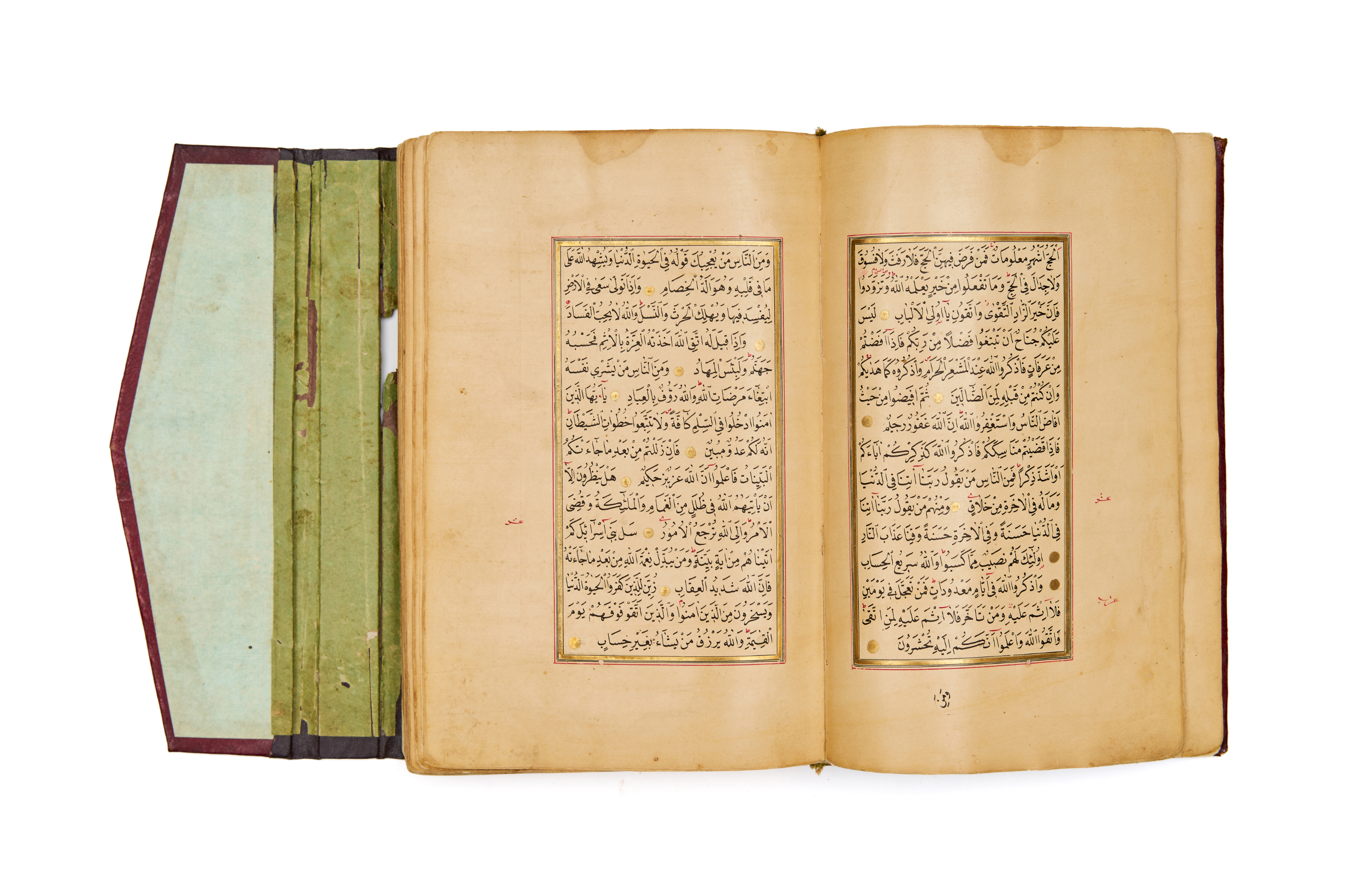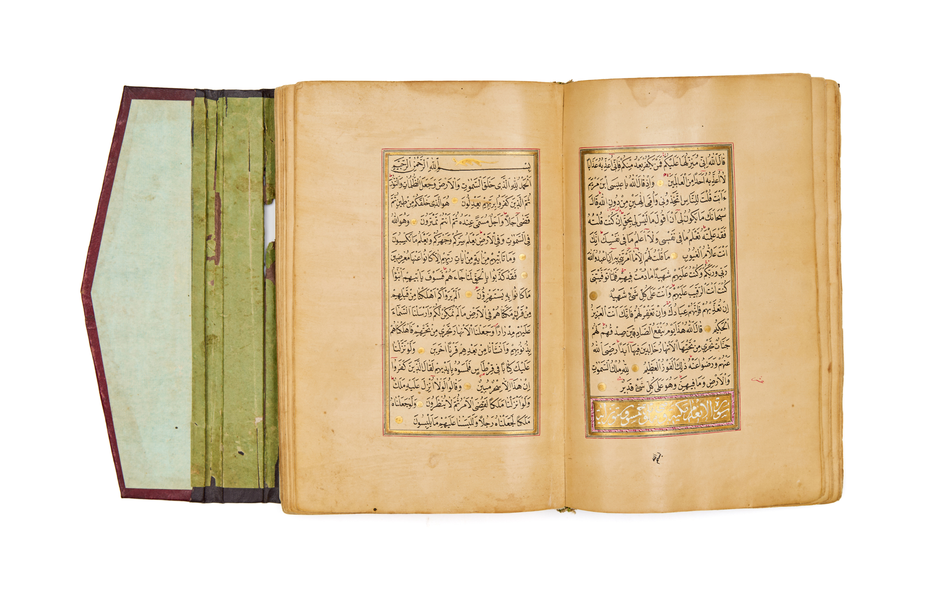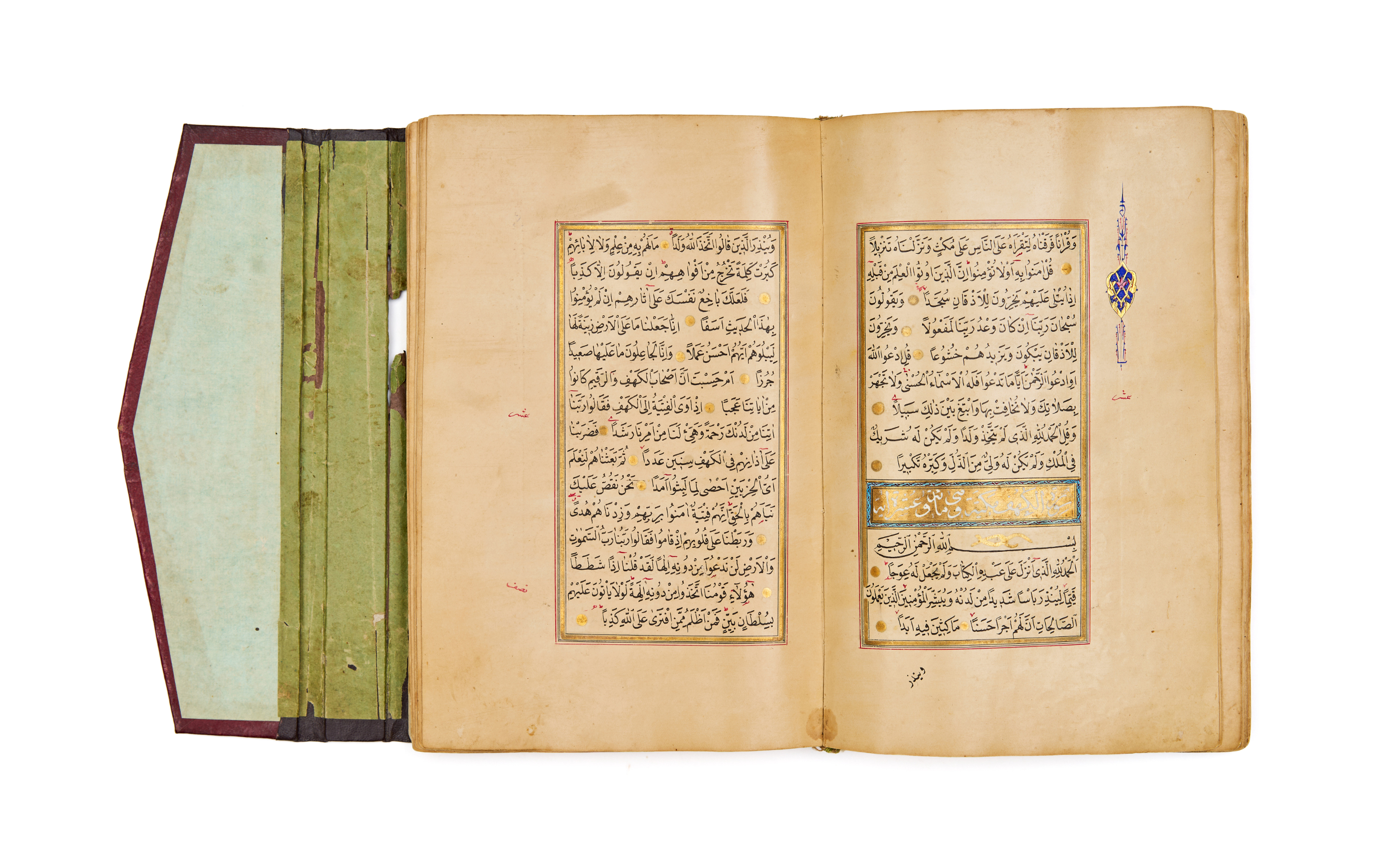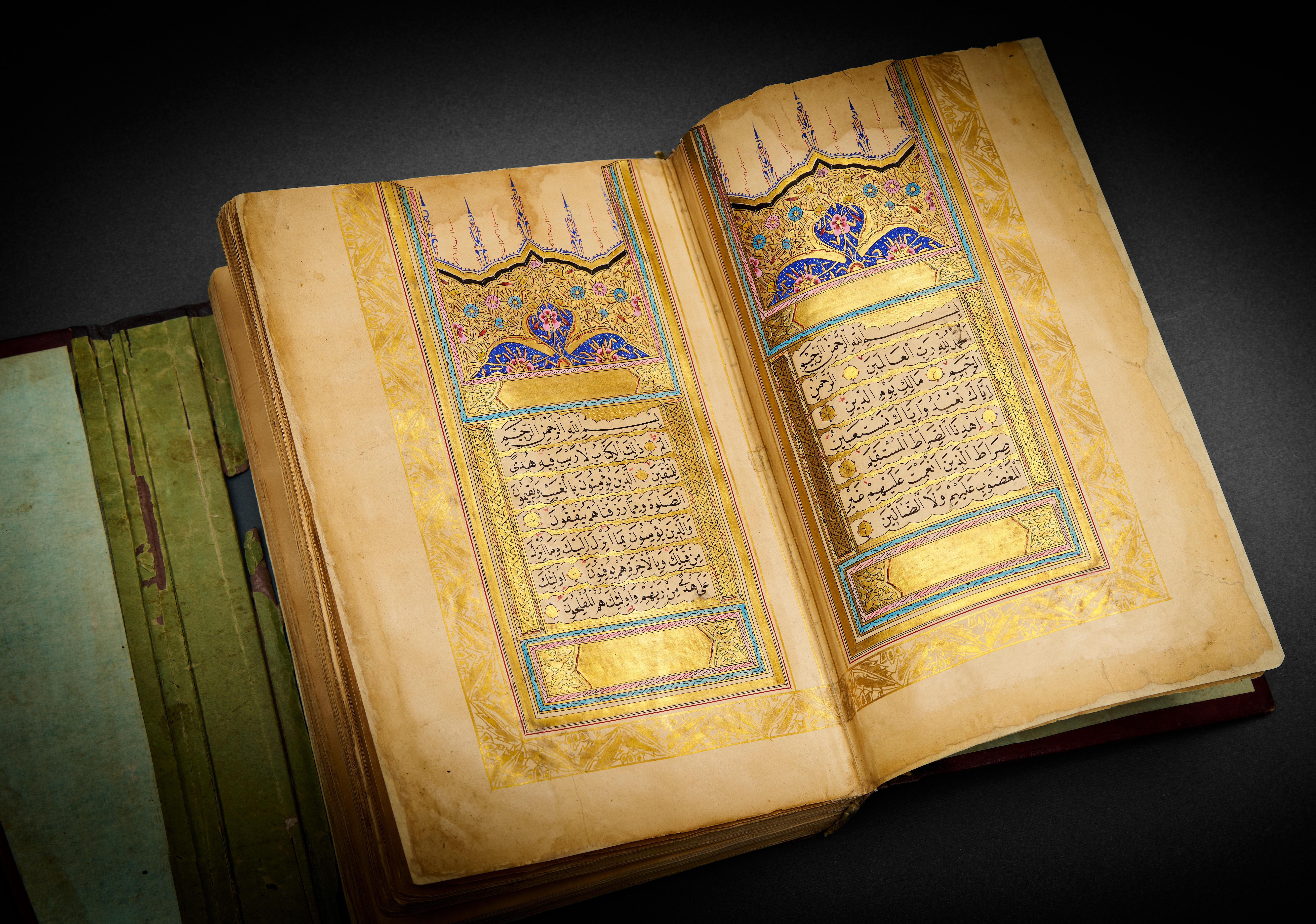 The opening bifolio is lavishly illuminated with vibrant arabesque and floral motifs in gold, lapis, and turquoise hues, setting a regal tone for the manuscript. Throughout the Quran, finely executed gold verse separators, elegant rubrication, and meticulously spaced text in black naskh script reflect both aesthetic beauty and precise scholarship.