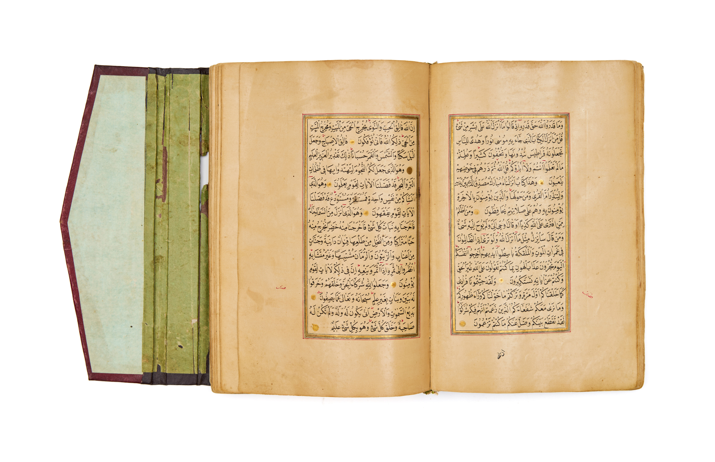 The manuscript is preserved in its original Ottoman leather binding with a fore-edge flap, and inner boards lined in hand-colored green paper, typical of mid-19th century Ottoman craftsmanship. The pages show signs of age and devotional use, consistent with manuscripts of this type, but the artwork and text remain exceptionally well-preserved.