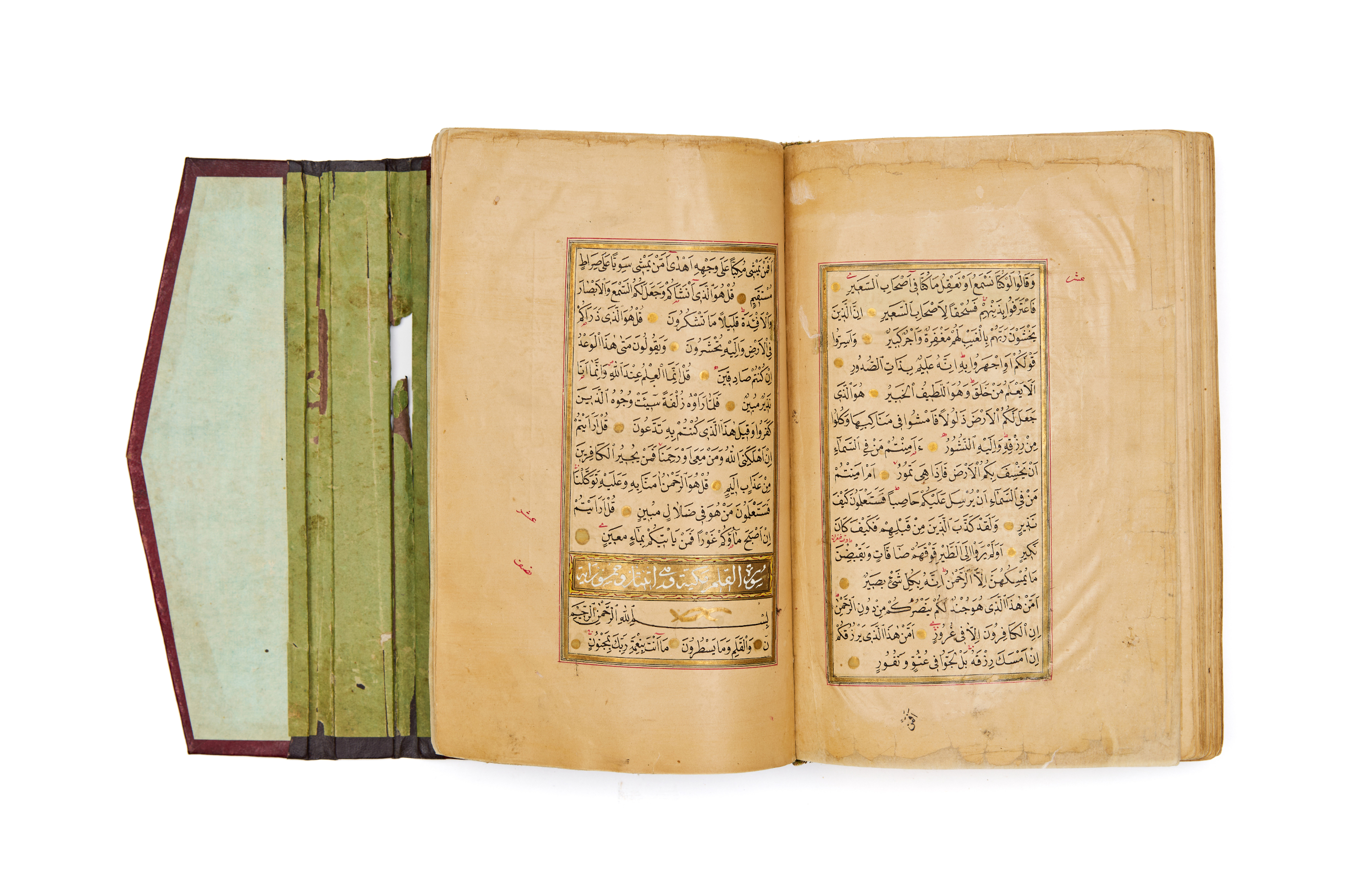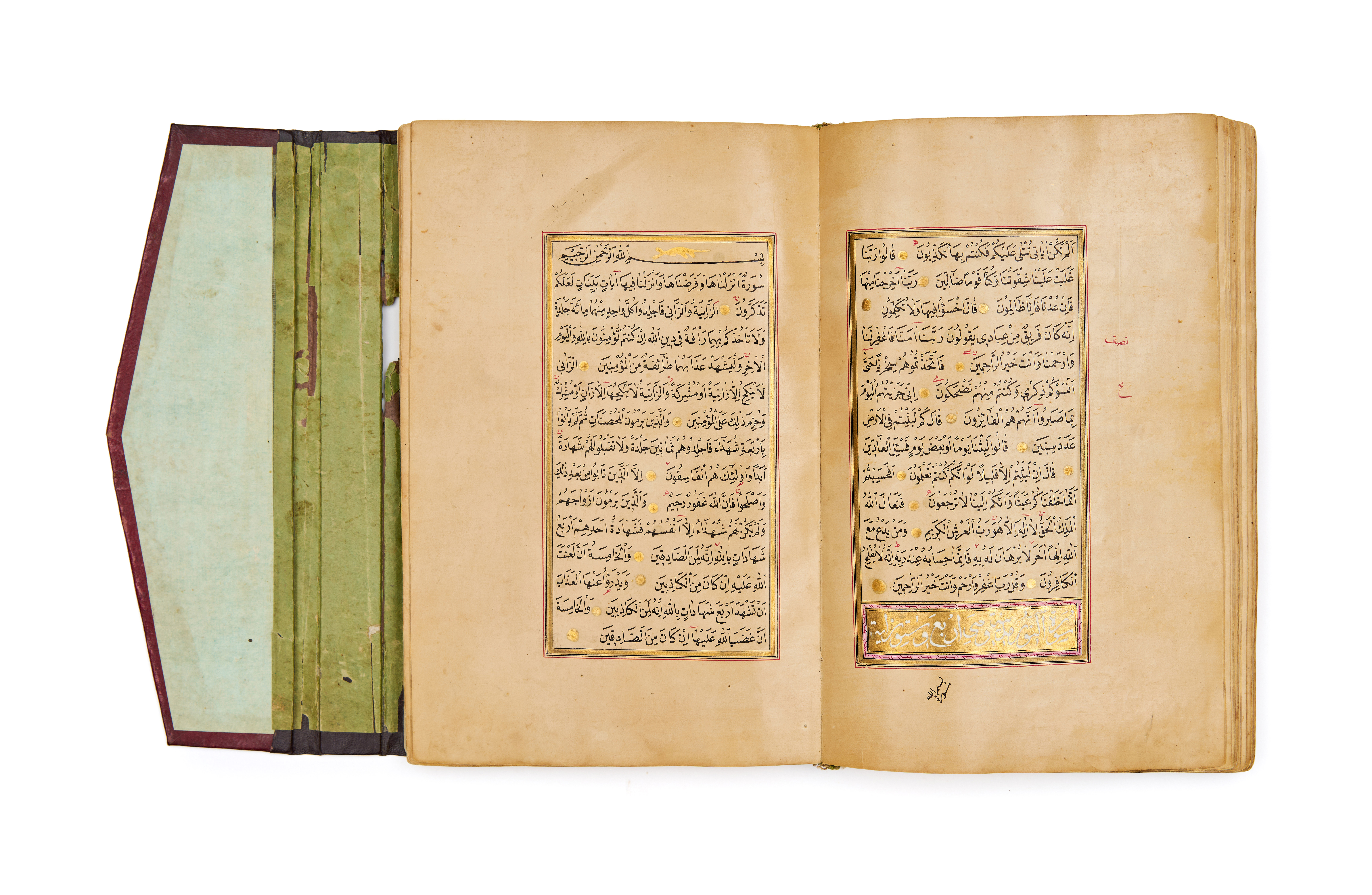 Several folios are enhanced with gilded surah headings and decorative panels, while the final pages exhibit classic Ottoman marginal layout with geometric and vegetal ornamentation, denoting a high-quality commission likely intended for an elite patron or institutional use.