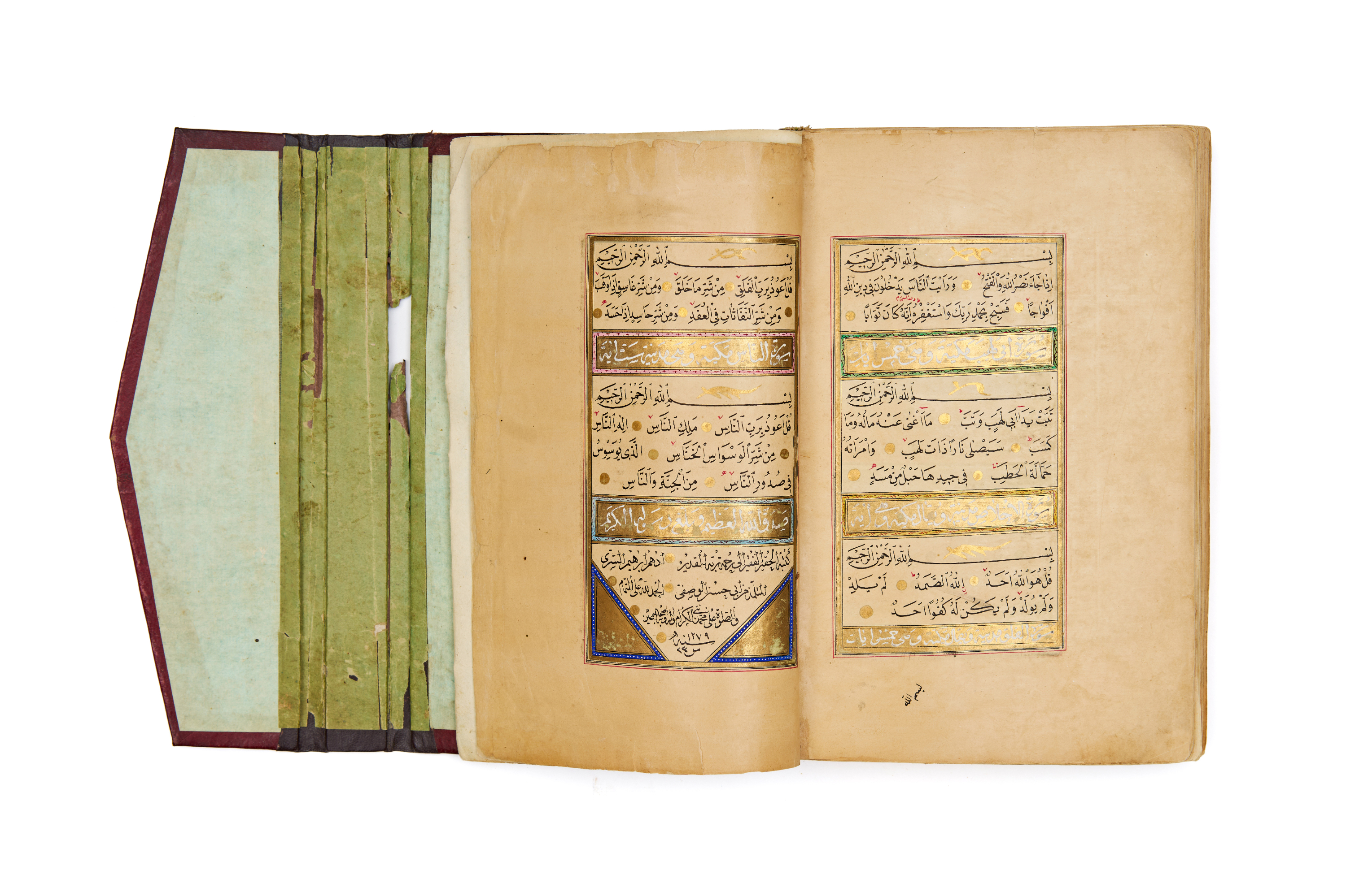 This exceptional Ottoman Quran is a magnificent example of 19th-century Islamic manuscript production, dated 1279 Hijri (1862 AD) and signed by the accomplished scribe Adham Ibrahim AlSury. A manuscript of both devotional and artistic significance, it showcases the height of Ottoman calligraphic and illuminative traditions.