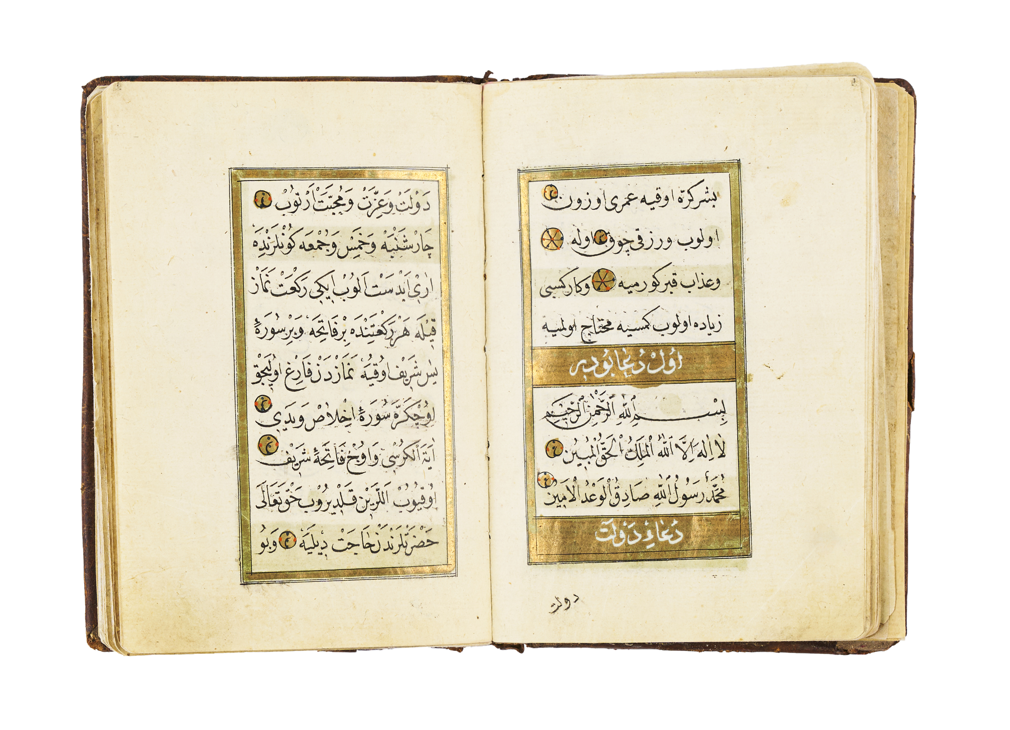 BOOK OF PRAYS AND VERSES FROM THE QURAN, SIGNED MOHAMMED AMIN ALRUSHDY, AH 1210, 1795 A.D