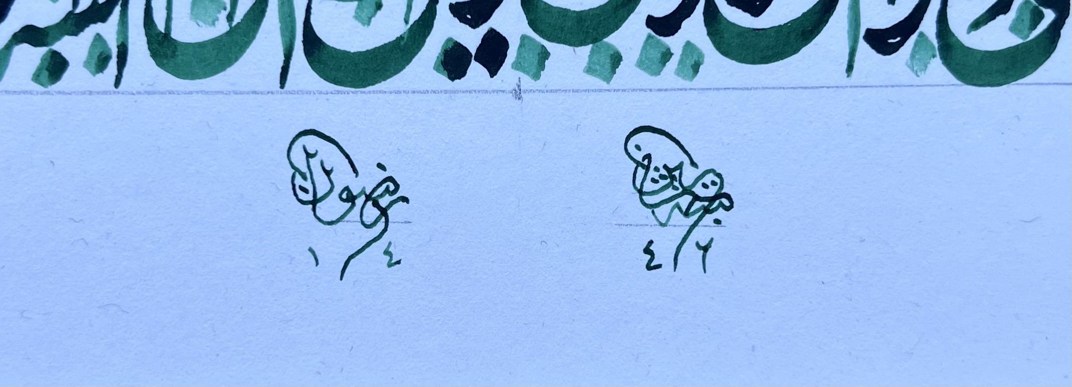 The style of calligraphy uses movement to represent the fast-flowing nature of the struggle humans go through. The inks are made from crushing Lapis Lazuli to make the blue ink and Emeralds to produce the green ink.