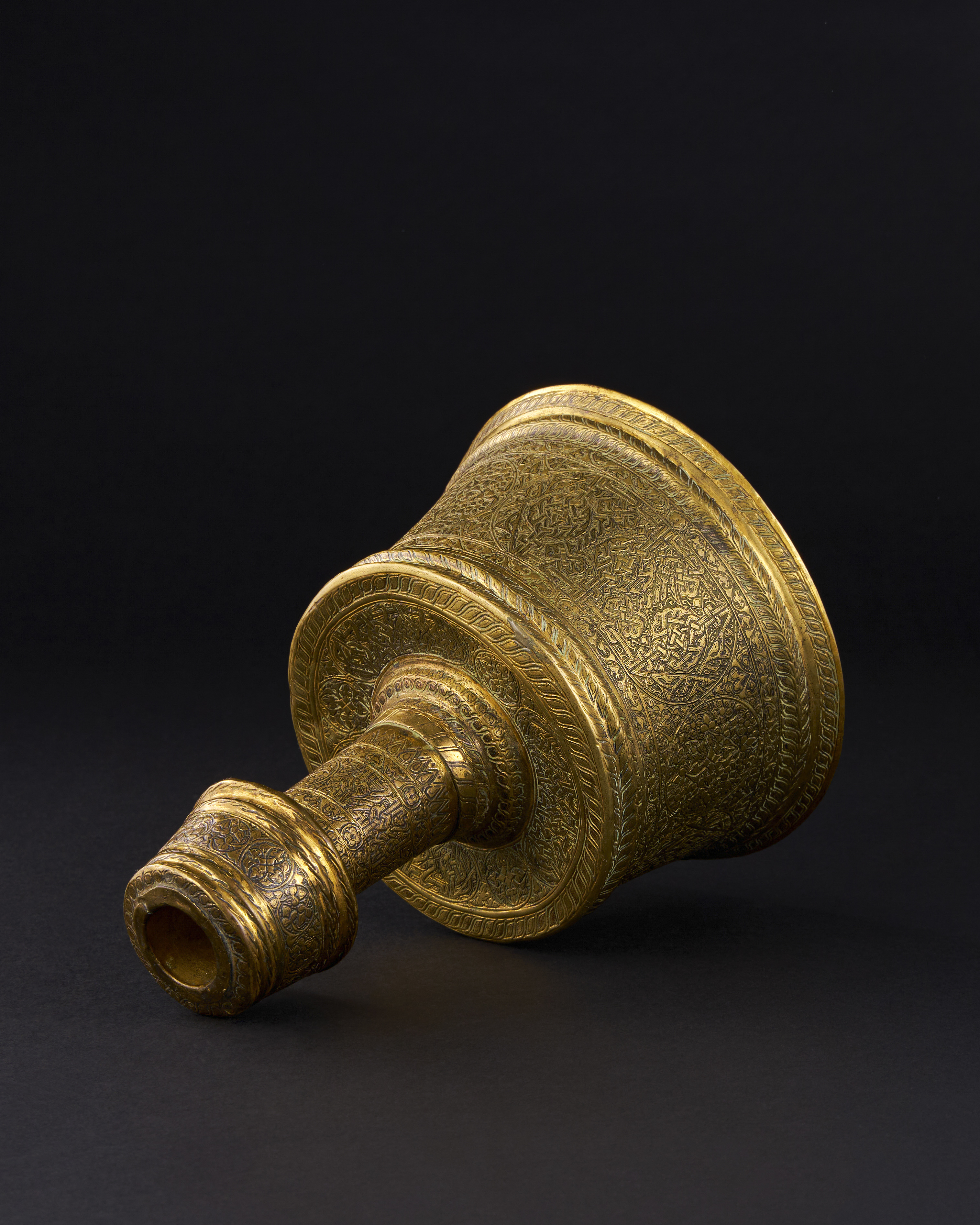 The straight stem with tapering mouth rising from a truncated conical body with flat shoulders, the engraved decoration with cartouches of tightly interlocking straps and knots, interspersed with radiating quatrefoils within roundels on a dense foliated ground between two bands of scrolling tendrils.