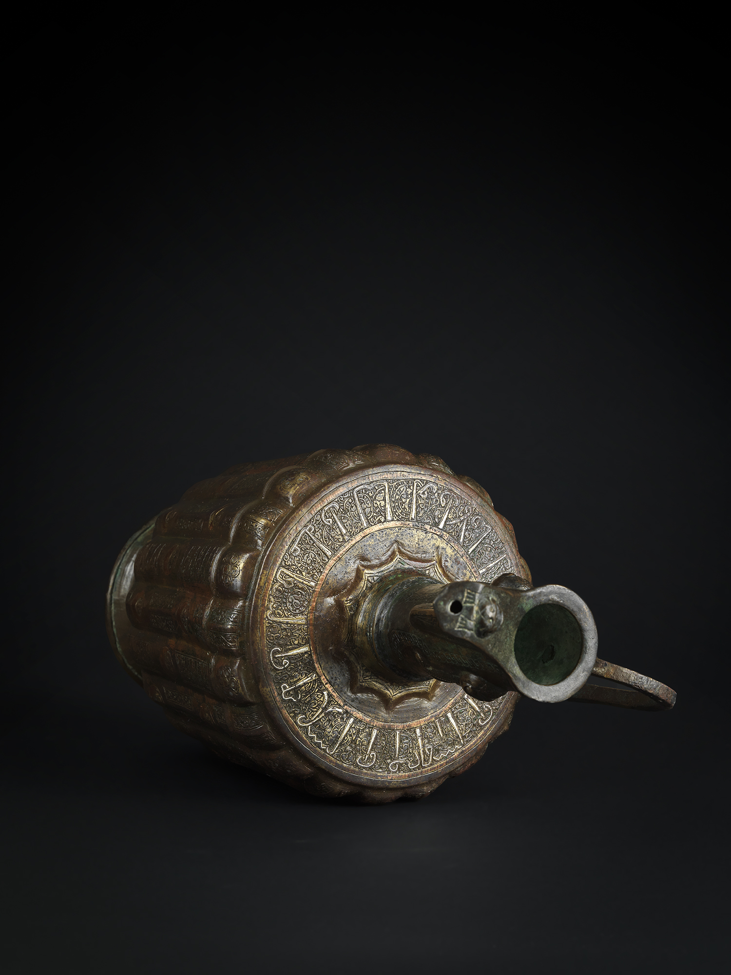 of slightly flaring lobed form on a splayed foot, wide shoulder and long neck with spout, simple handle, engraved and inlaid in silver and copper with alternating inscription-filled cartouches interspersed by roundels overlaid with vegetal motifs, and cartouches filled with undulating vines interspersed by almond medallions overlaid with vegetal motifs, the shoulder with a band of inscription on a ground of scrolling vines, the foot with a band of cable design, the neck with repoussé lion to each side, surrounded by a band of cable design, the spout with repoussé lion and engraved vegetal and cable decoration.