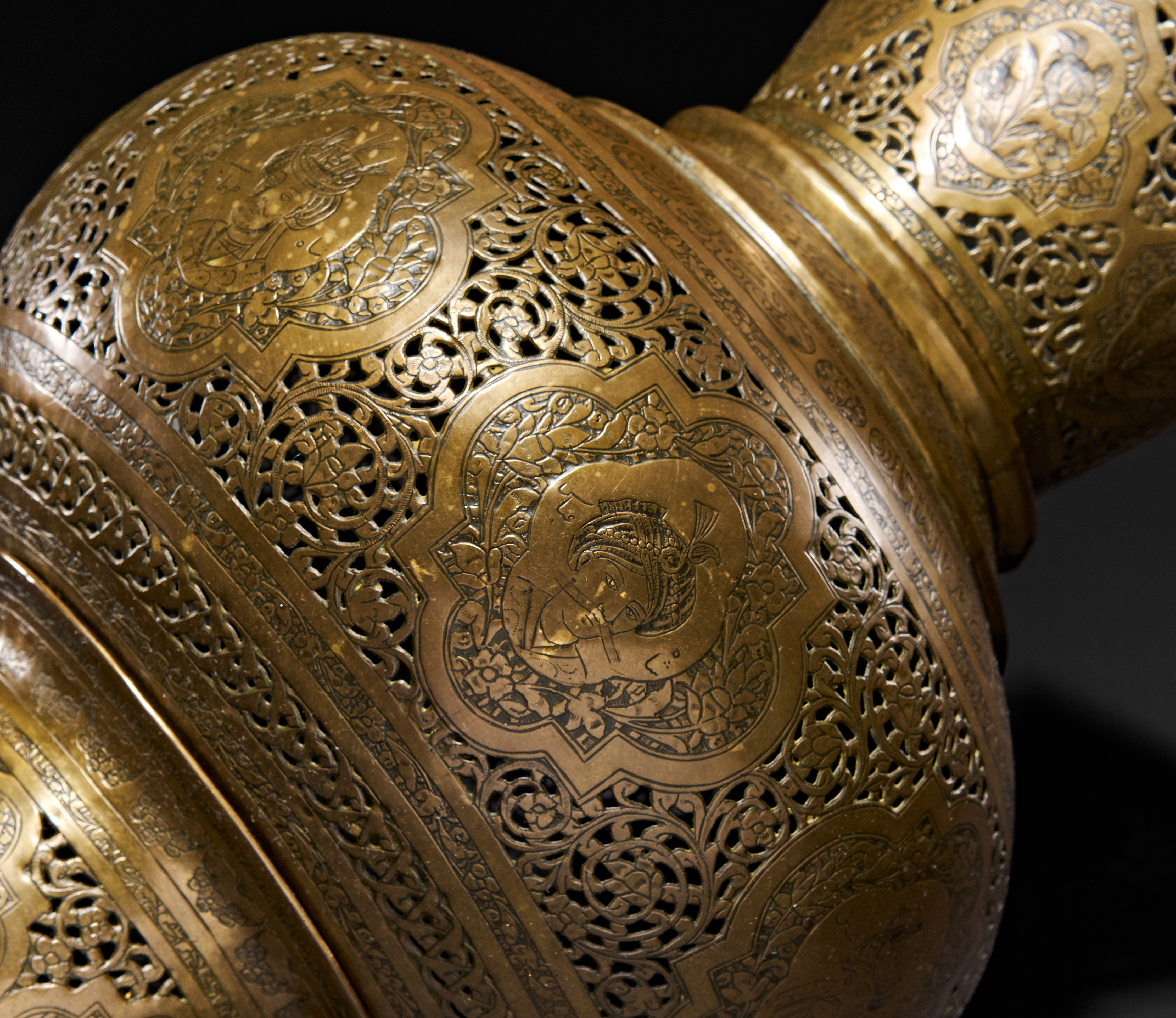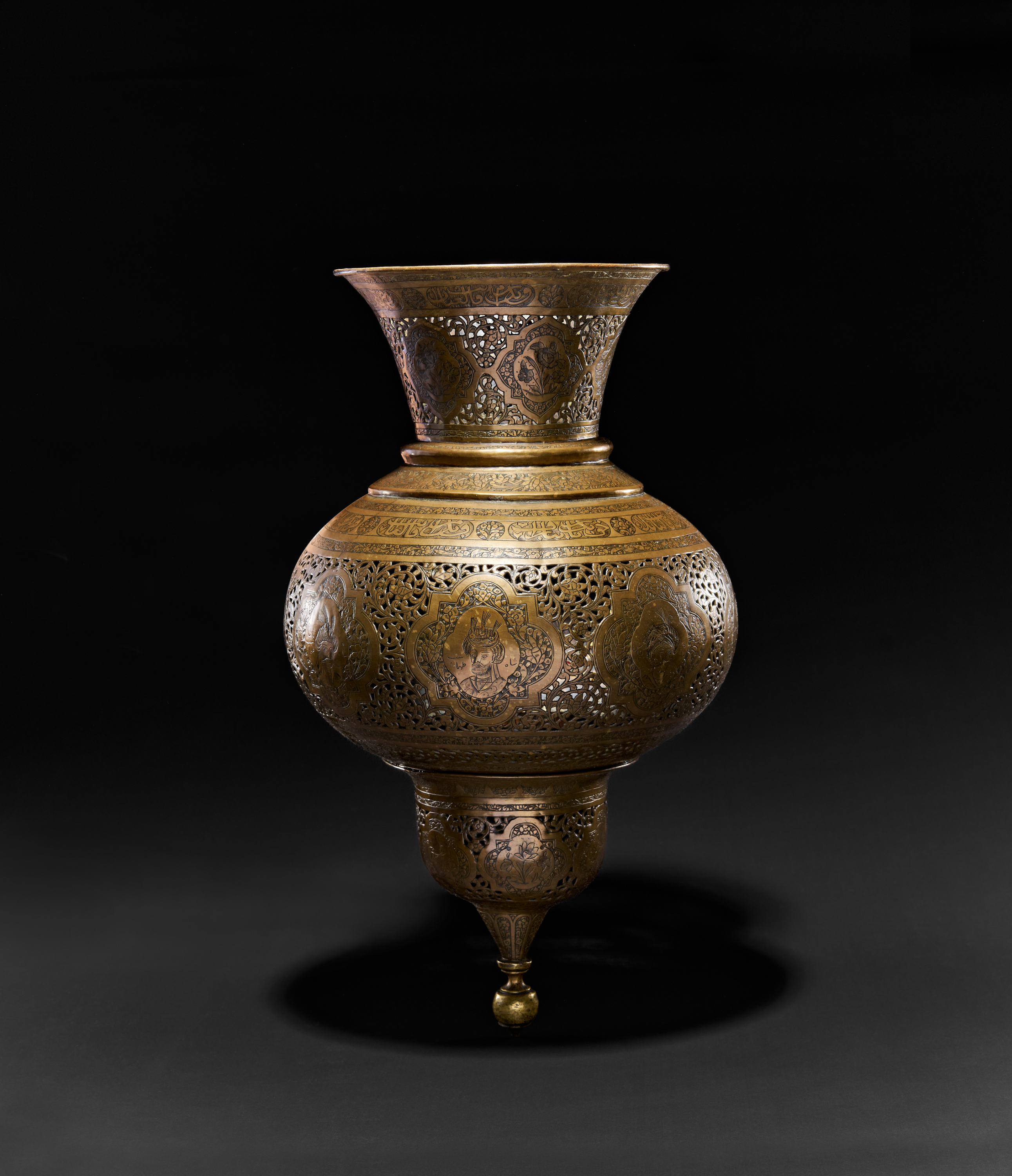 The surface is richly decorated with intricate openwork arabesques and pierced geometric motifs, creating a dynamic play of light when illuminated. Encircling the body and neck are medallions containing finely engraved portraits—highly stylized depictions of ancient Persian kings and nobles, identifiable by their regal headdresses and courtly attire. These busts are framed by floral cartouches and framed within lobed medallions, evoking earlier Safavid artistic traditions while embodying the romantic nationalism of the Qajar era.