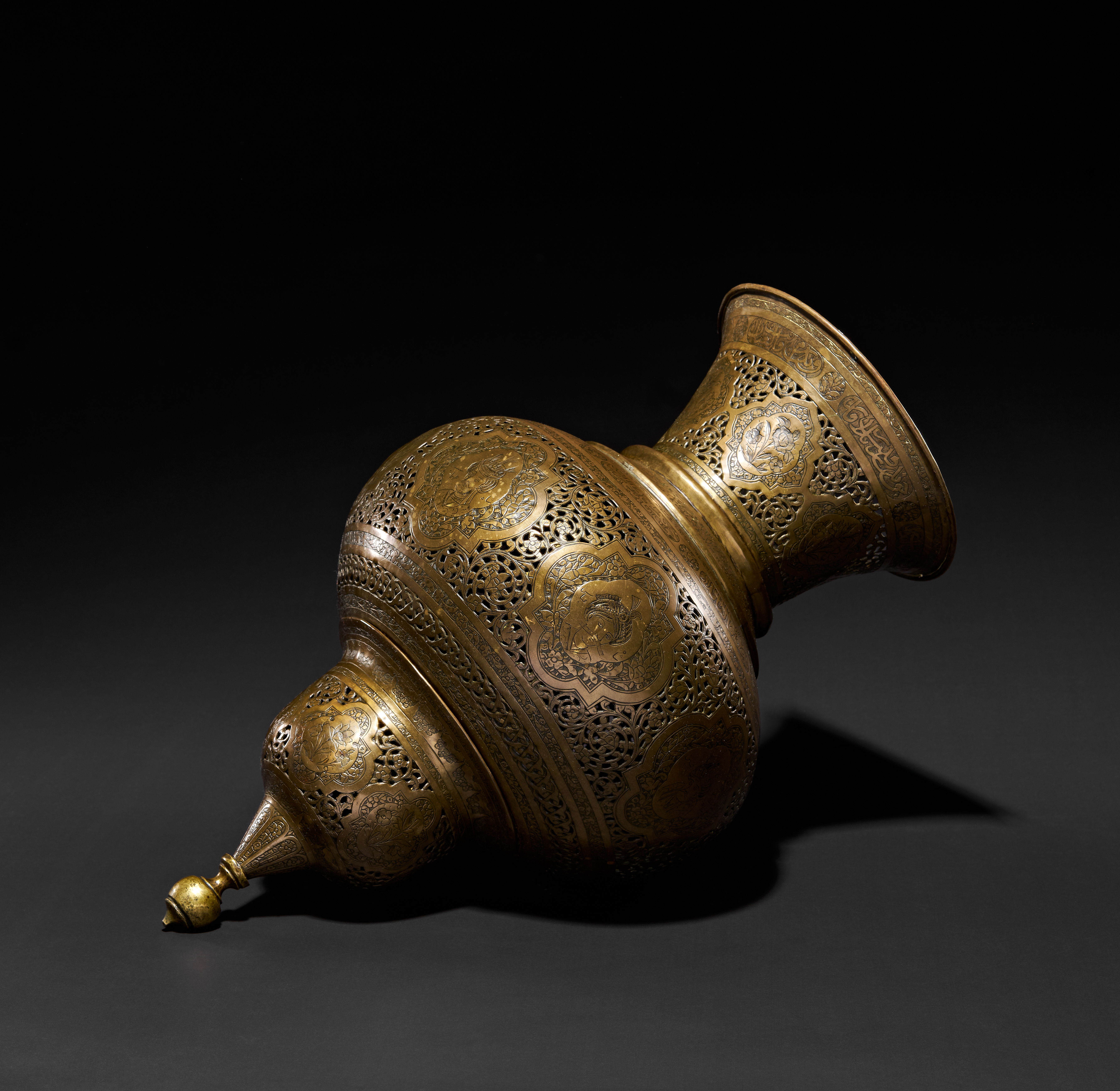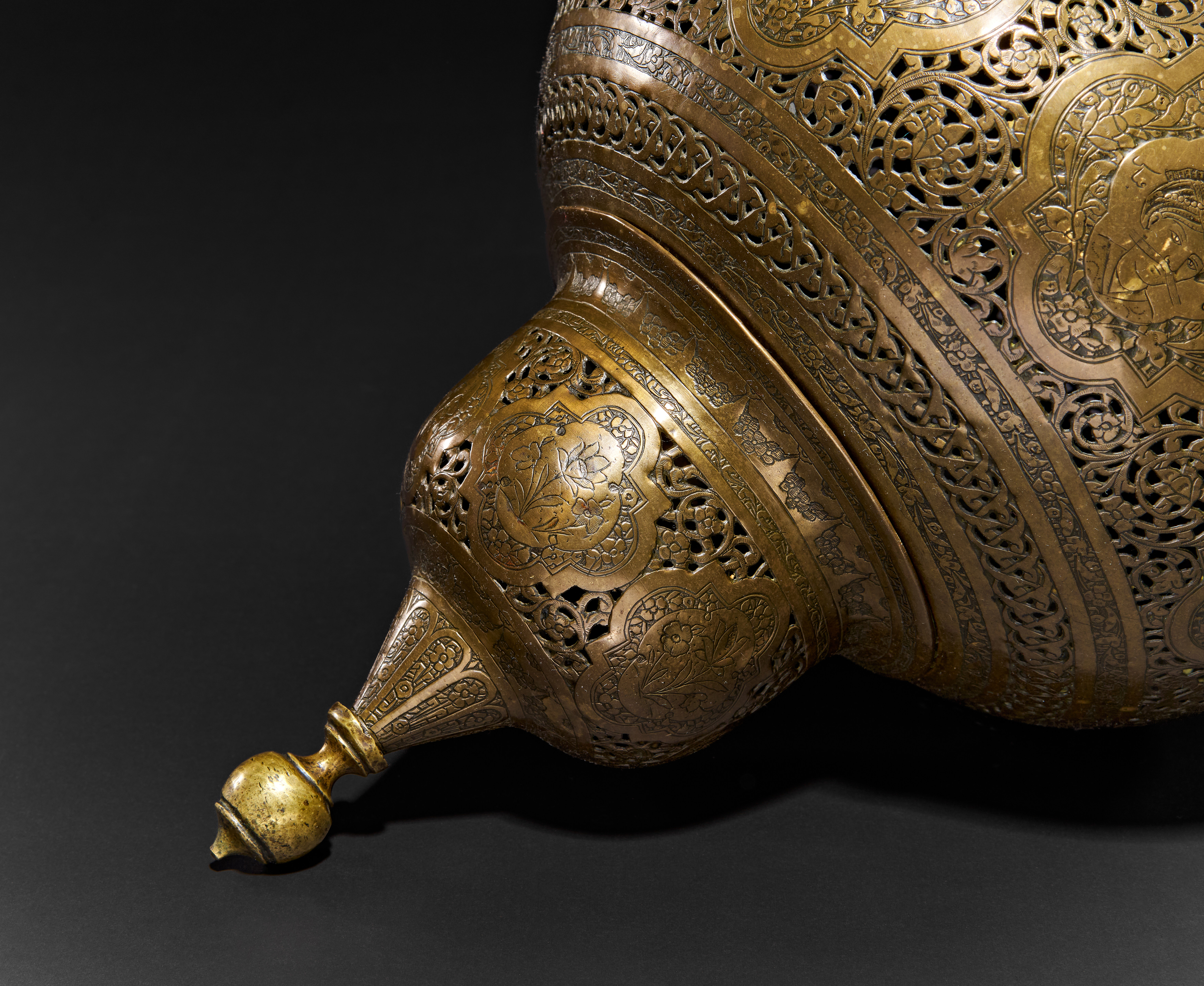 An outstanding example of Qajar-period metalwork, this finely crafted openwork lantern is made from brass and dates to 19th-century Iran. The form is bold and architectural, featuring a bulbous body, tapering neck, flared rim, and pointed finial, all raised on a single rounded foot.