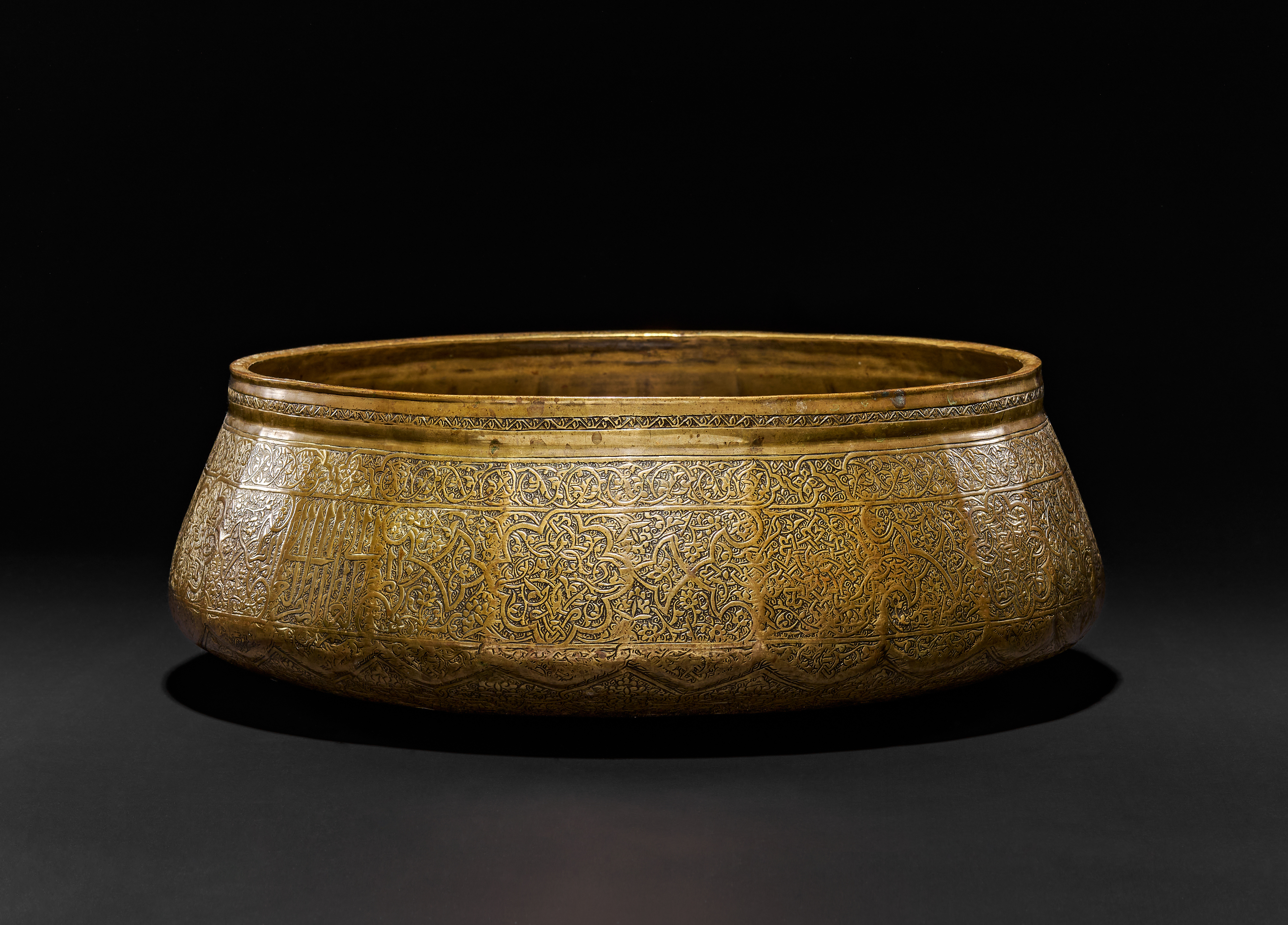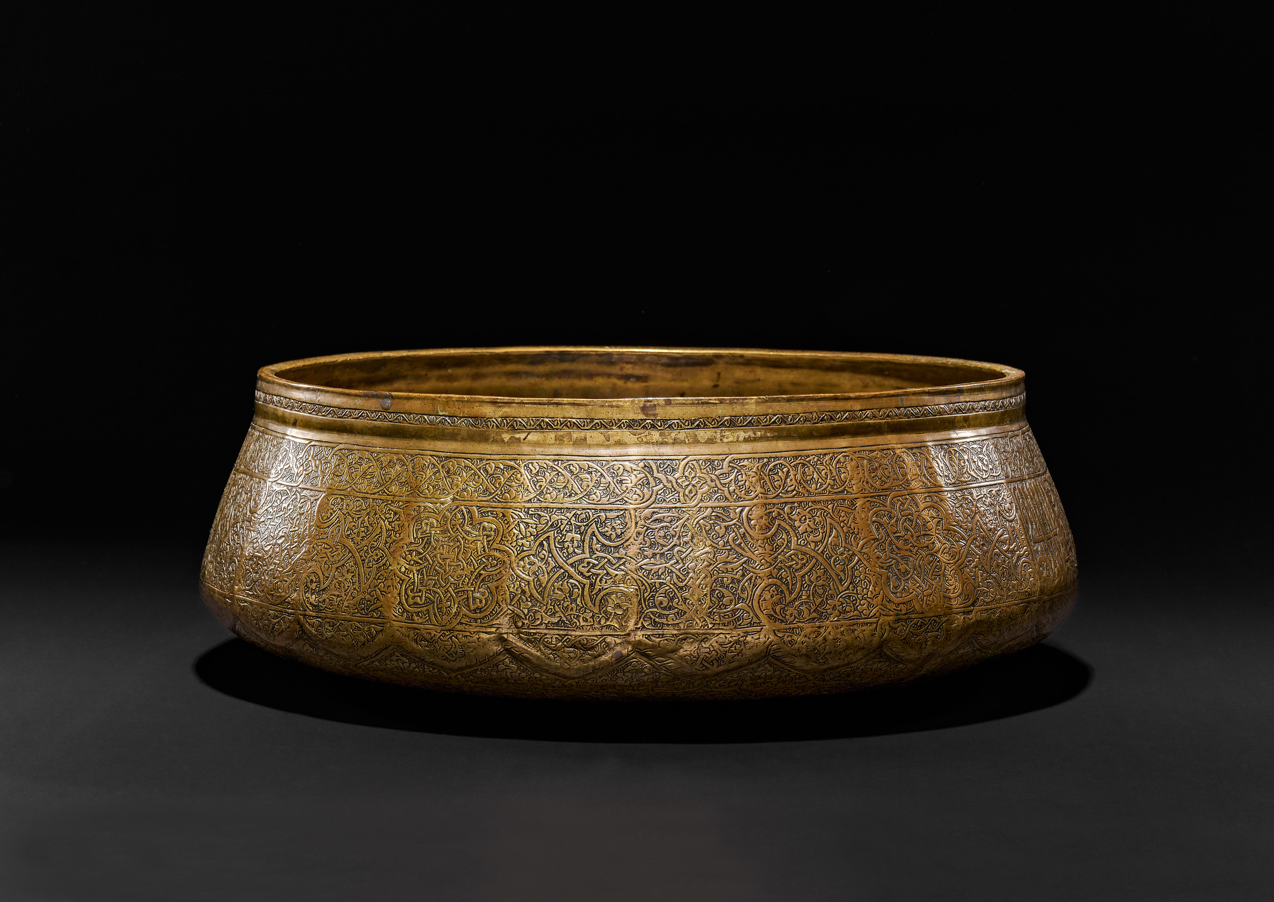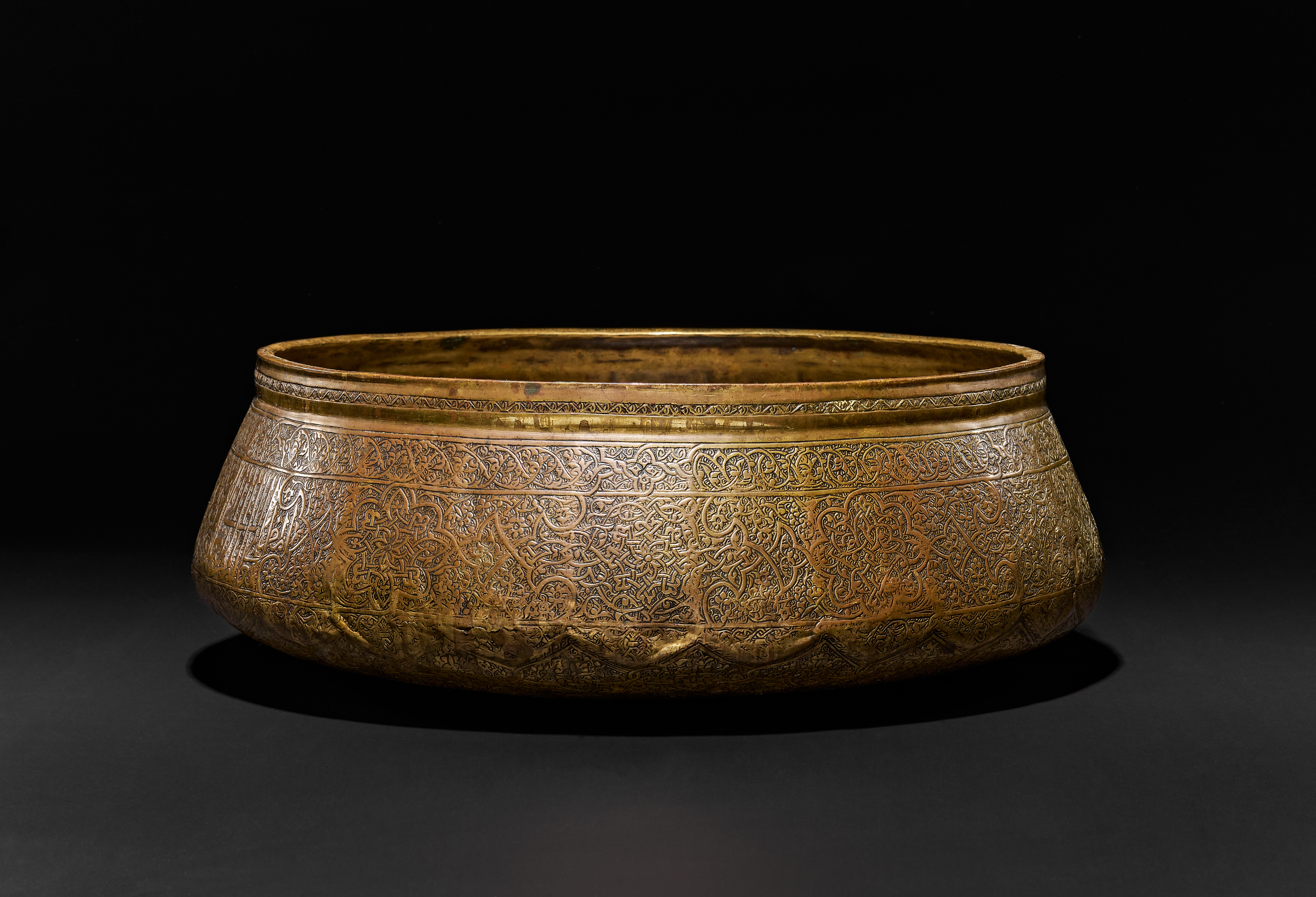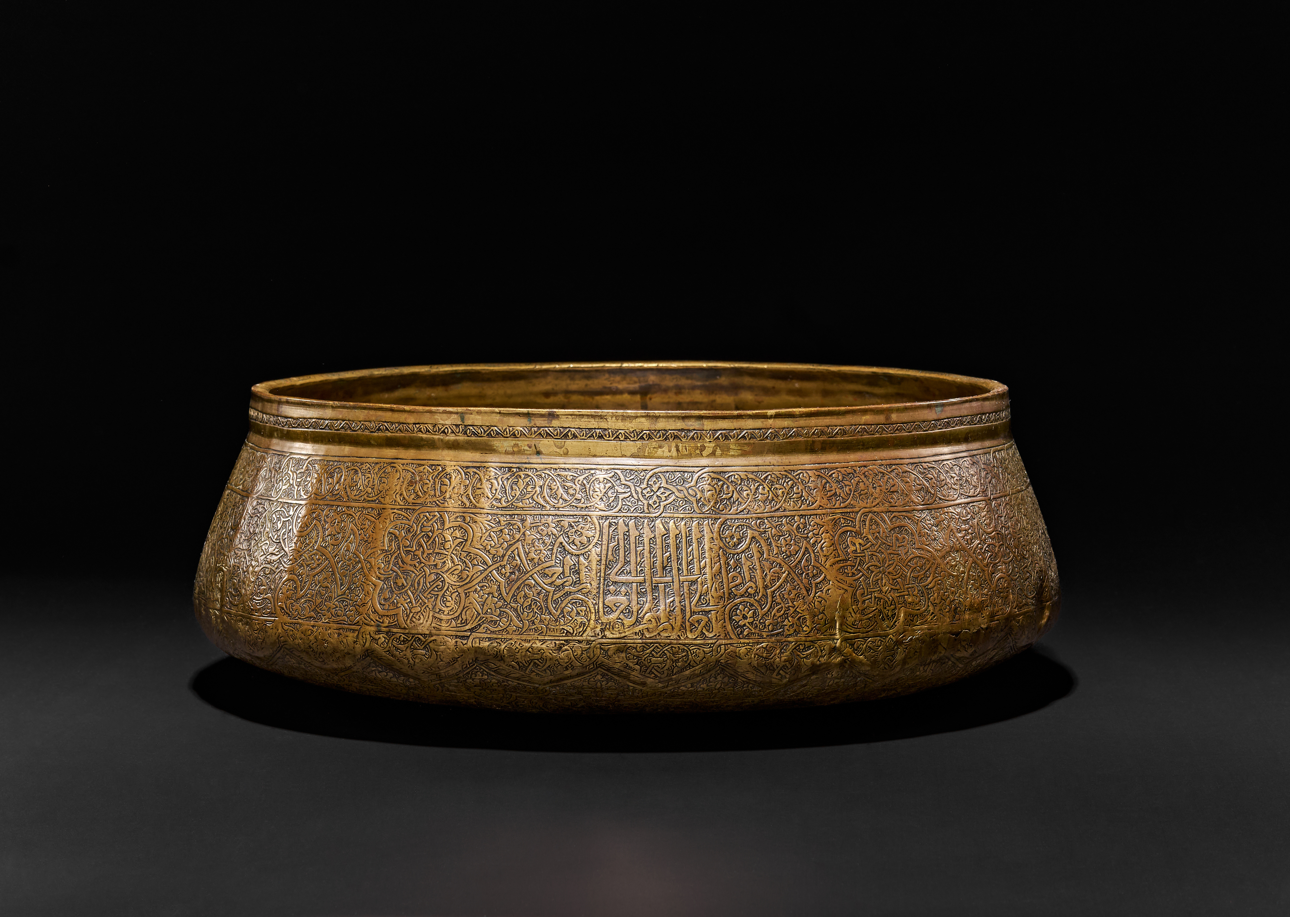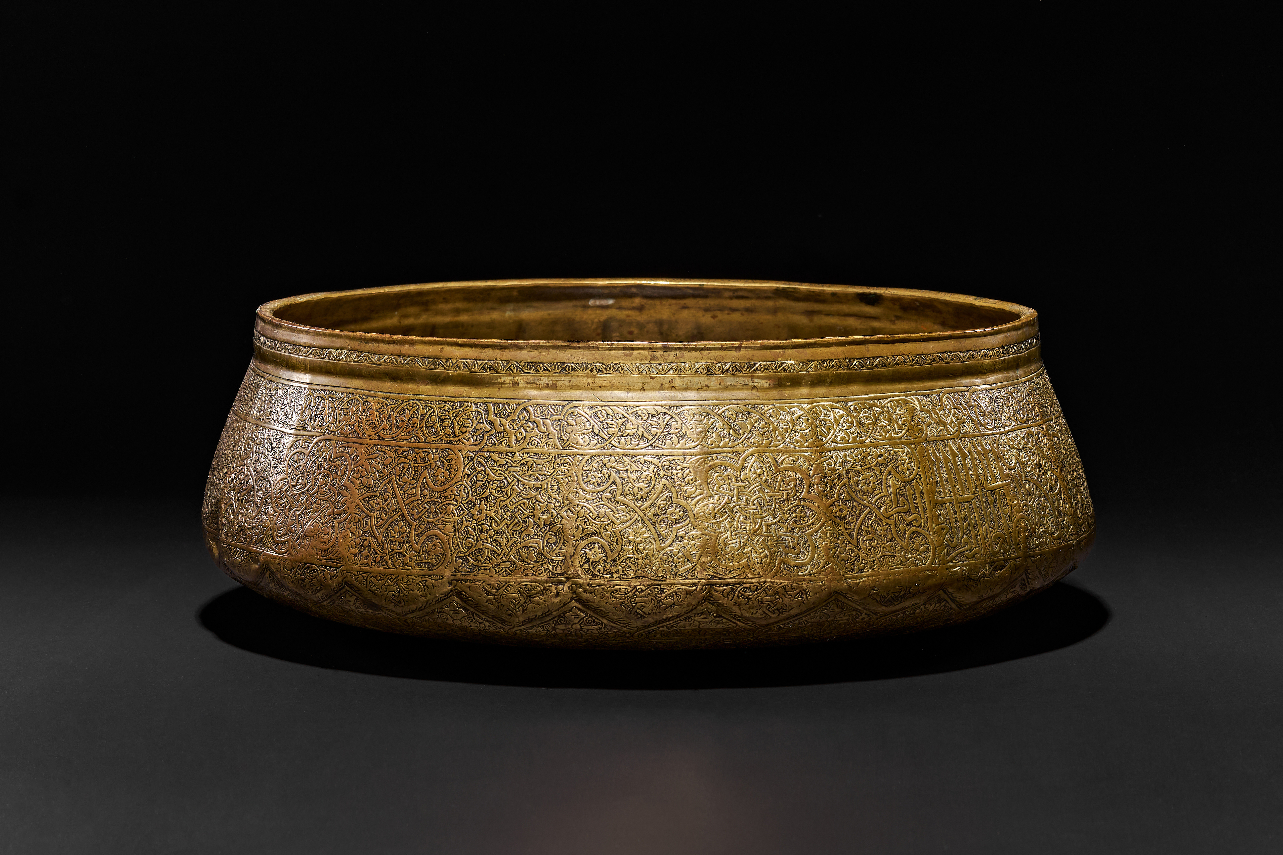This finely crafted Mamluk brass basin dates to the reign of Sultan Al-Ashraf Qaitbay (r. 1468–1496), one of the most prominent sultans of the Burji Mamluk dynasty. A rare and important survivor of late 15th-century Islamic metalwork, the basin exhibits an exceptional level of artistry and craftsmanship associated with the high point of Mamluk decorative arts.