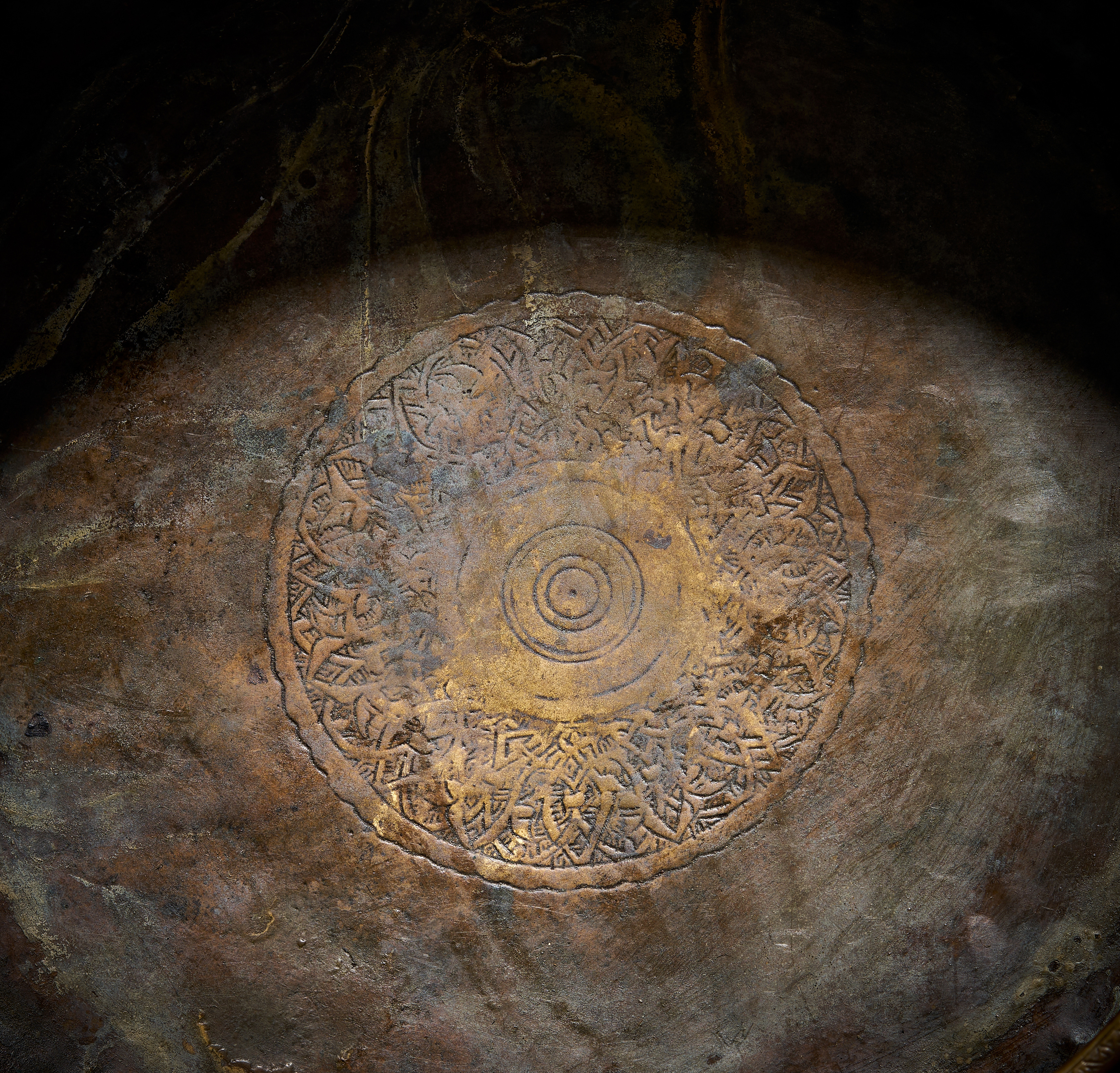 The interior bears a central medallion with concentric inscriptions and vegetal motifs, while the base is fully adorned with a tightly interlaced pattern—demonstrating the Mamluk emphasis on dense, almost architectural ornamentation. The brass has acquired a rich, dark patina, enhancing the contrast of the engraving and reflecting its age and authenticity.