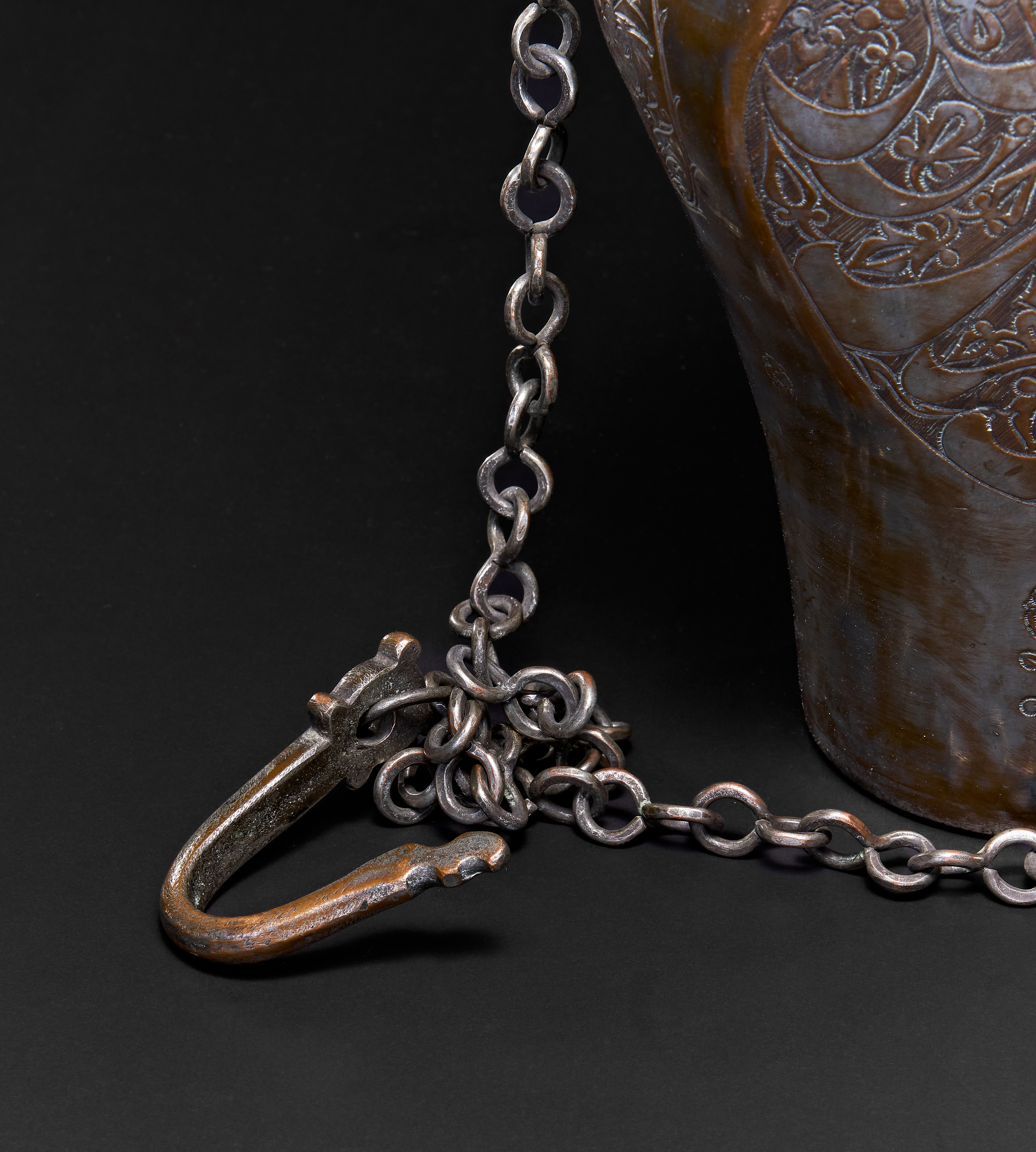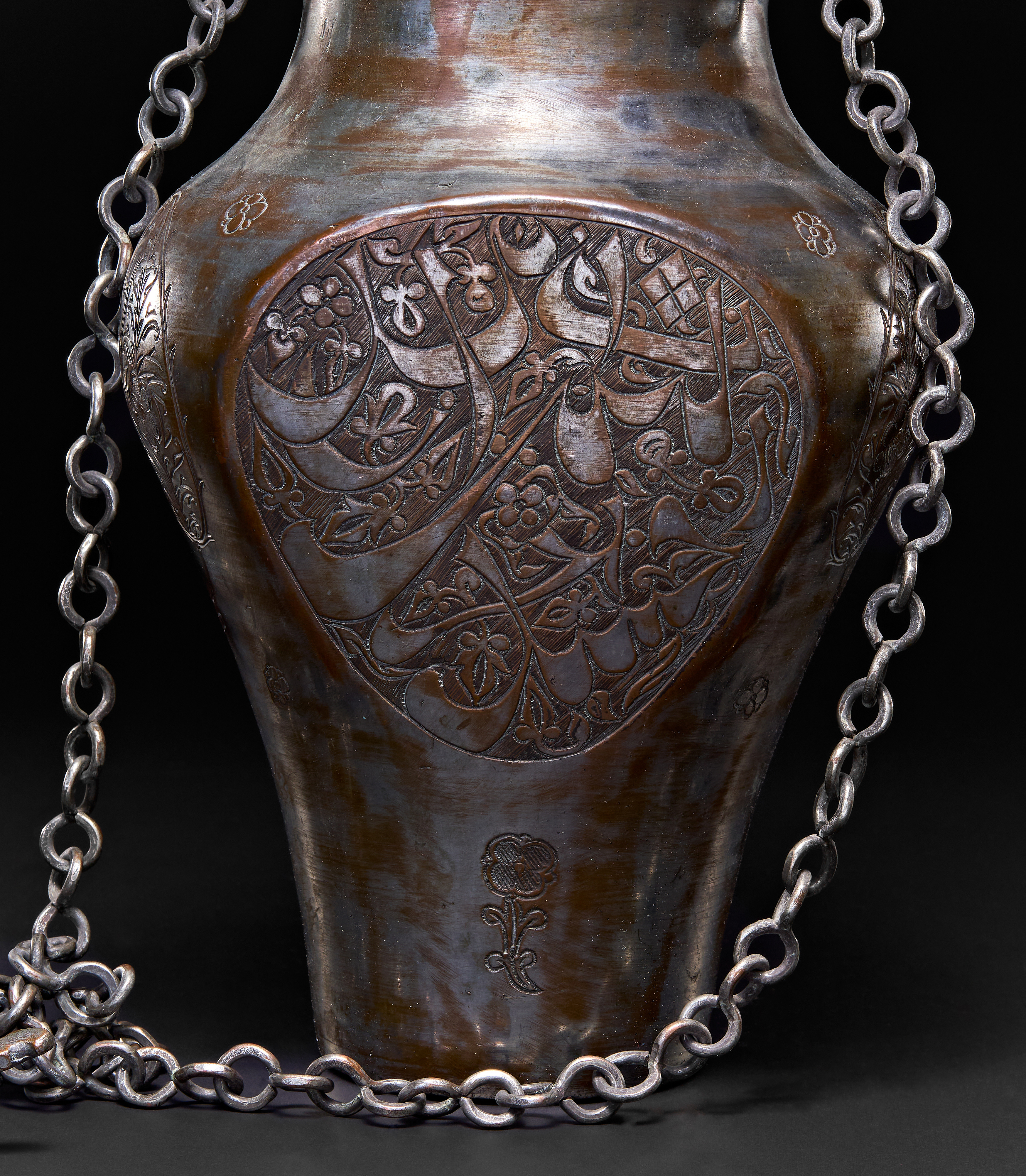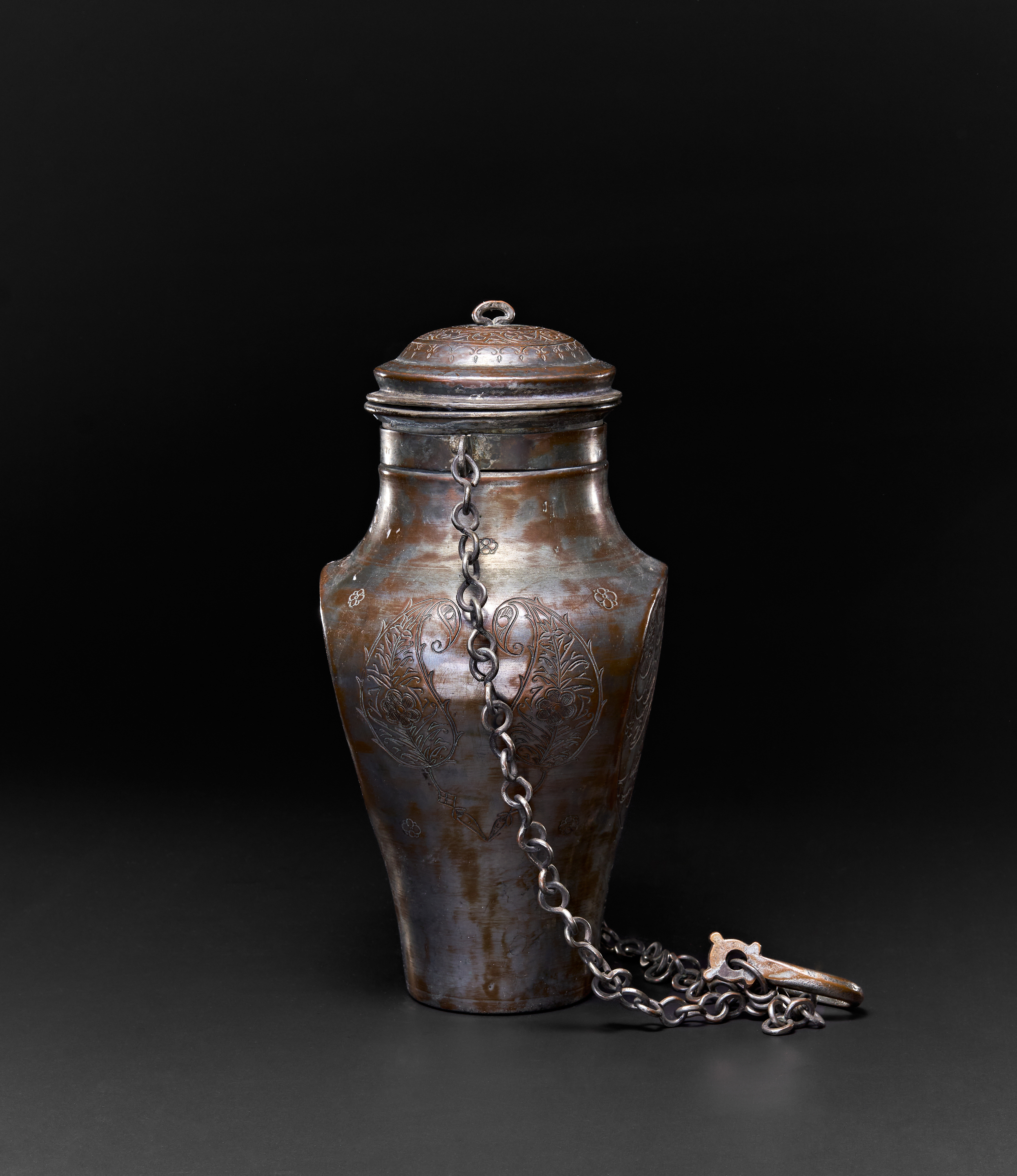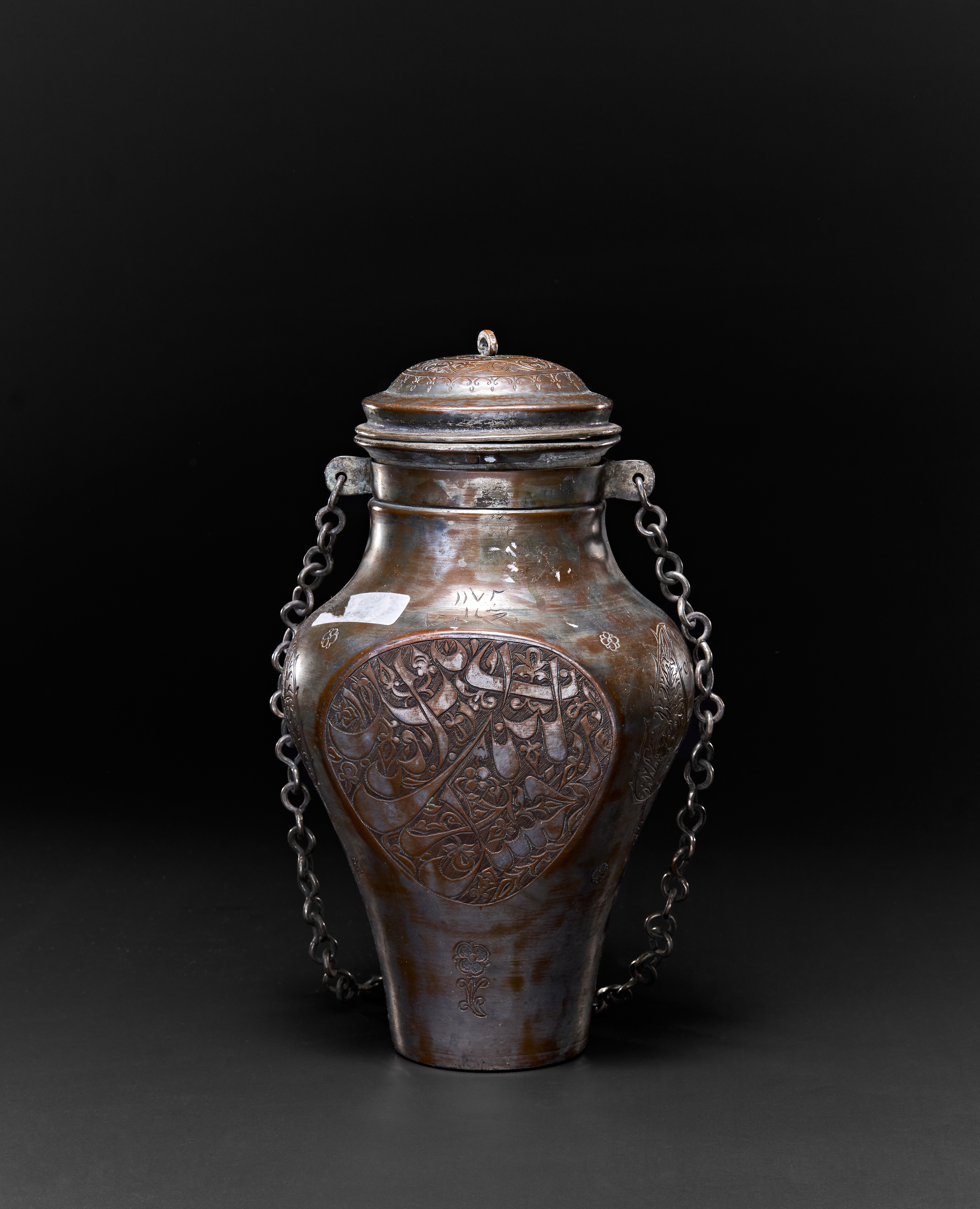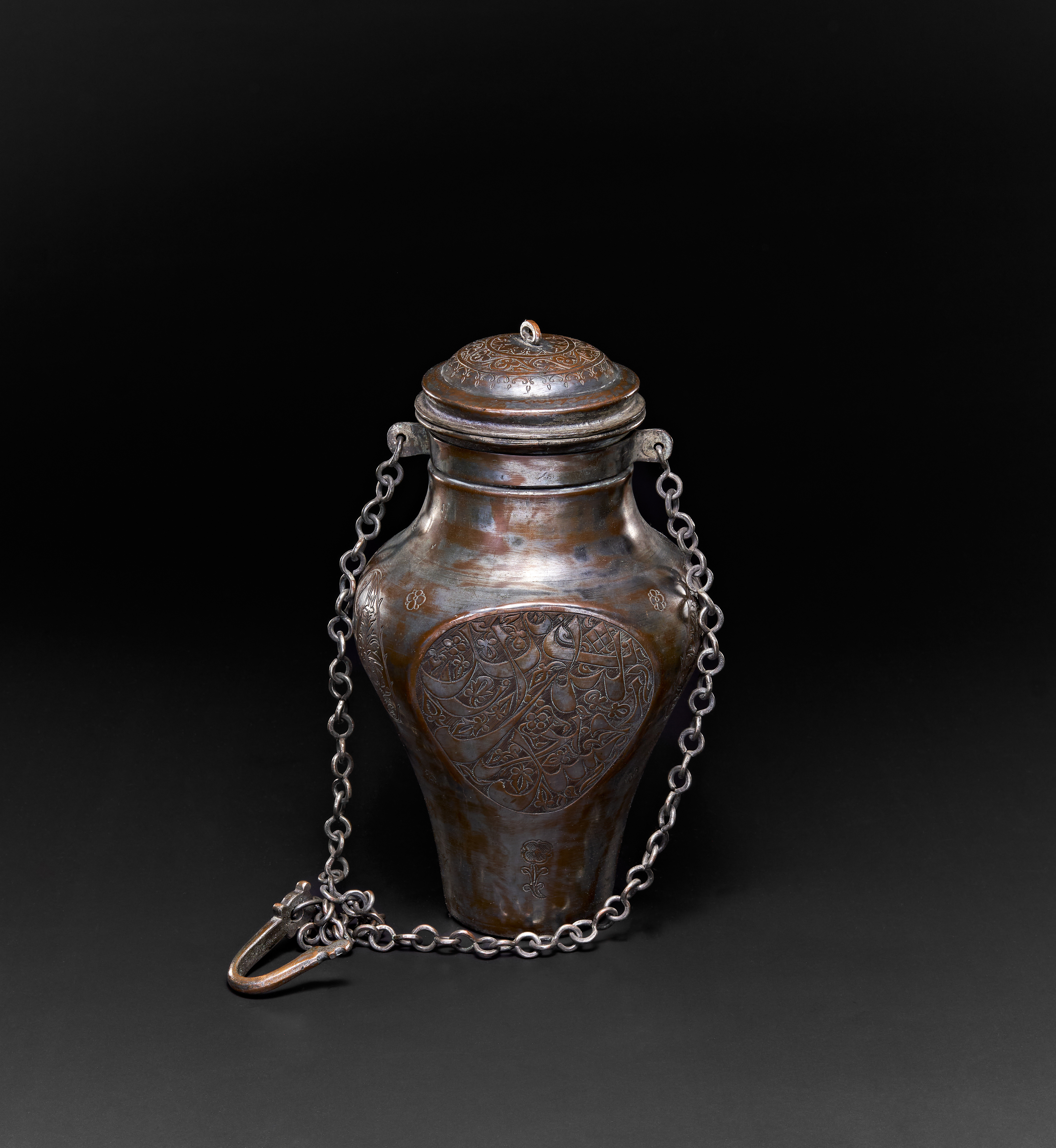 A PERSIAN TINNED COPPER HANGING VESSEL WITH A LID, TABRIZ, 19TH CENTURY