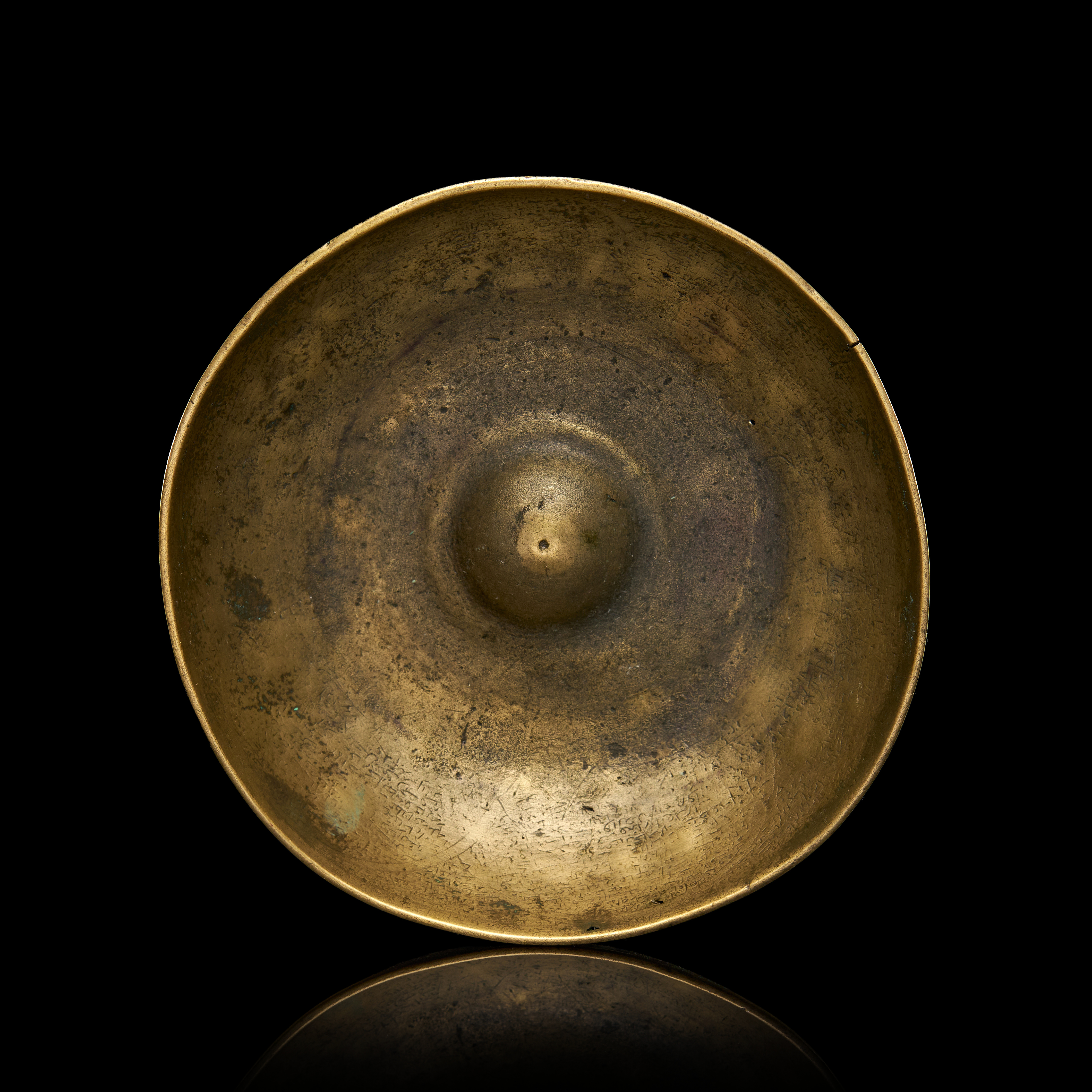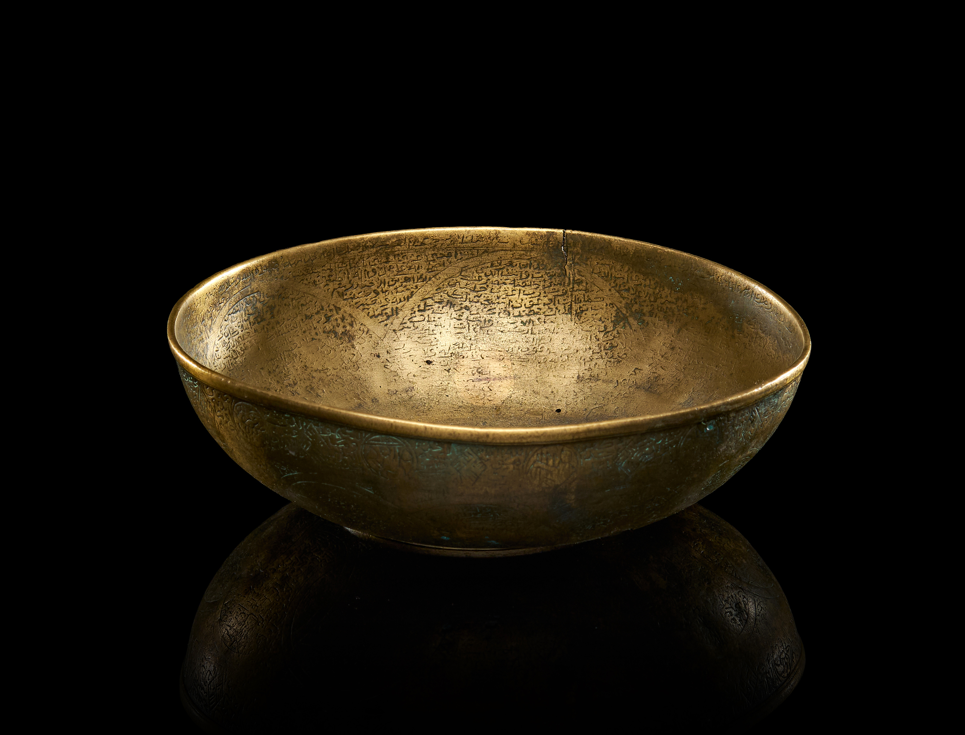 A remarkable and rare bronze magic bowl from early Safavid Persia, dating to the 16th century, exquisitely engraved with talismanic inscriptions and intricate motifs across both interior and exterior surfaces.