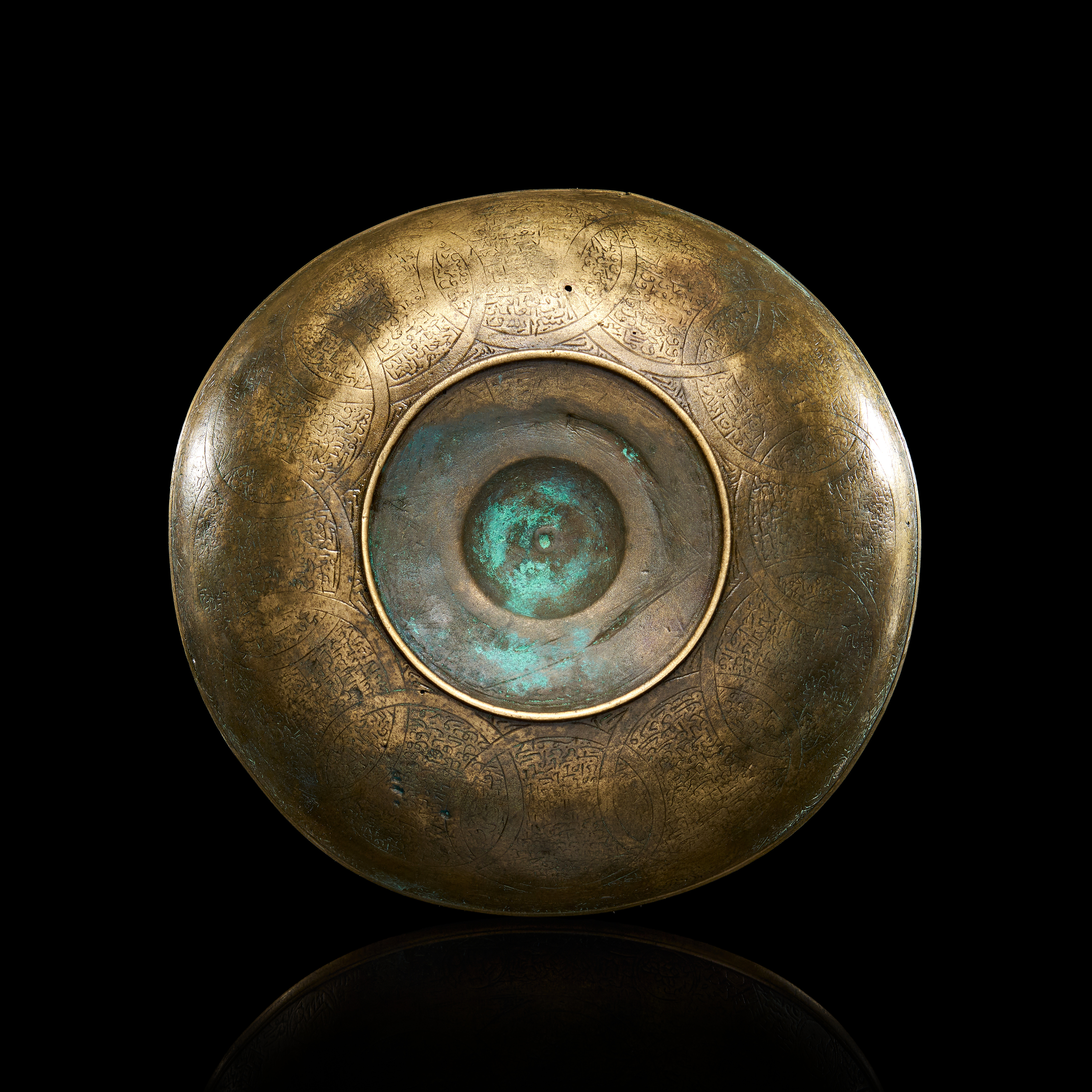 The bowl is shallow with a gently flaring rim and a pronounced raised boss at the center. The interior is densely covered with finely incised Arabic inscriptions—verses, invocations, and protective prayers—arranged in concentric bands and framed within interlaced arched panels. This meticulous scriptwork suggests a ritual or curative function, typical of magic bowls used in Islamic folk medicine and spiritual healing.