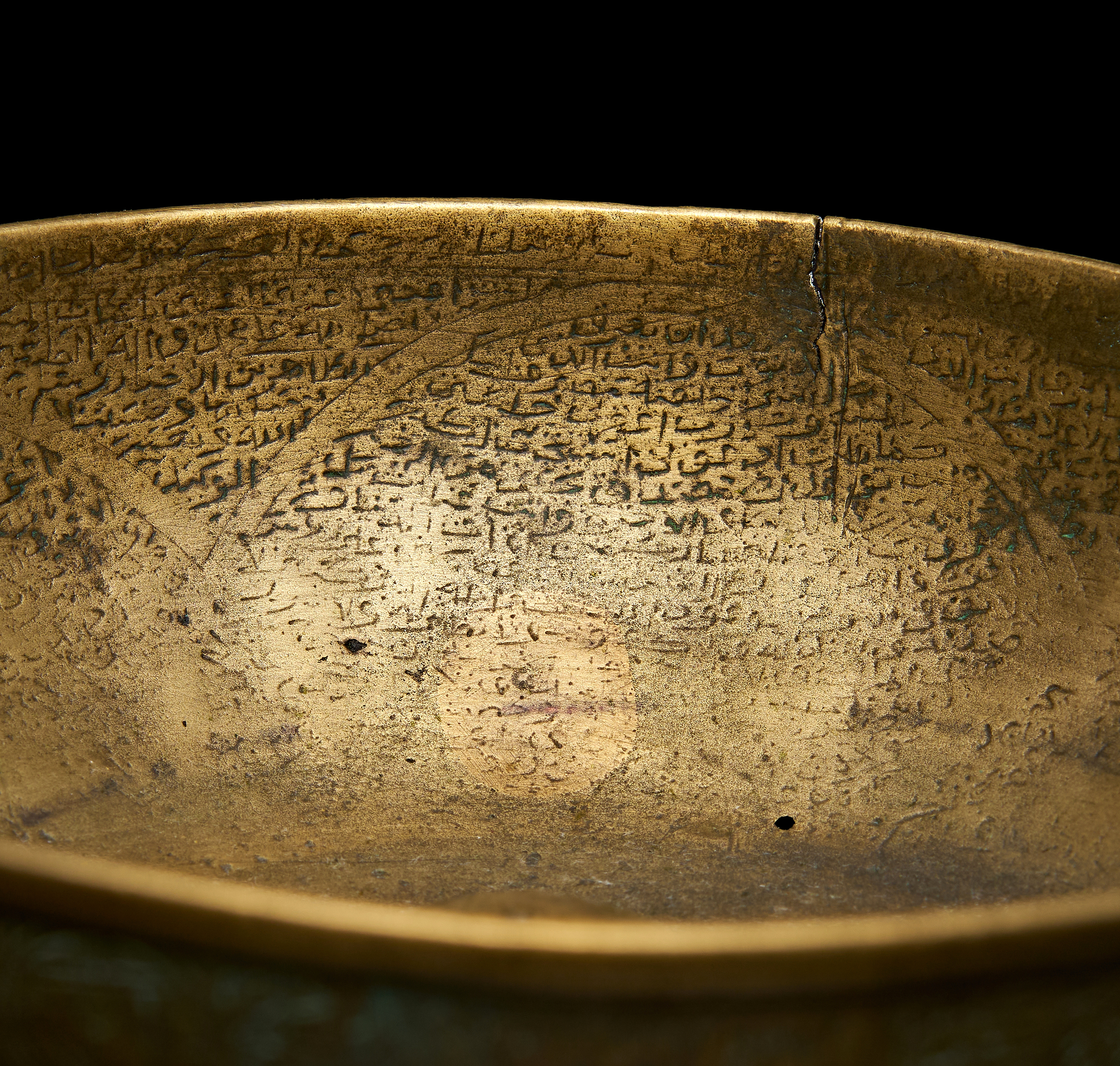 The exterior is equally detailed, with additional inscriptions and geometric motifs incised into the bronze, now beautifully patinated with a mottled green and brown surface, showing traces of old tinning and age-related wear. A distinctive circular panel is engraved on the base, surrounded by calligraphic arcs—likely referencing Qur’anic or astrological symbolism meant to harness divine or cosmic forces for protection, health, or exorcism.