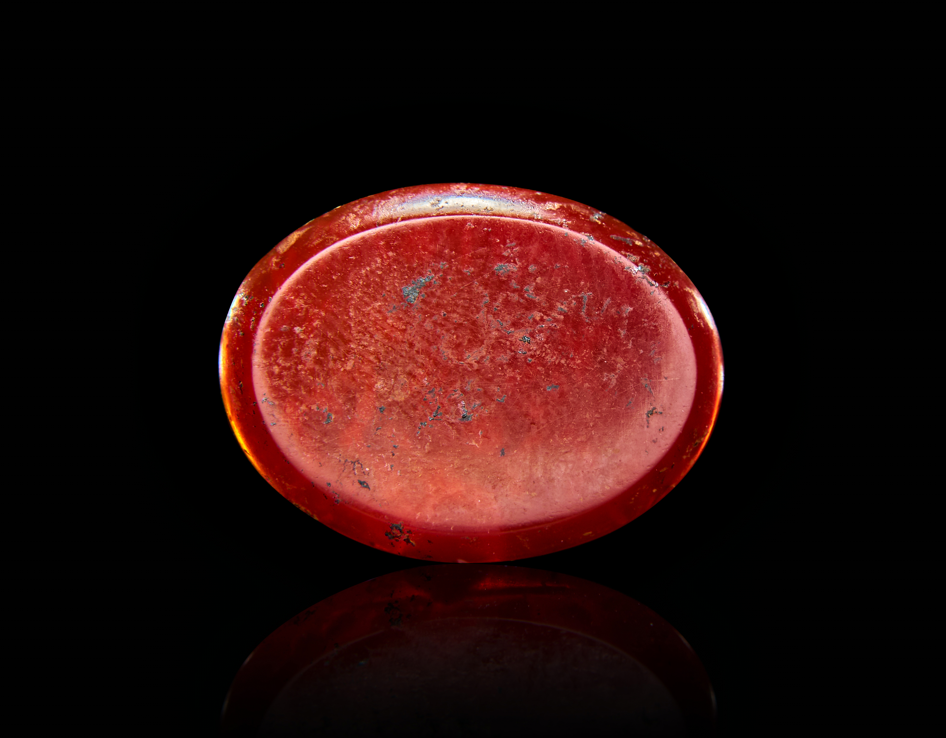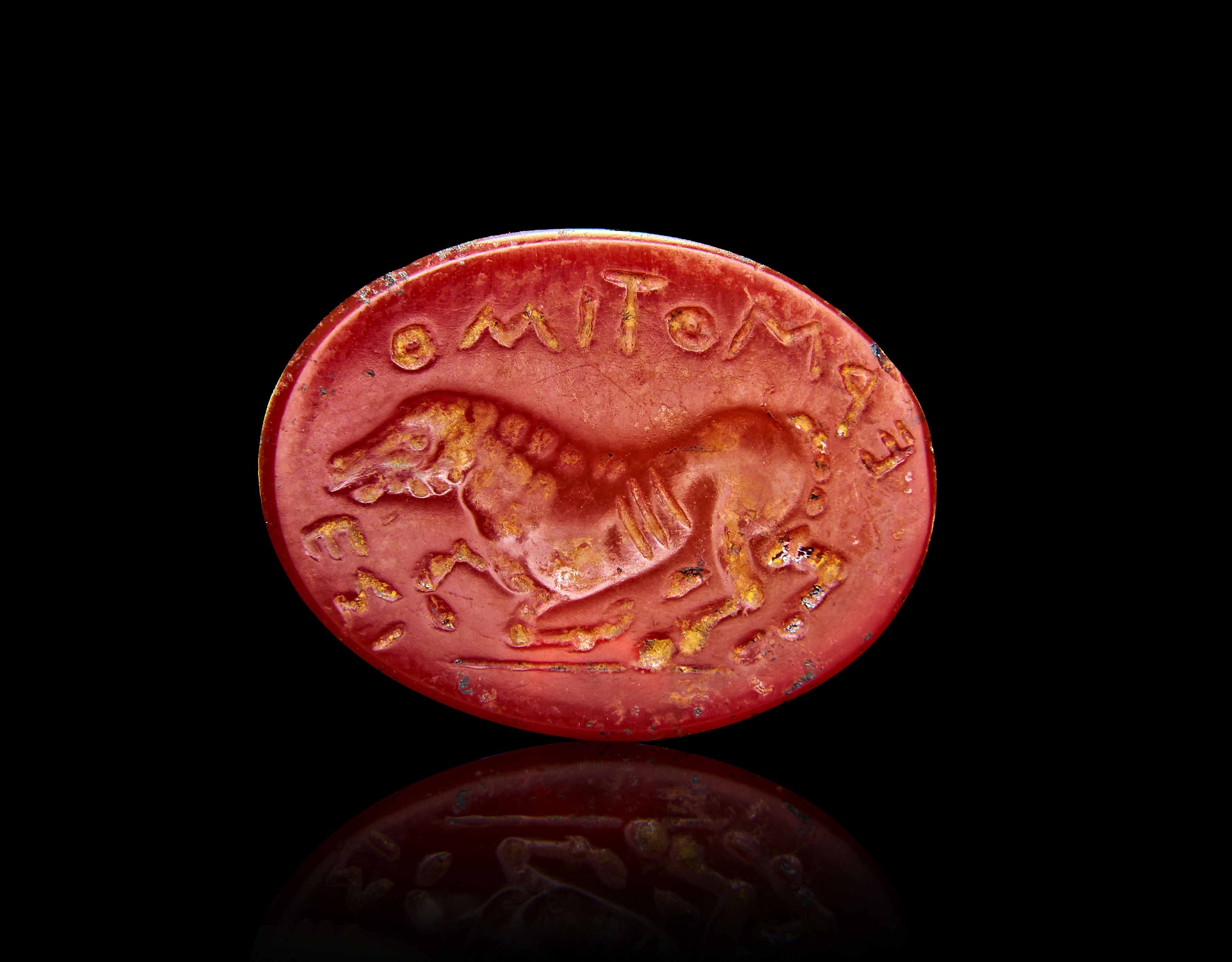 A ROMAN AGATE INTAGLIO OF A CROUCHING HORSE WITH GREEK OR ROMAN INSCRIPTIONS, 1ST – 2ND CENTURY A.D