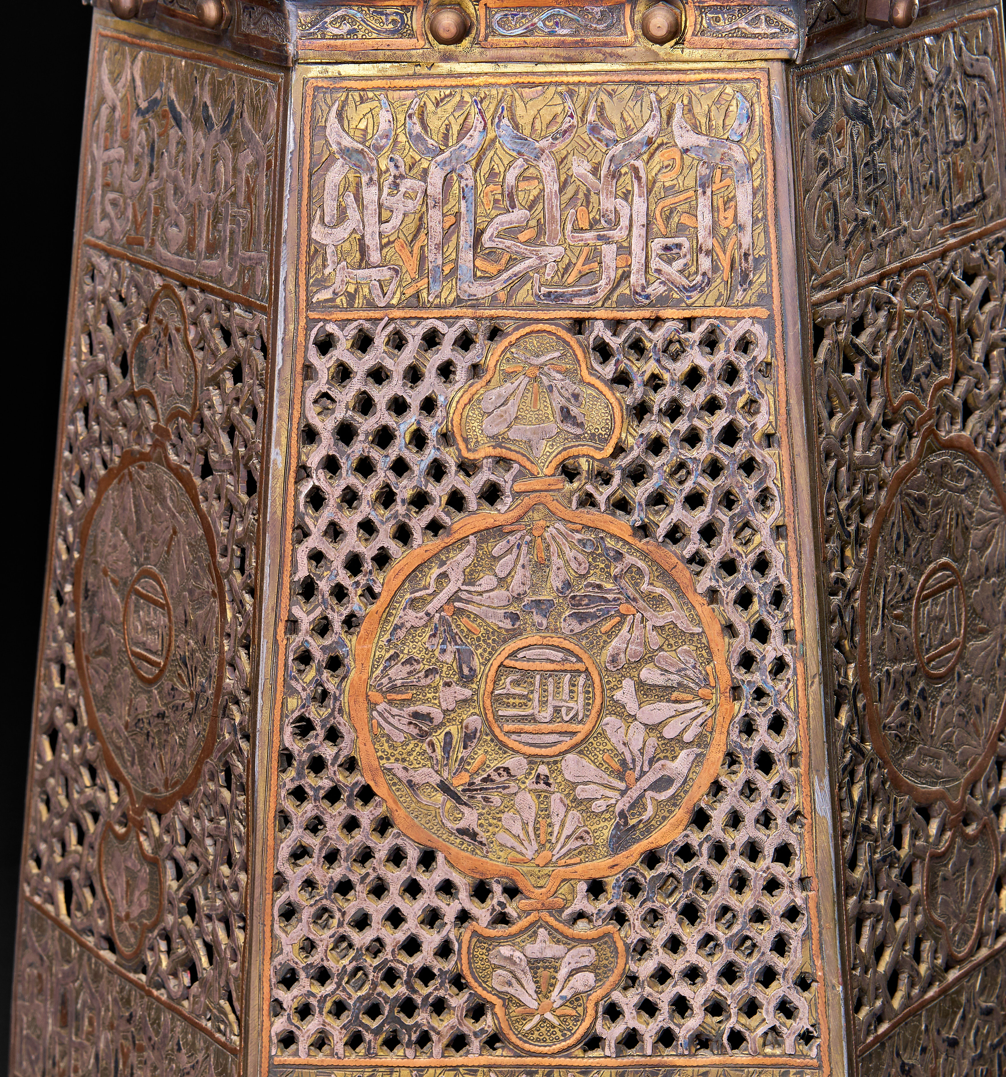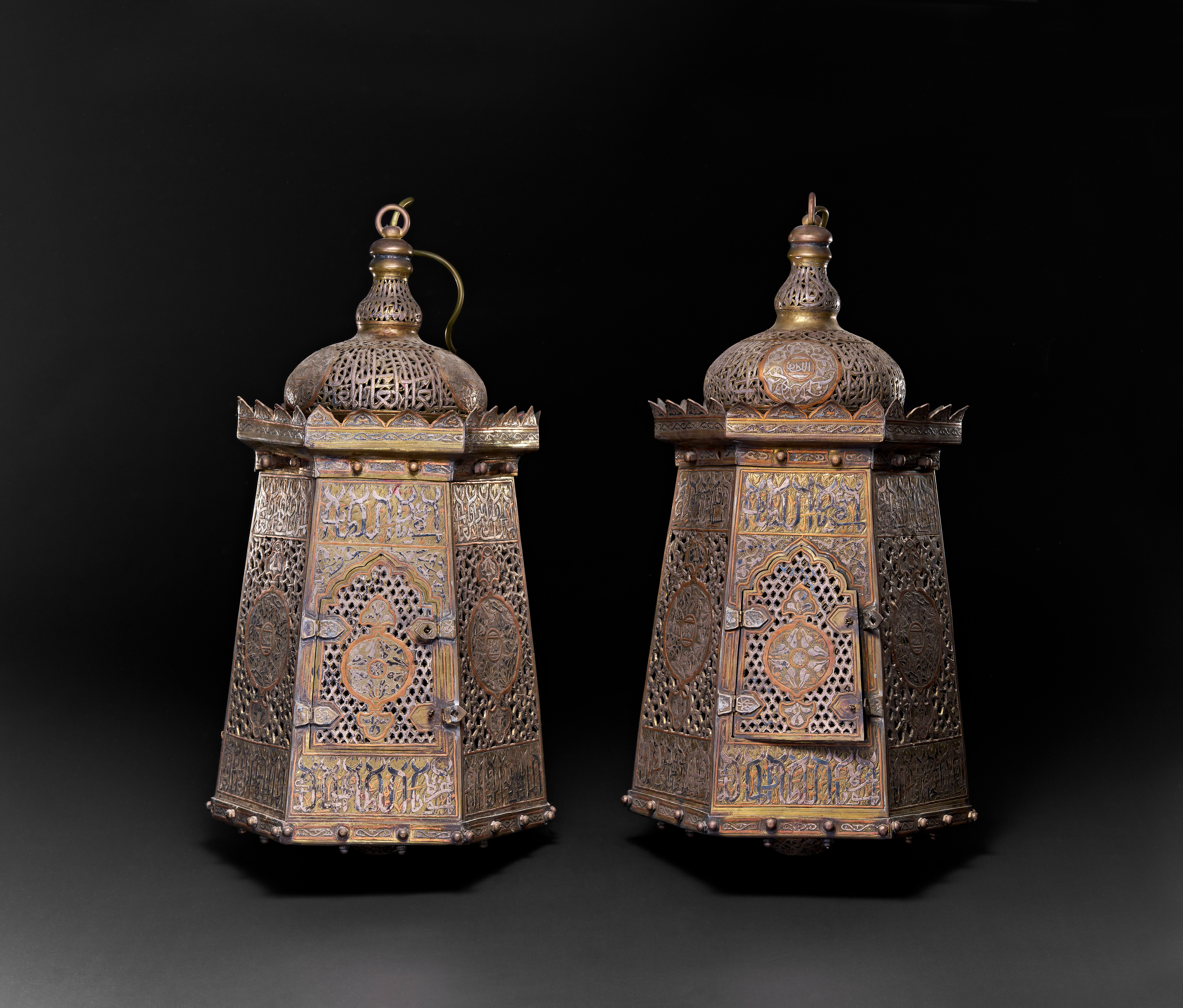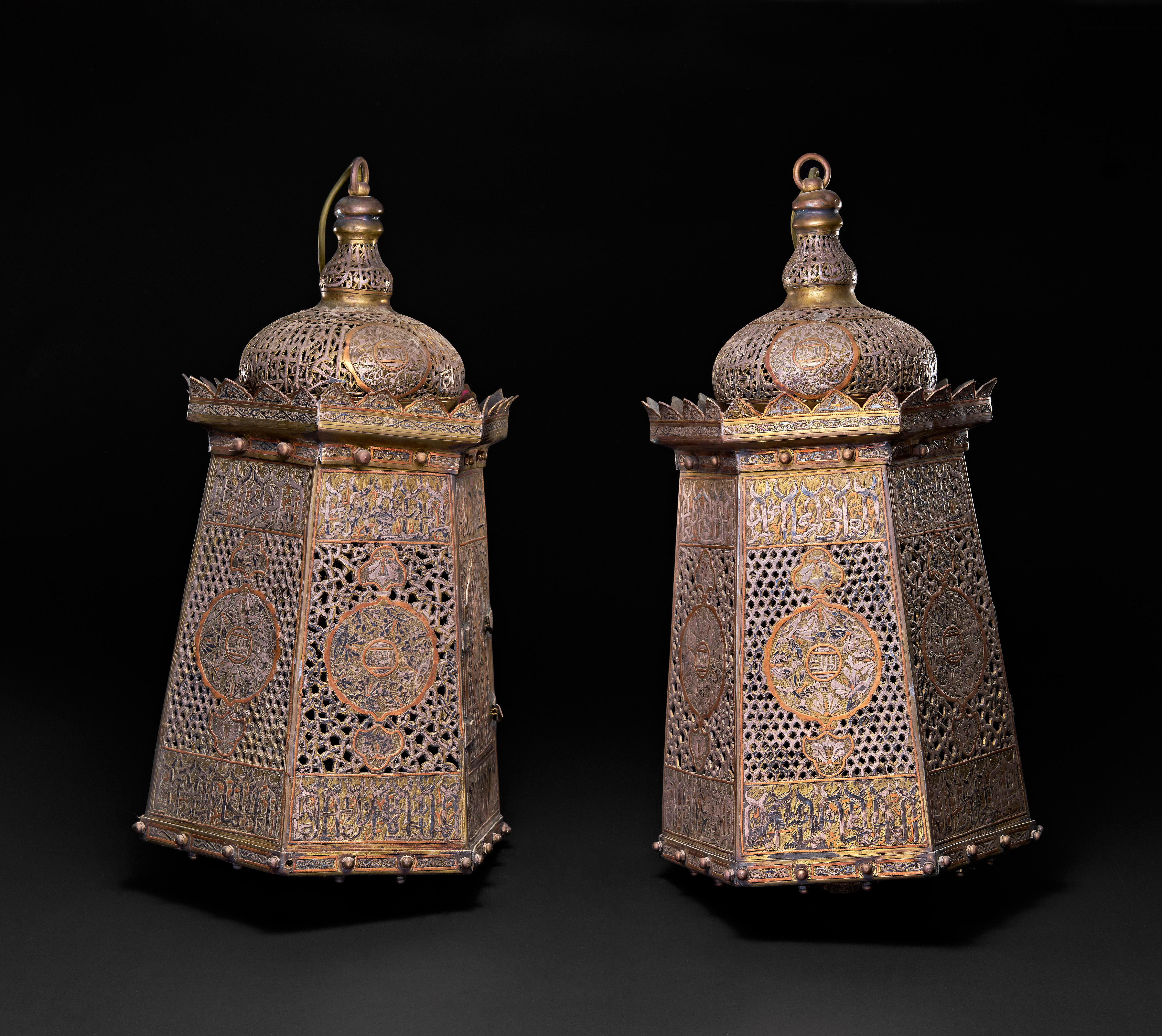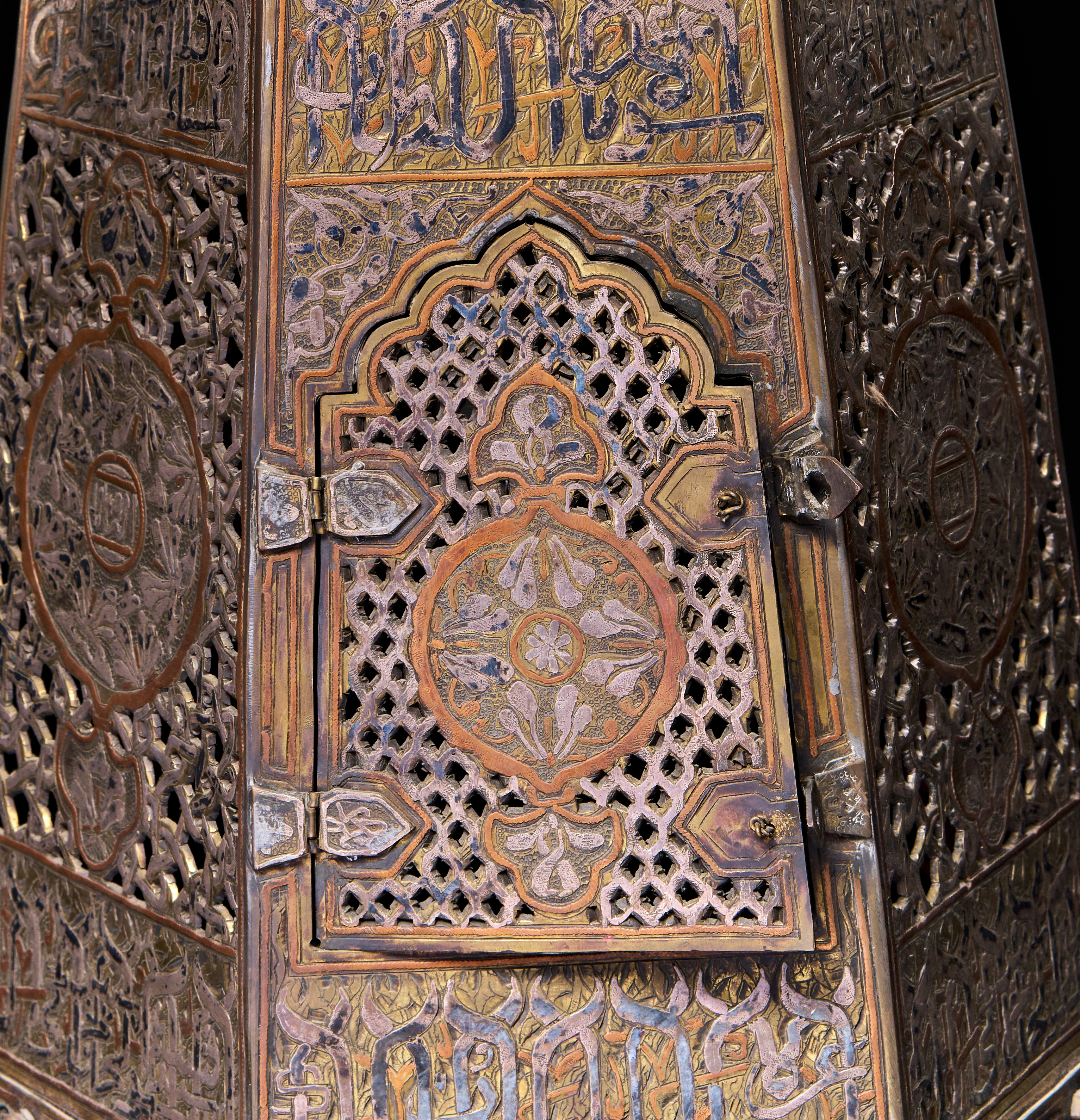 Executed in inlaid brass with silver and copper detailing, the surfaces are richly embellished with bands of Arabic calligraphy in thuluth script, interwoven with vegetal scrolls and medallions containing stylized floral and geometric patterns. The pierced domes allow for elegant light diffusion, while the hinged access panels and circular lower openings underscore their functionality.