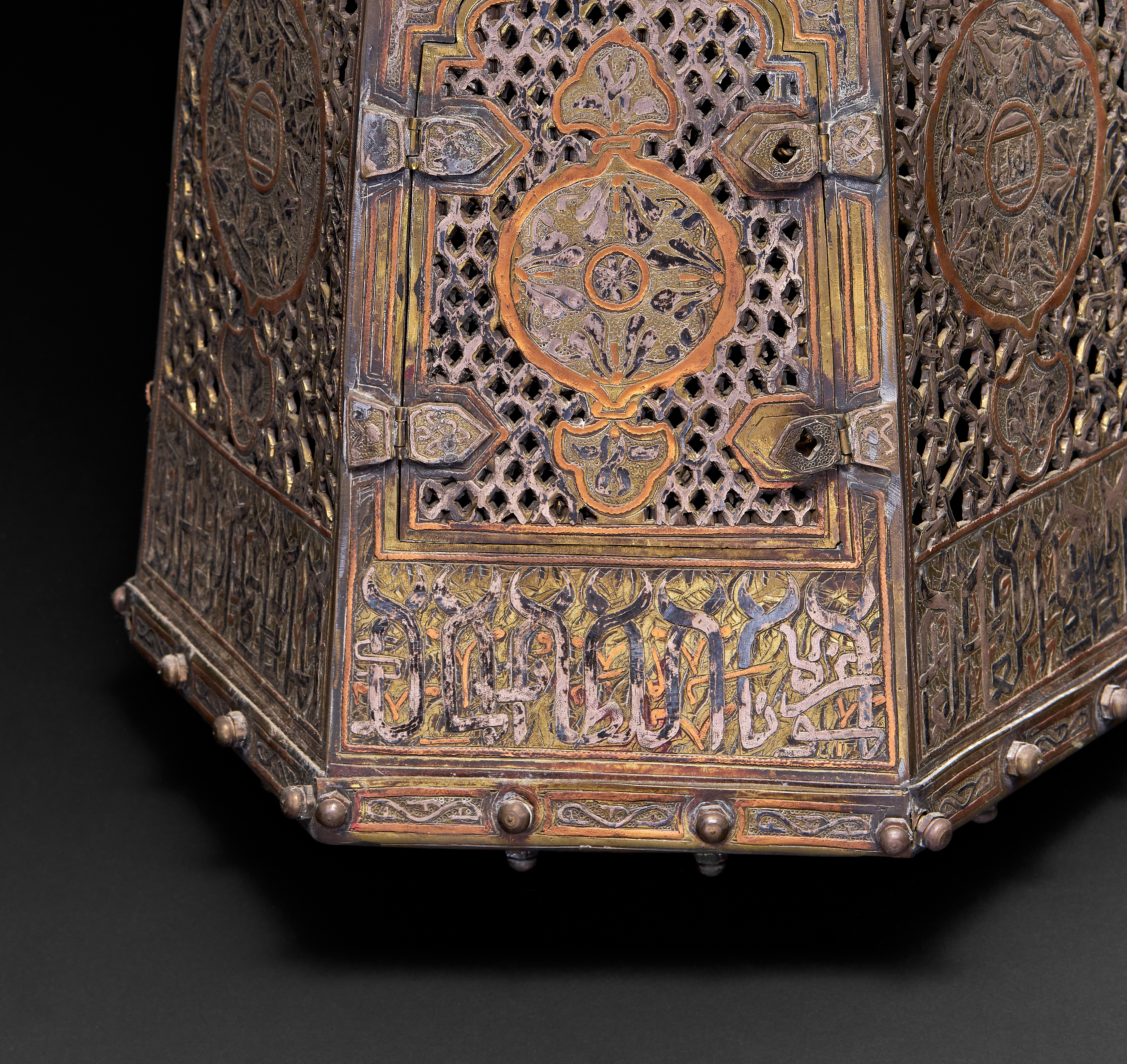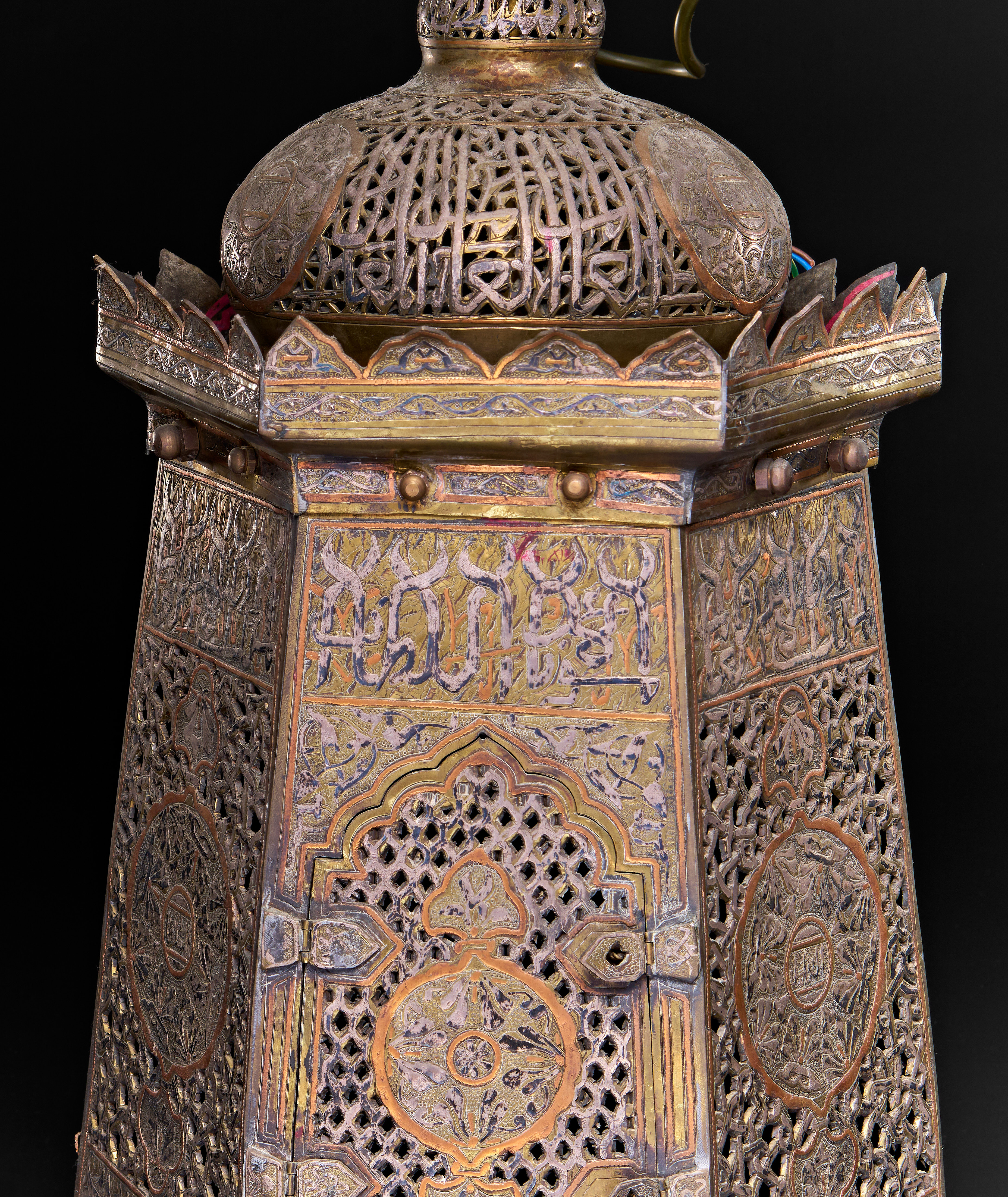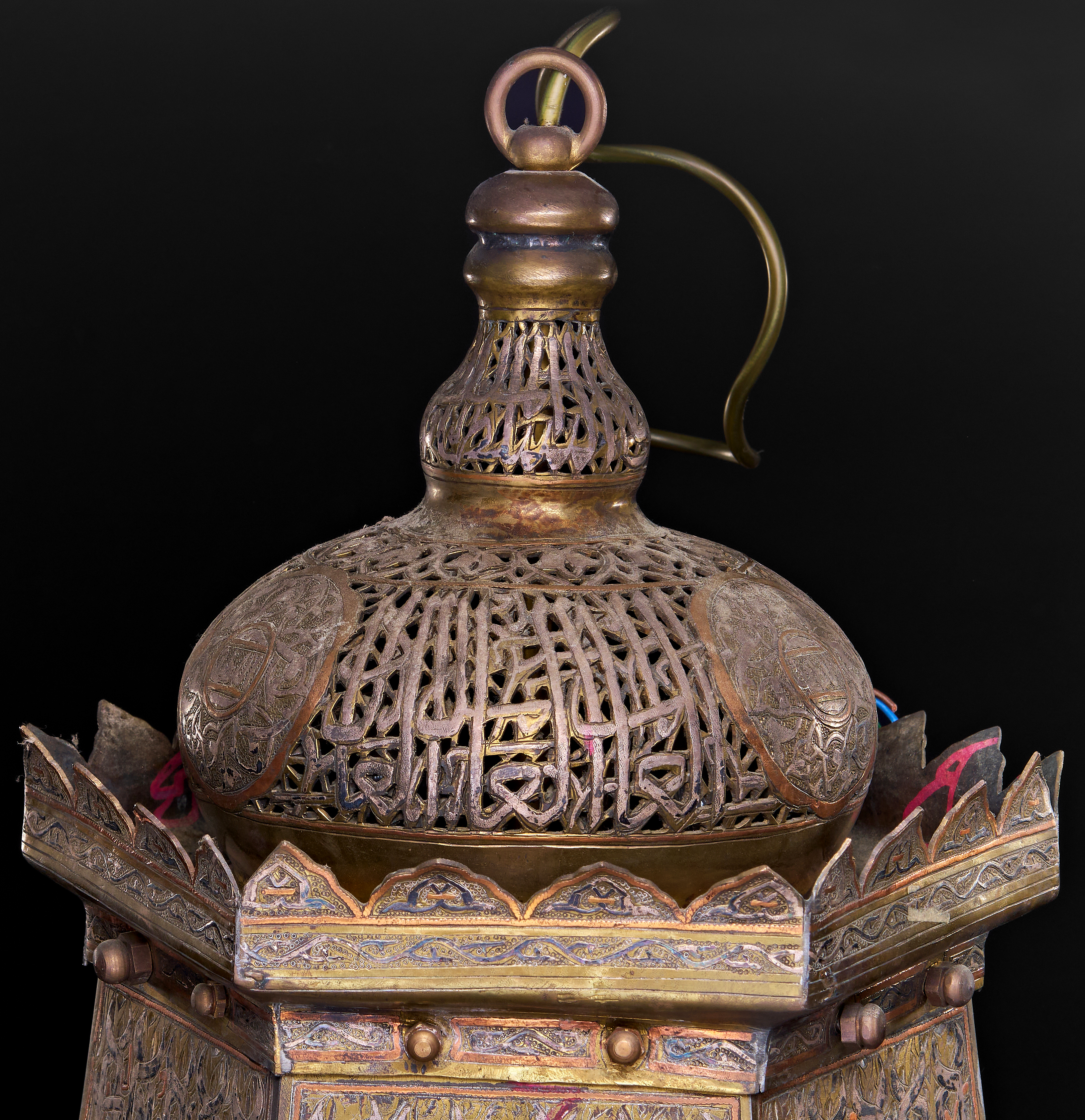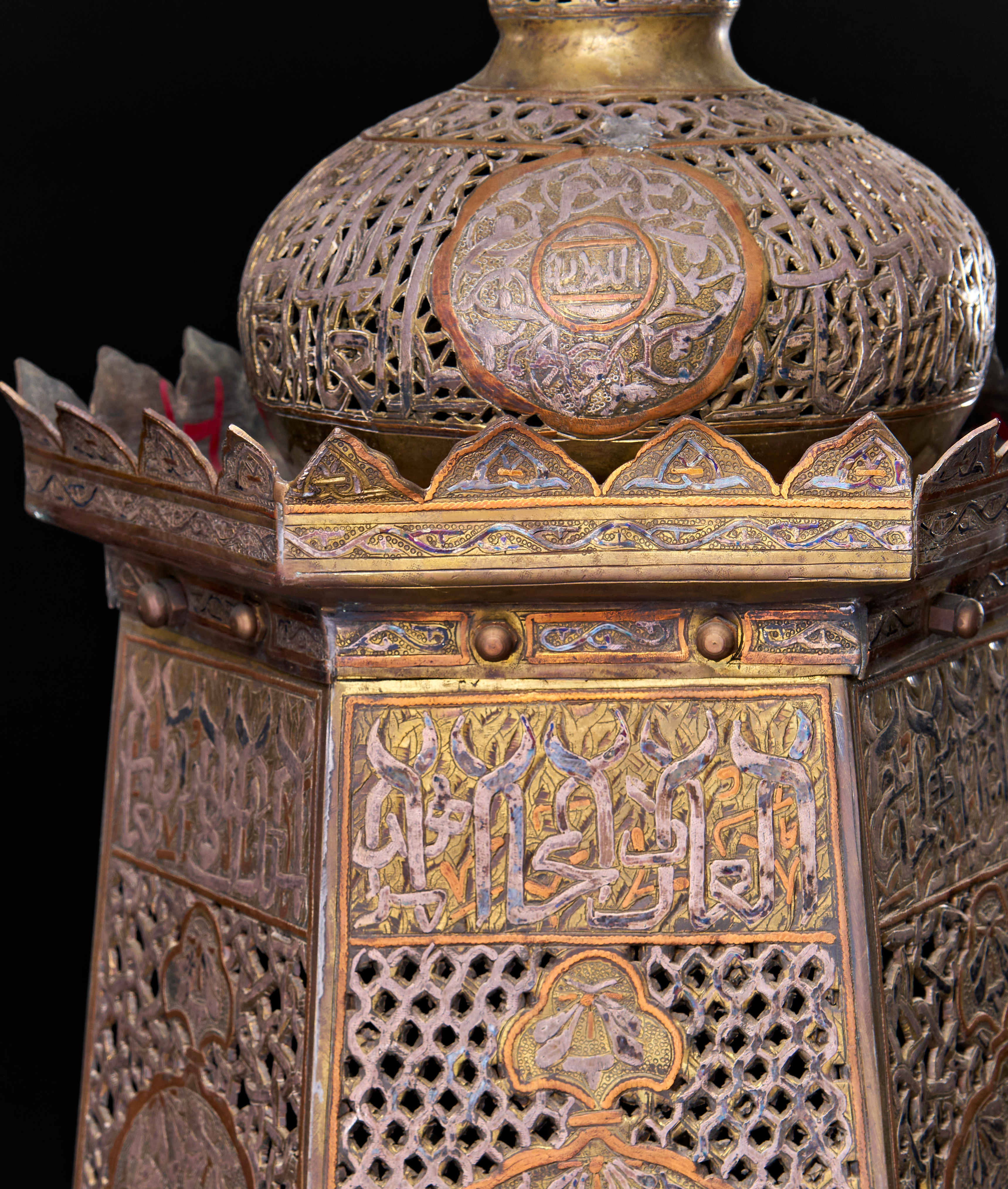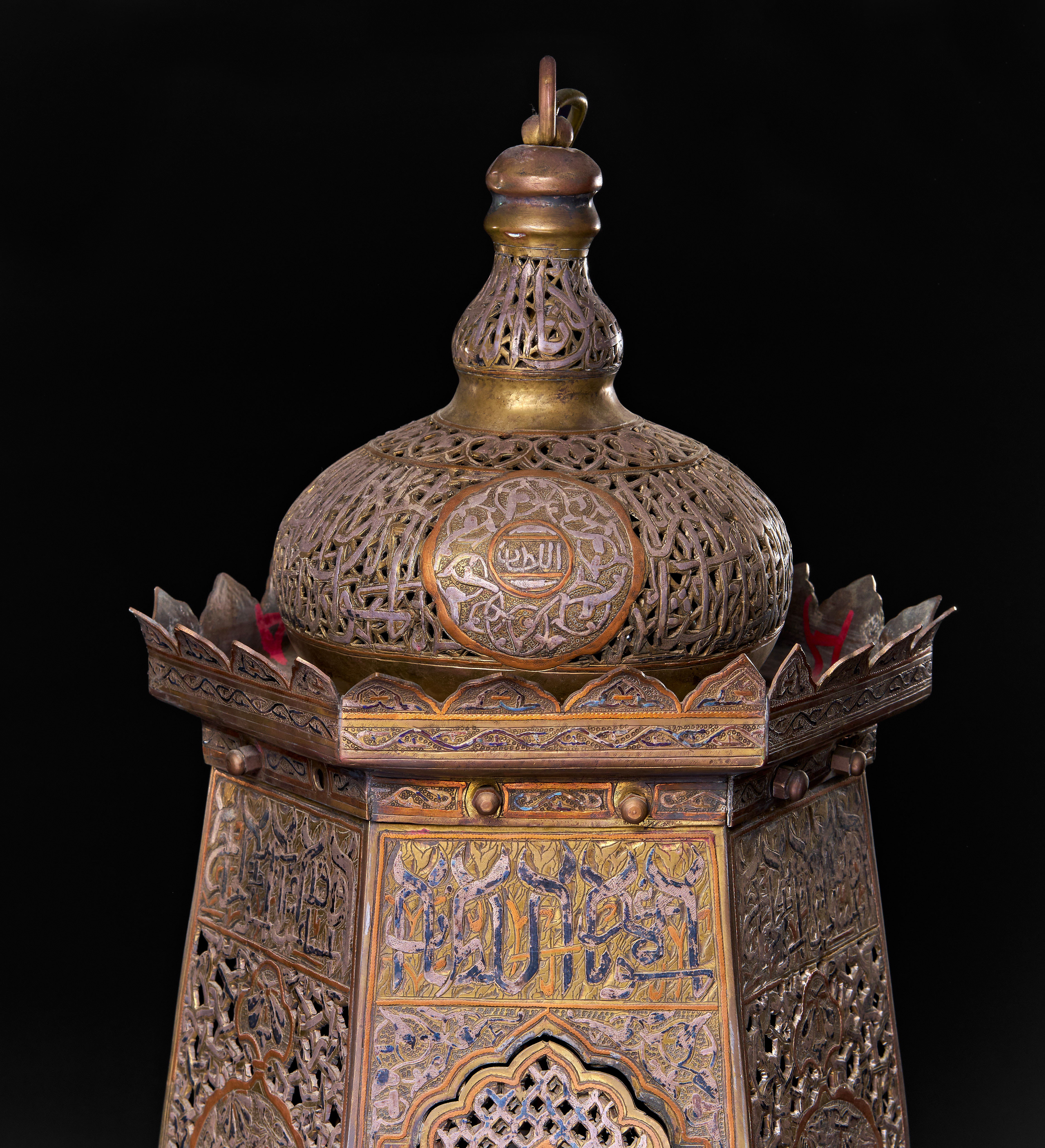 Executed in inlaid brass with silver and copper detailing, the surfaces are richly embellished with bands of Arabic calligraphy in thuluth script, interwoven with vegetal scrolls and medallions containing stylized floral and geometric patterns. The pierced domes allow for elegant light diffusion, while the hinged access panels and circular lower openings underscore their functionality.