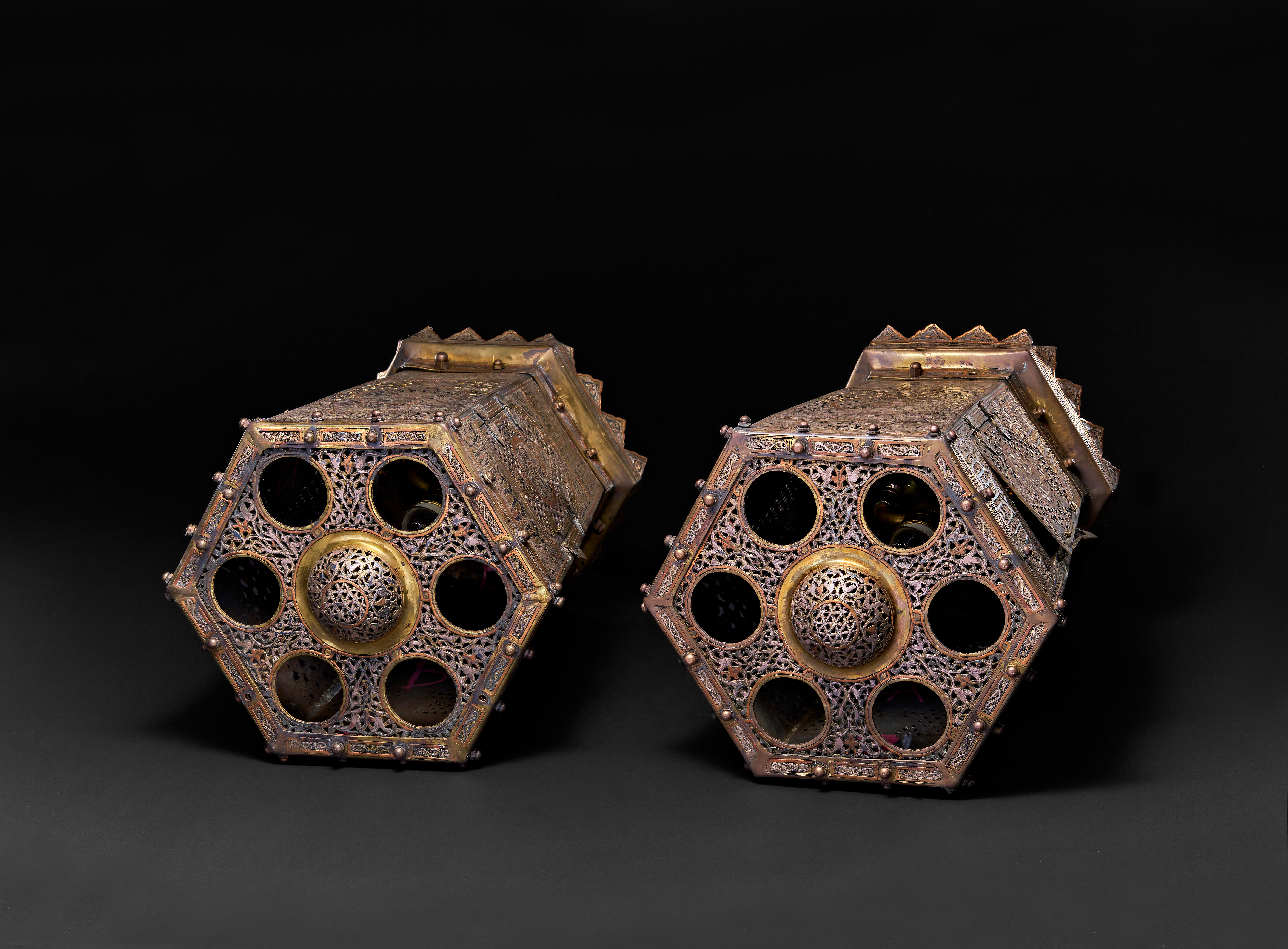 An impressive and finely crafted pair of hexagonal lanterns in the Mamluk Revival style, originating from Egypt or Syria in the late 19th to early 20th century. Each lantern is composed of six tapering panels, rising to a domed and pierced crown finial, surmounted by a suspension loop and adorned throughout with intricately worked geometric and arabesque motifs.