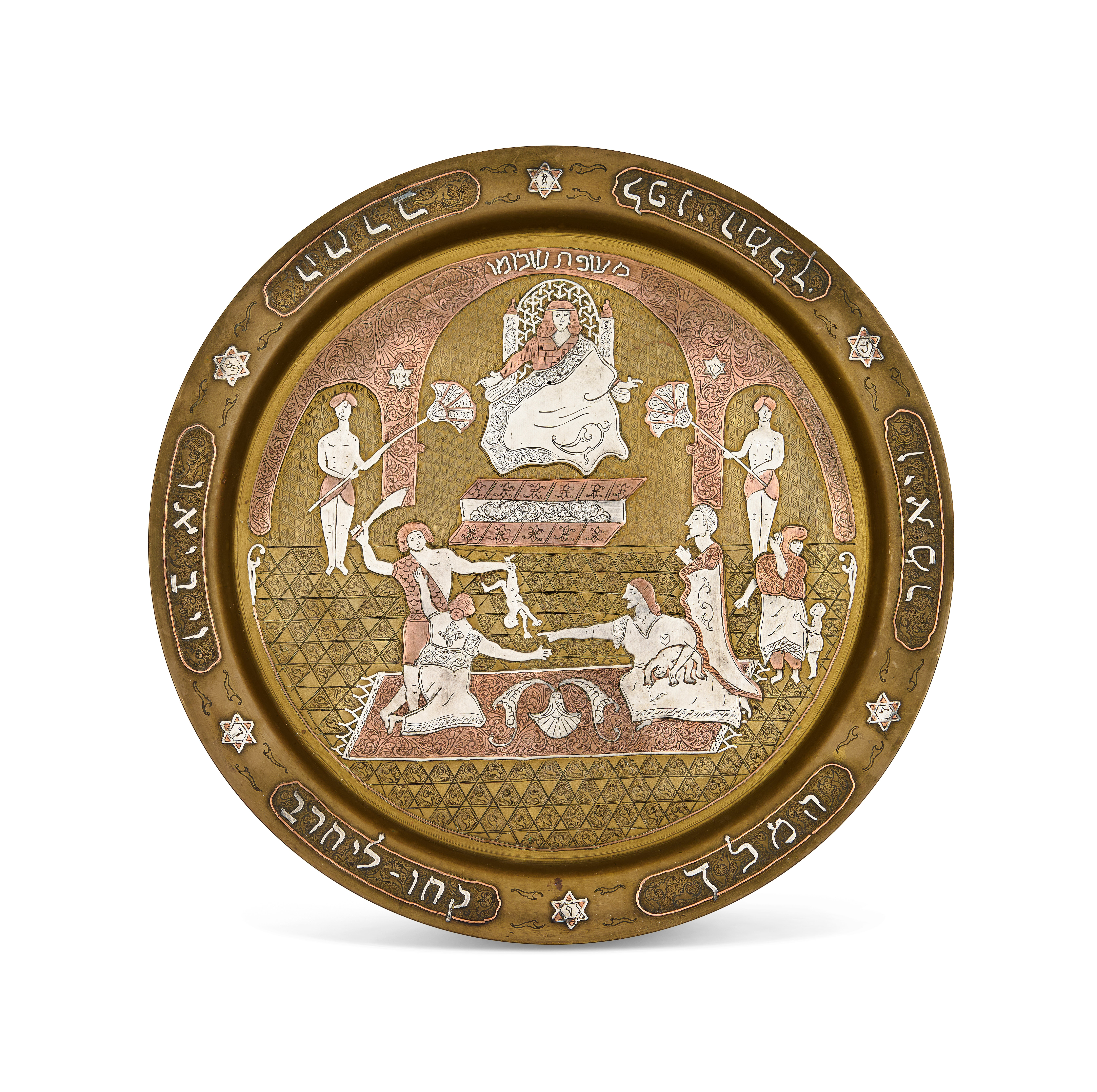 Surrounding the central image are Hebrew inscriptions, including quotations from the biblical passage, possibly referencing Solomon’s wisdom. The edge of the tray is adorned with silver-inlaid Stars of David and Hebrew phrases, adding religious and cultural depth.