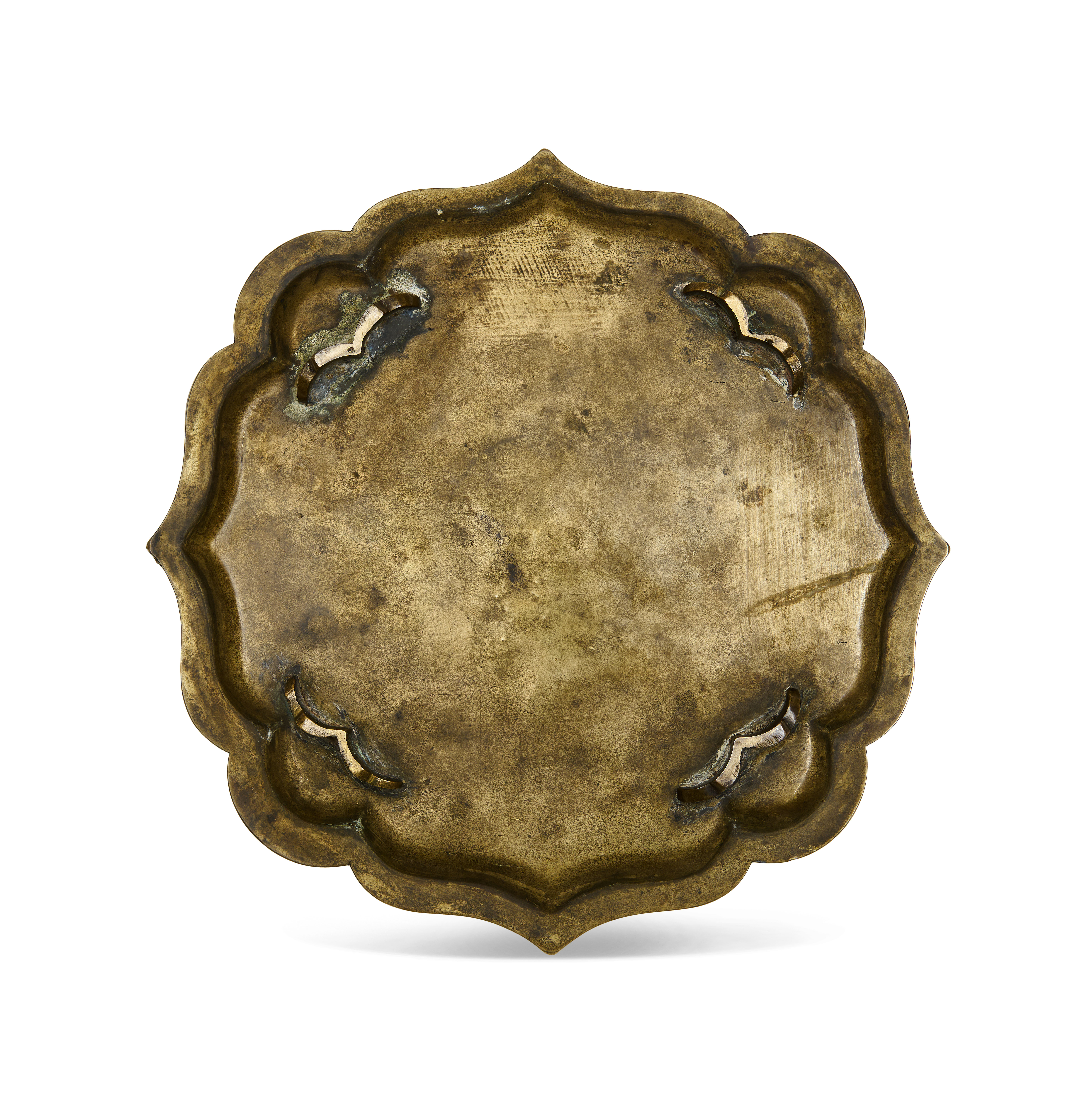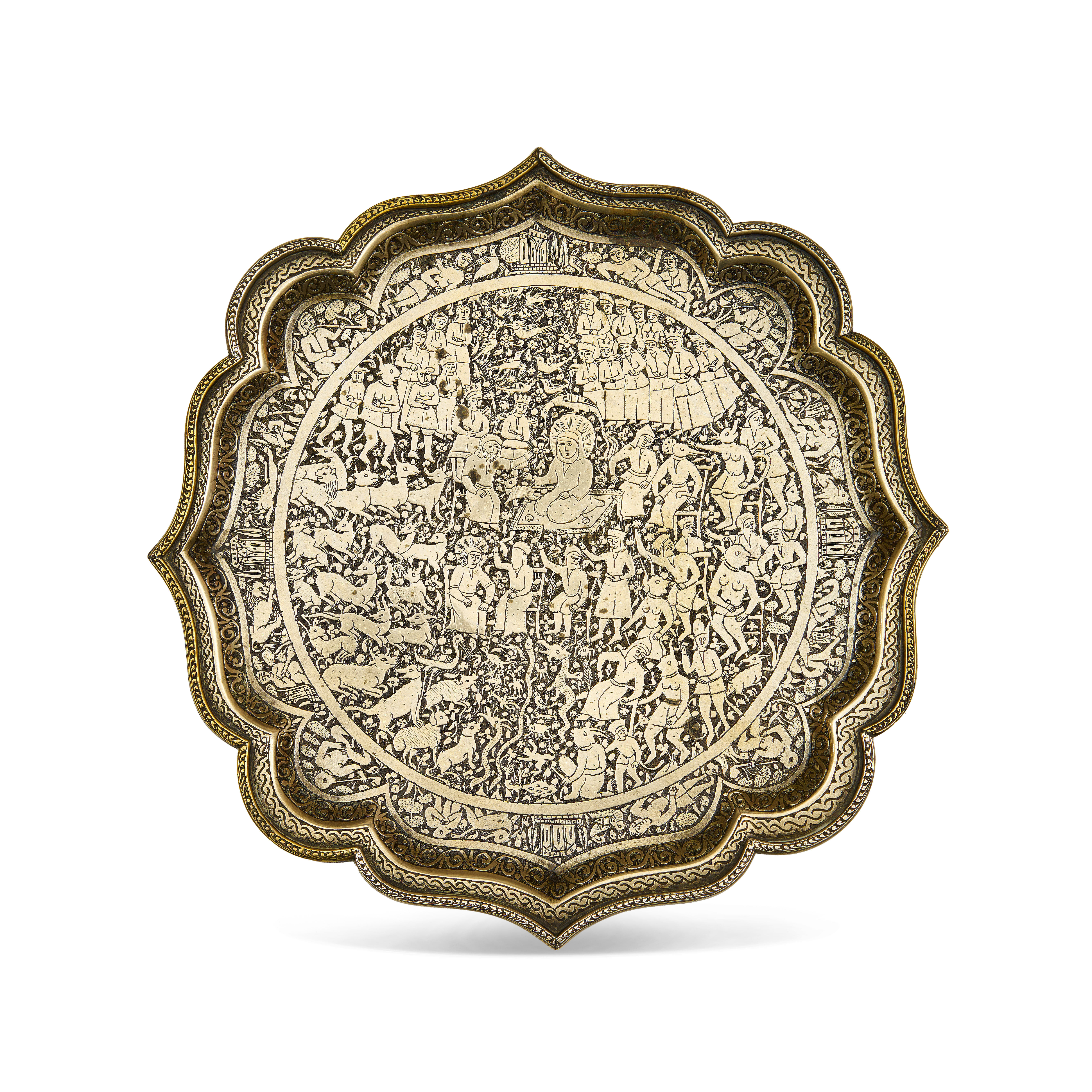 A BRASS QAJAR FOOTED TRAY DEPICTING SOLOMON SURROUNDED BY ANIMAL, PERSIA, 19TH CENTURY