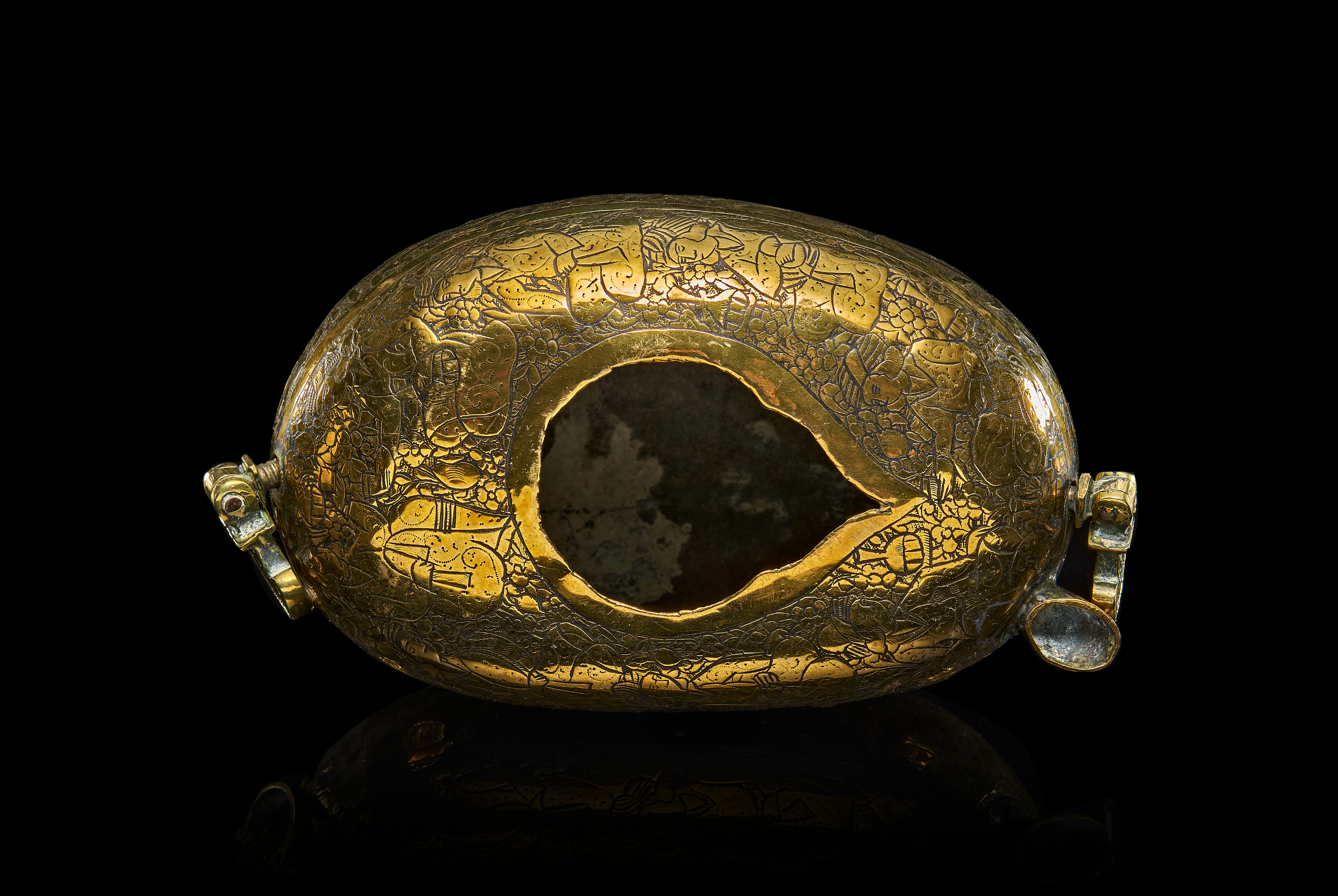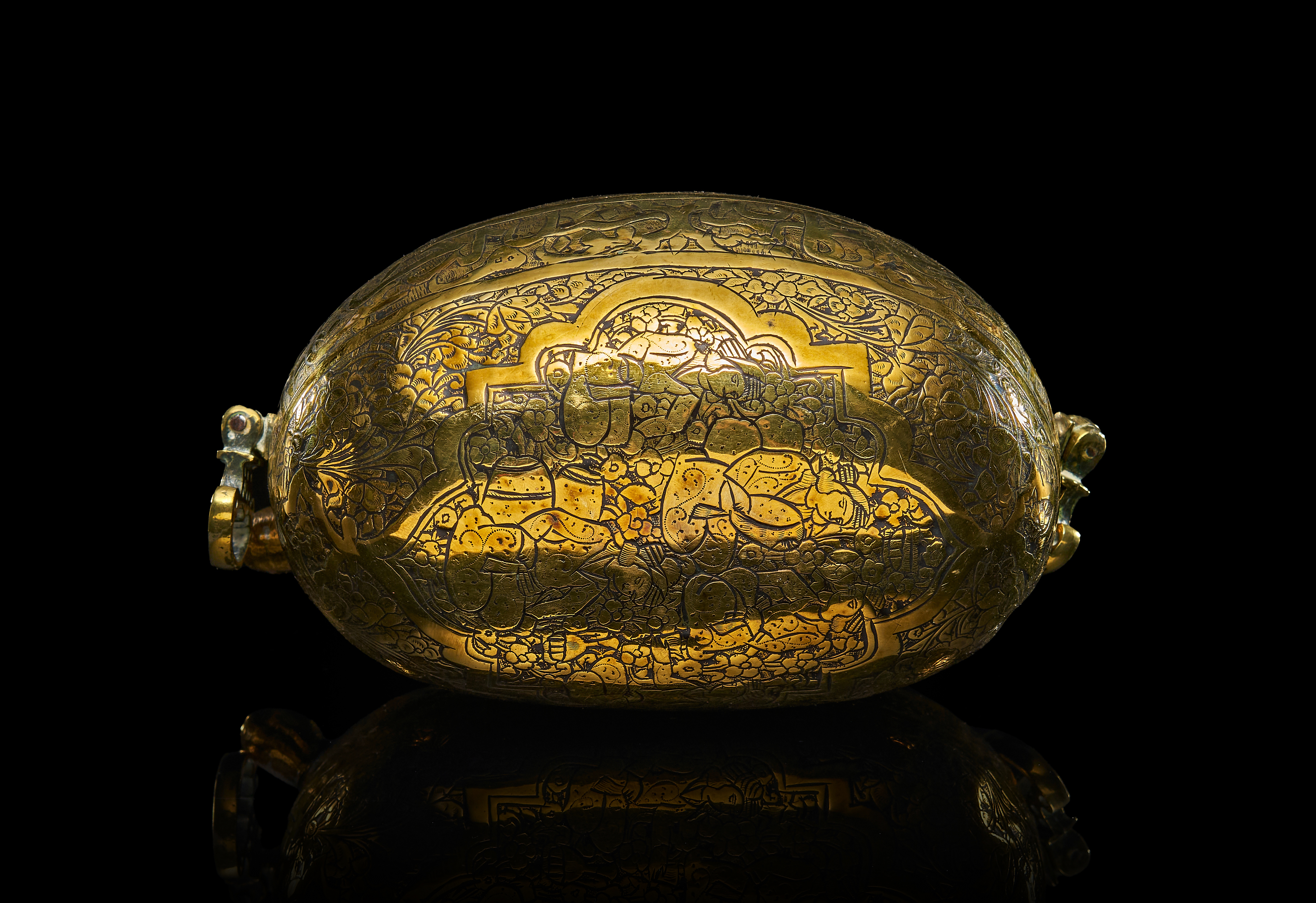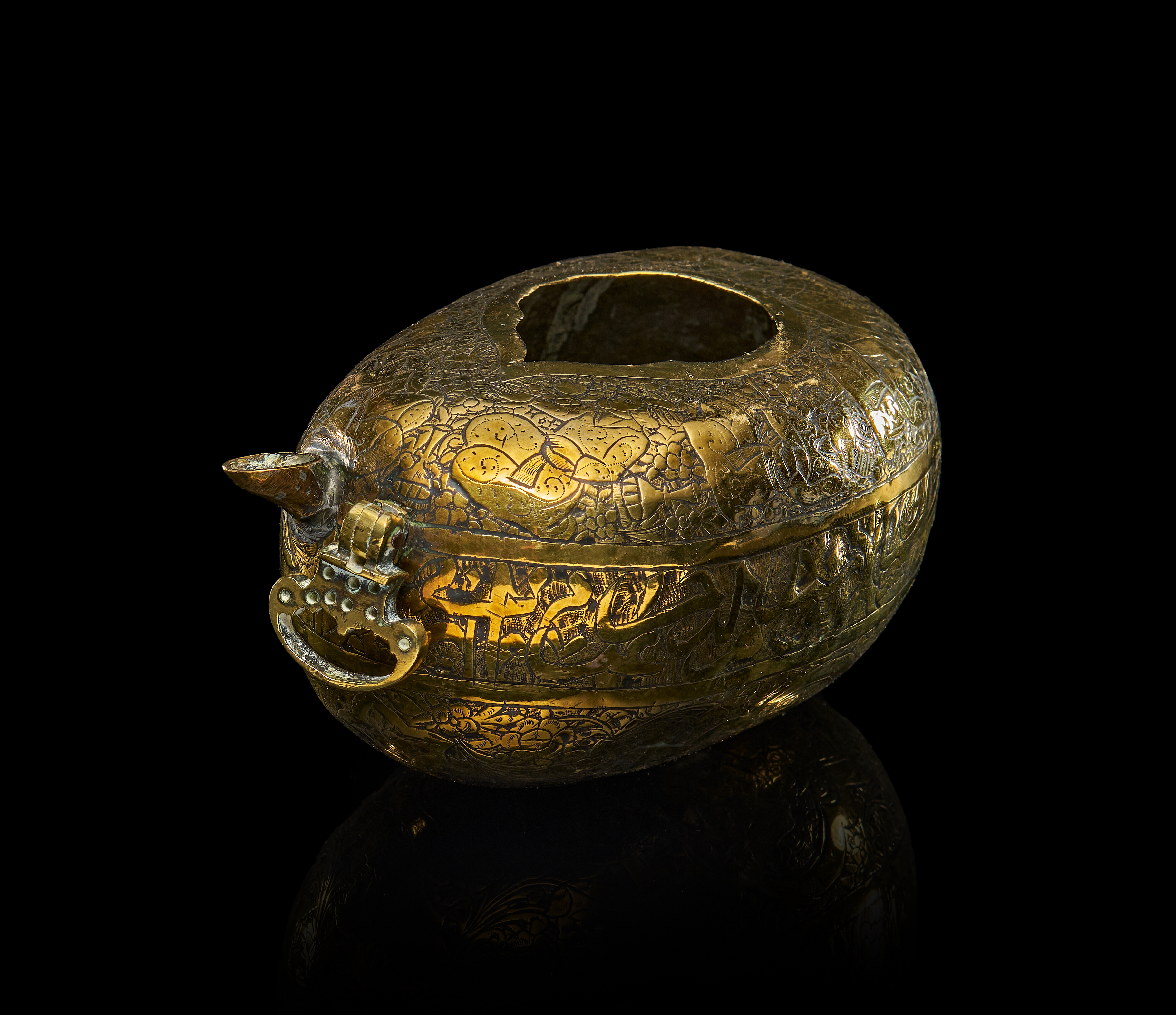 AN UNUSUAL MINIATURE QAJAR ENGRAVED BRASS KASHKUL, PERSIA, 19TH CENTURY