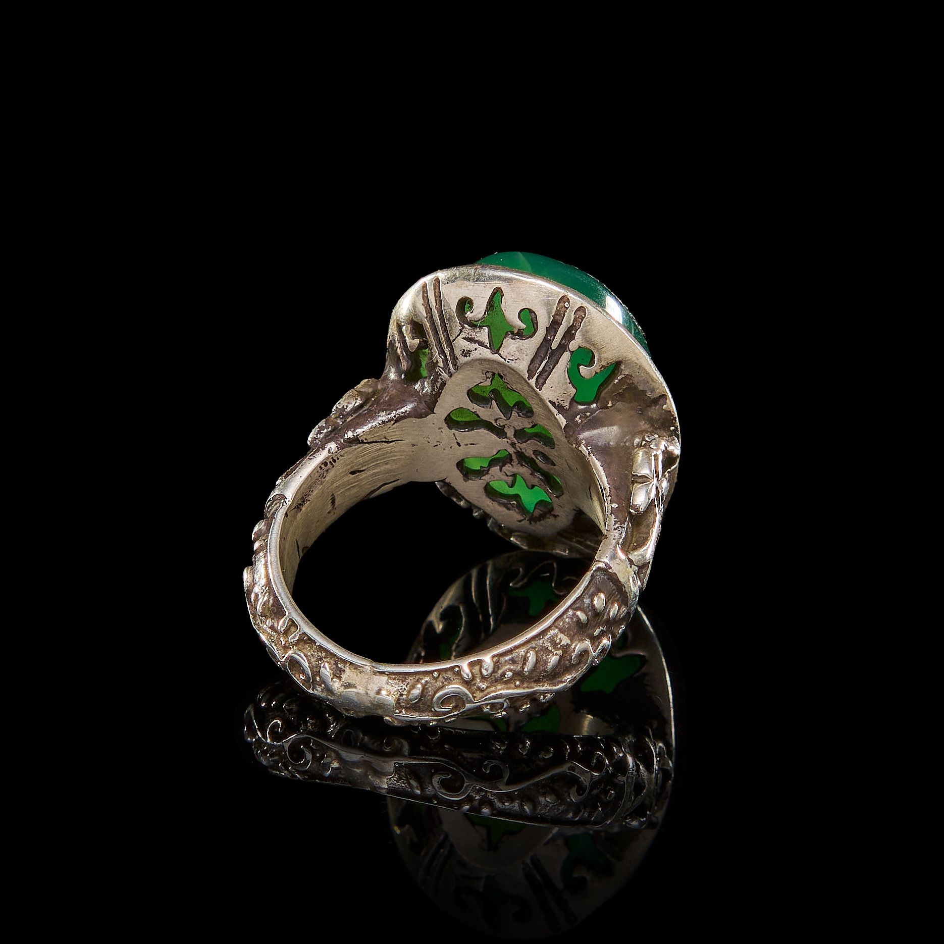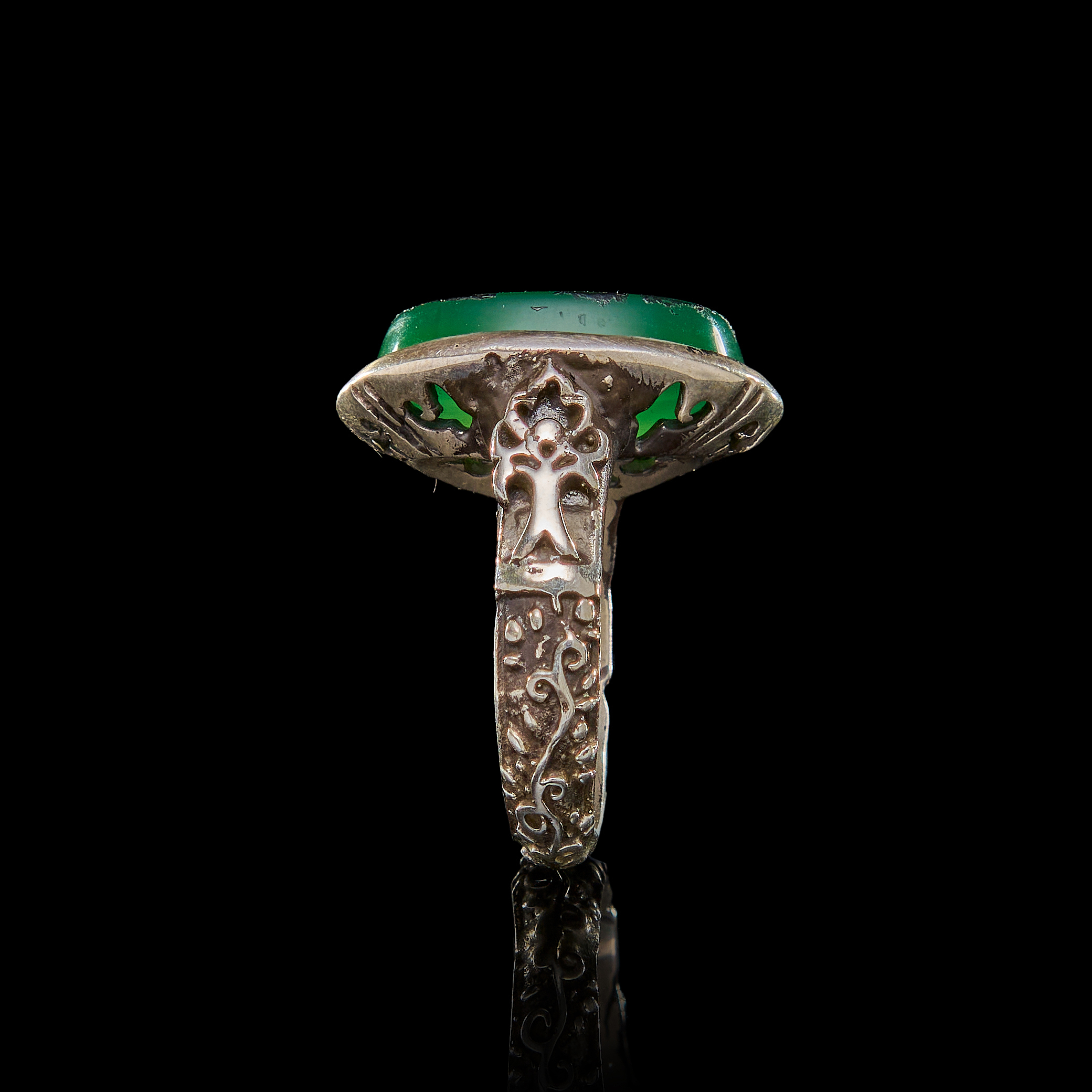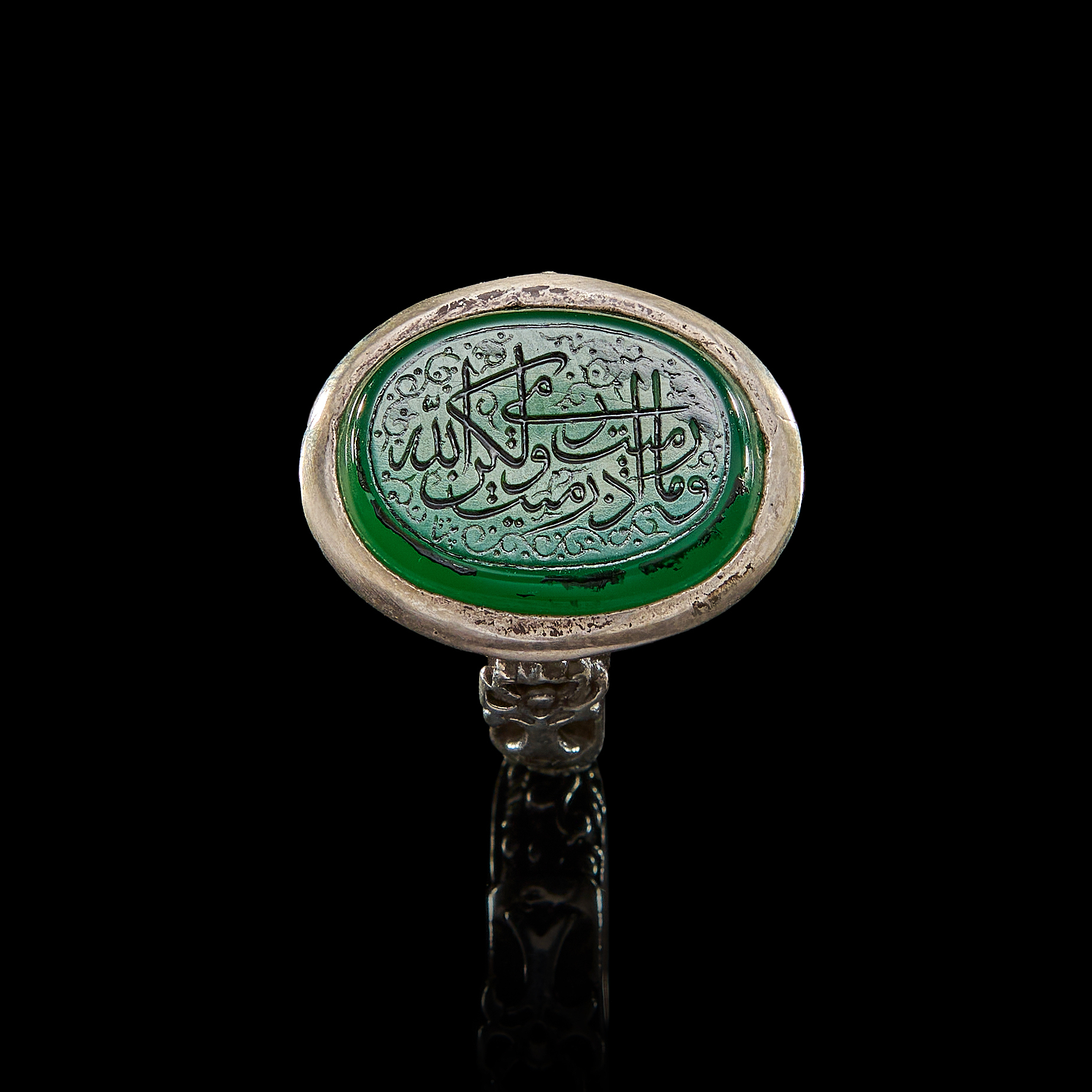 AN INSCRIBED ISLAMIC GREEN STONE IN A SILVER RING