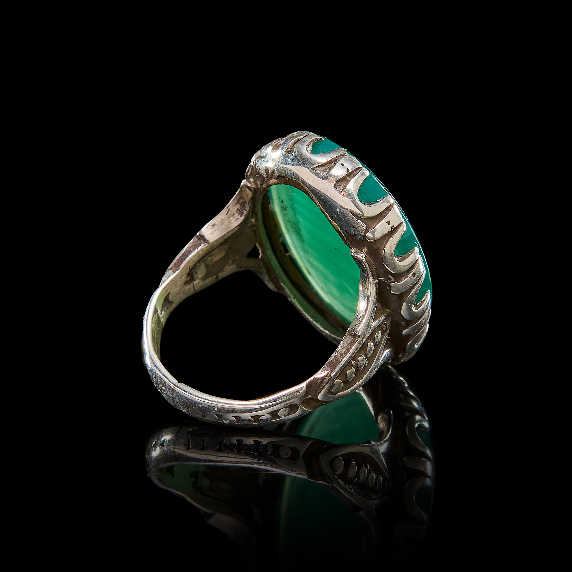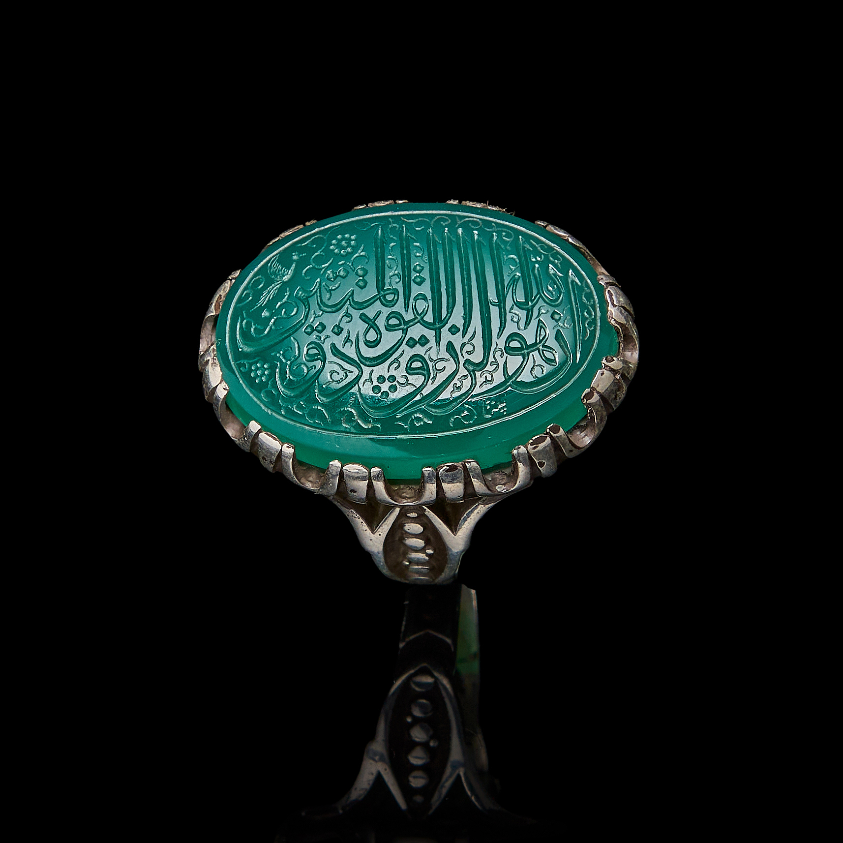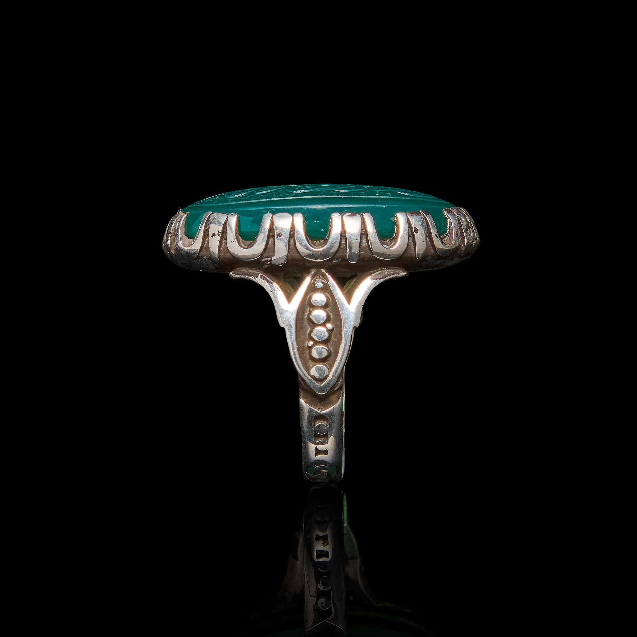 AN INSCRIBED ISLAMIC GREEN STONE IN A SILVER RING