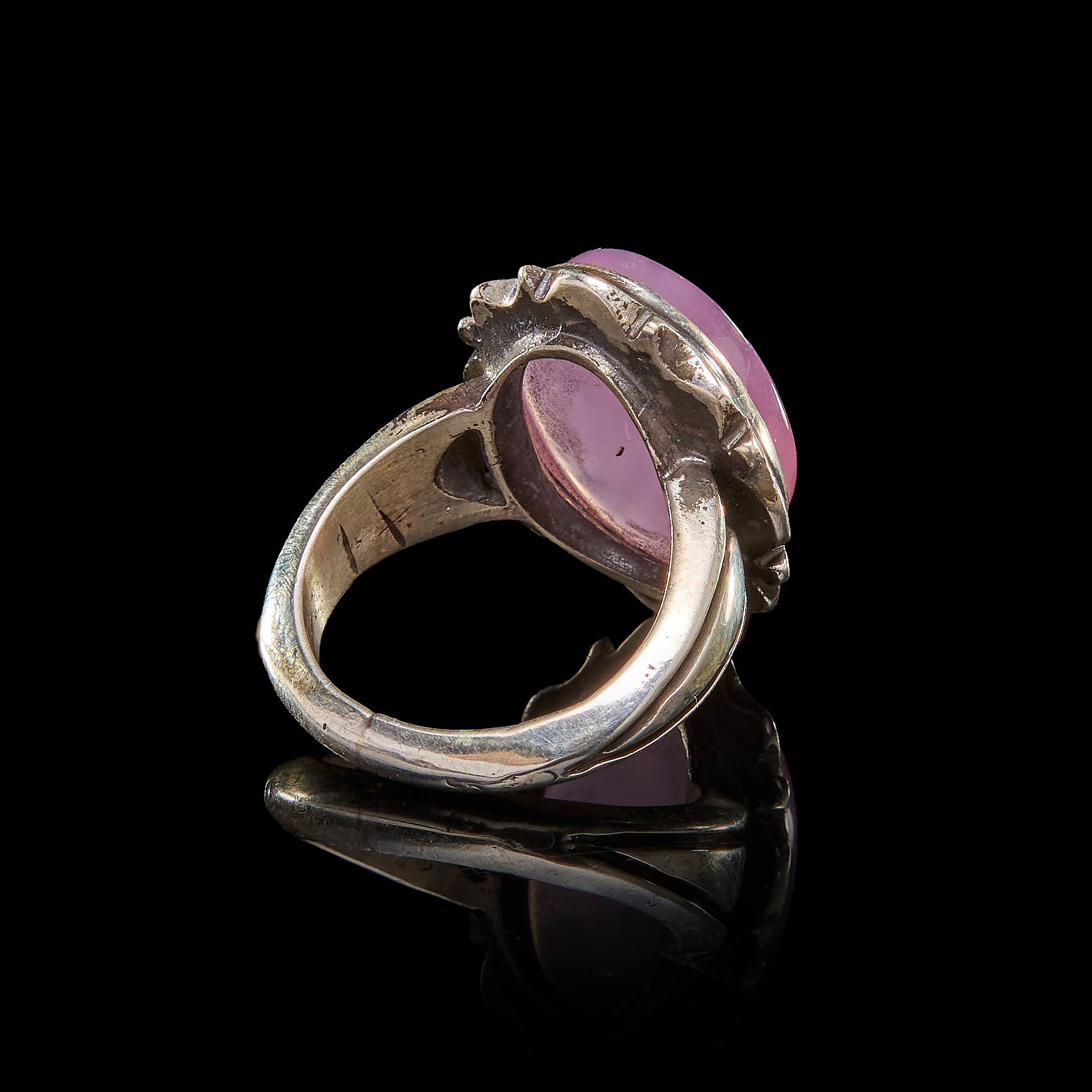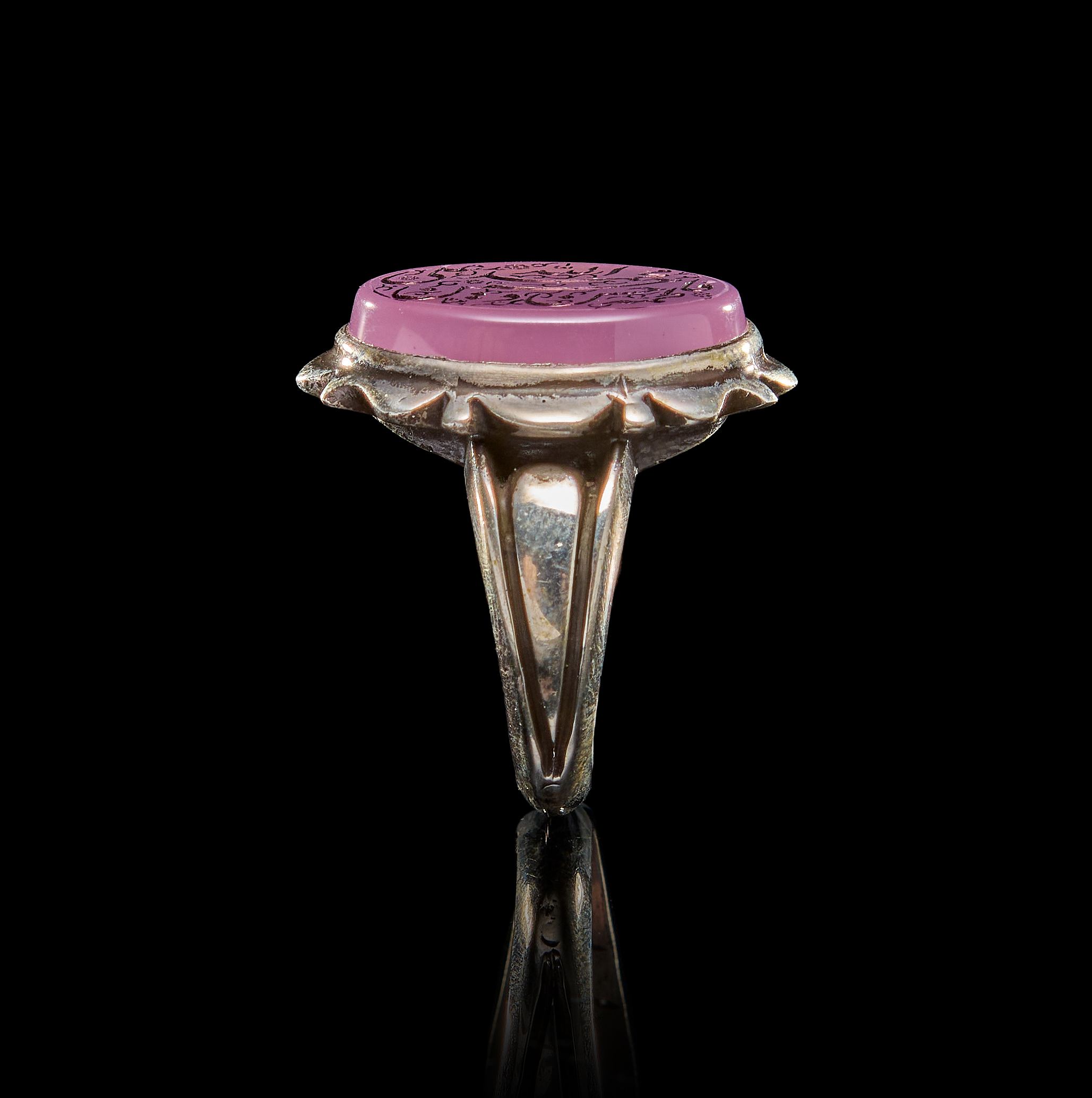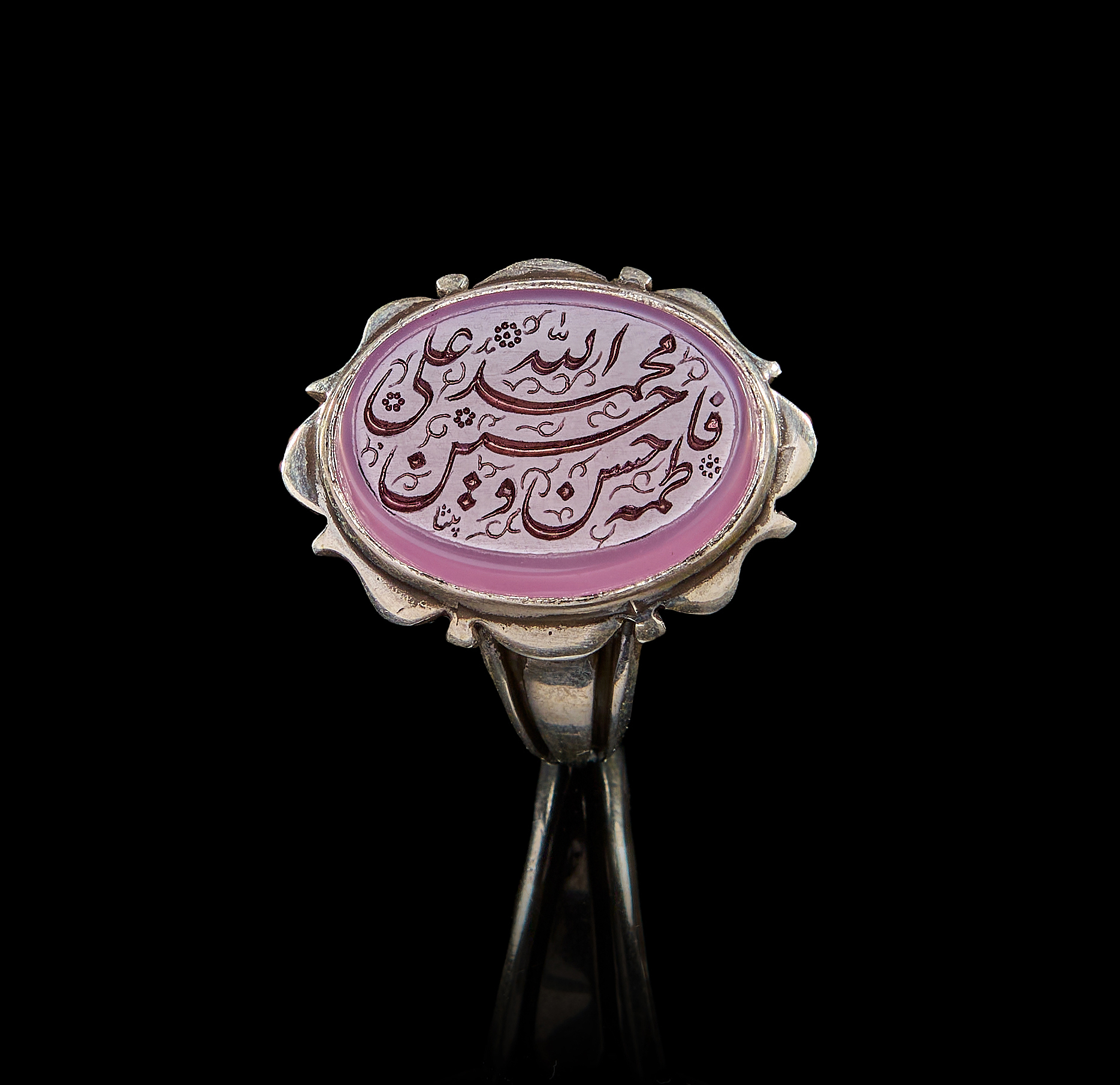 AN INSCRIBED ISLAMIC PINK STONE IN A SILVER RING
