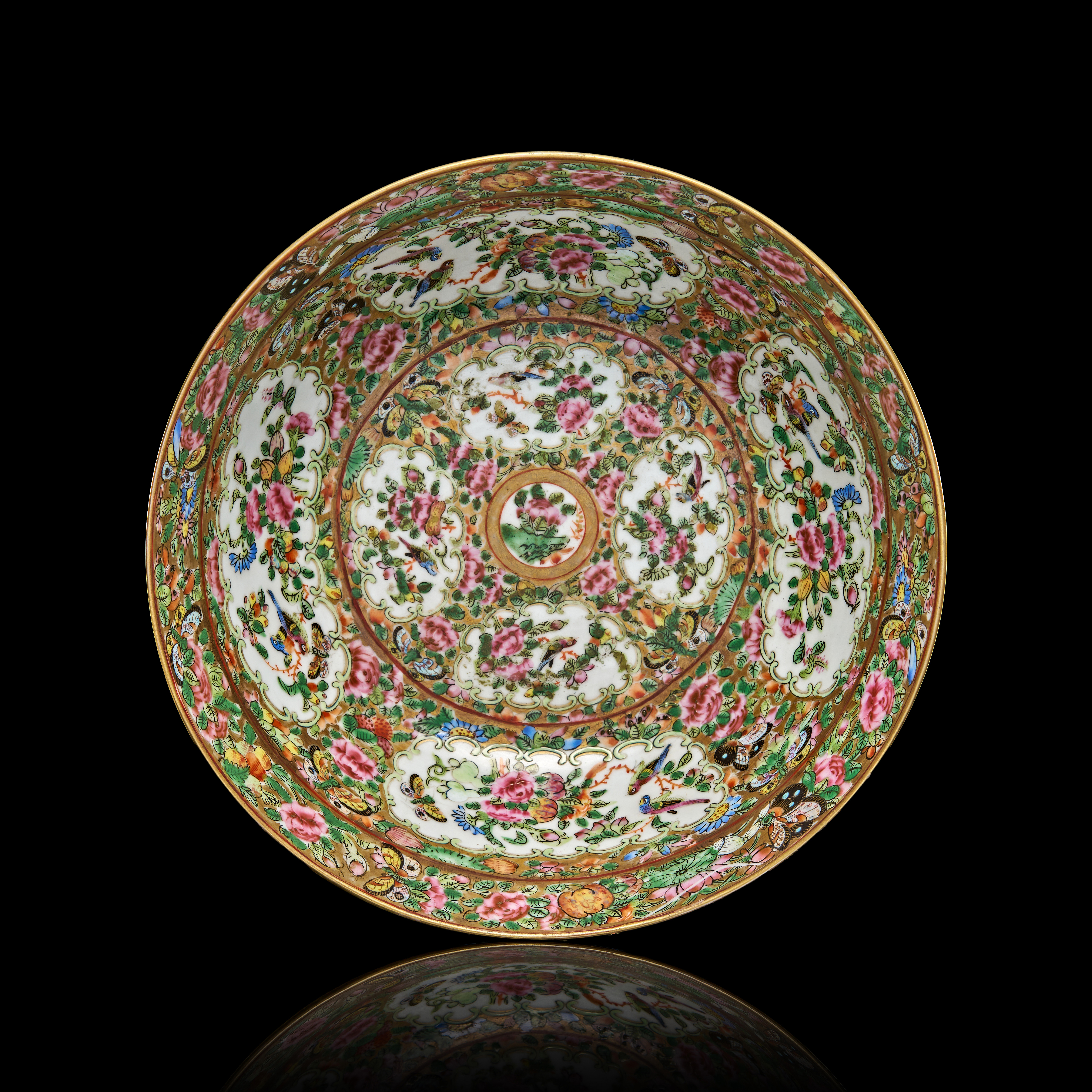 The interior is richly decorated with a dense floral pattern radiating from the centre, incorporating vivid colours such as pink, green, and blue, accentuated by gold.