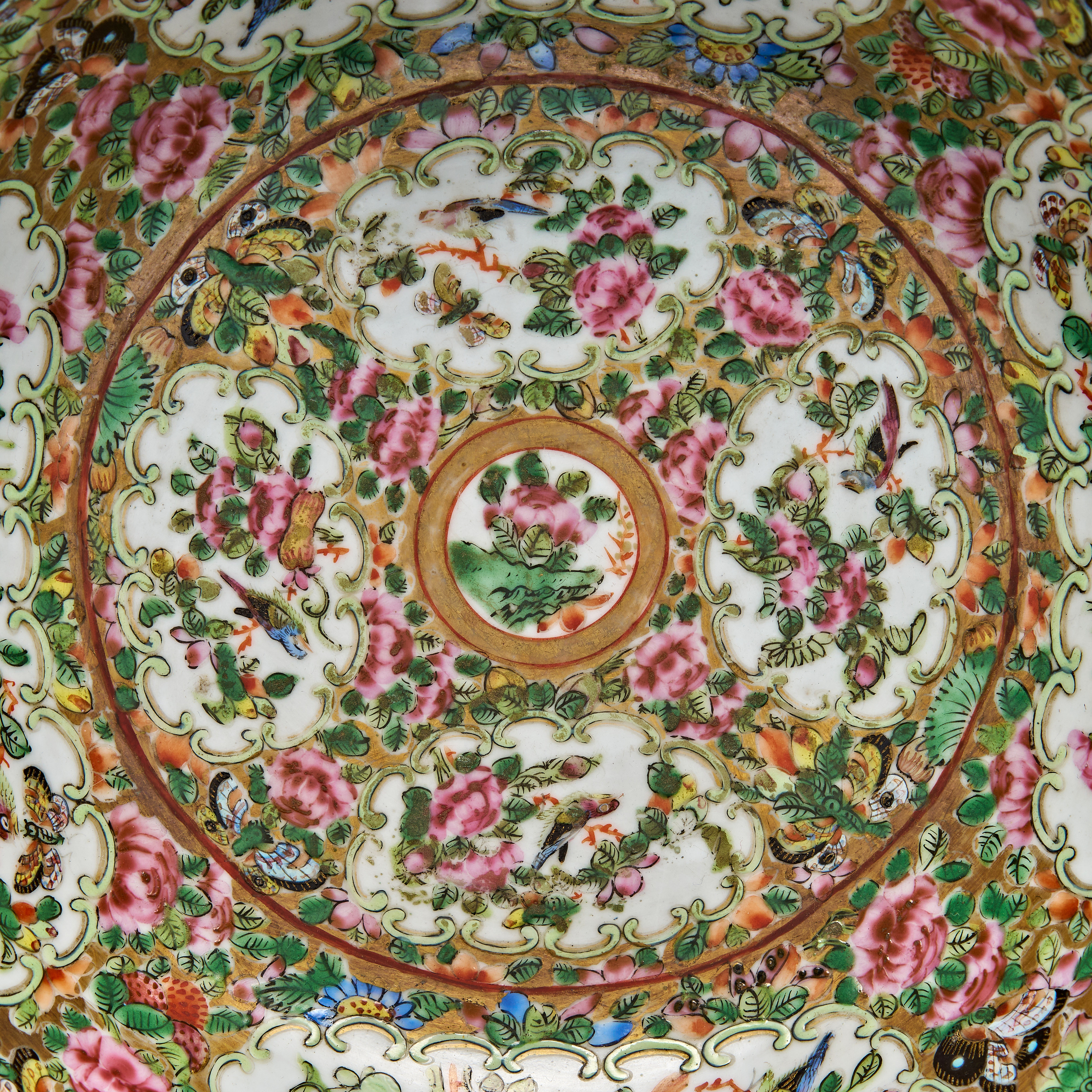 The bowl is finely decorated with intricate floral motifs, including vibrant pink roses, green foliage, and butterflies on a predominantly white background. Gold accents highlight the detailed patterns.