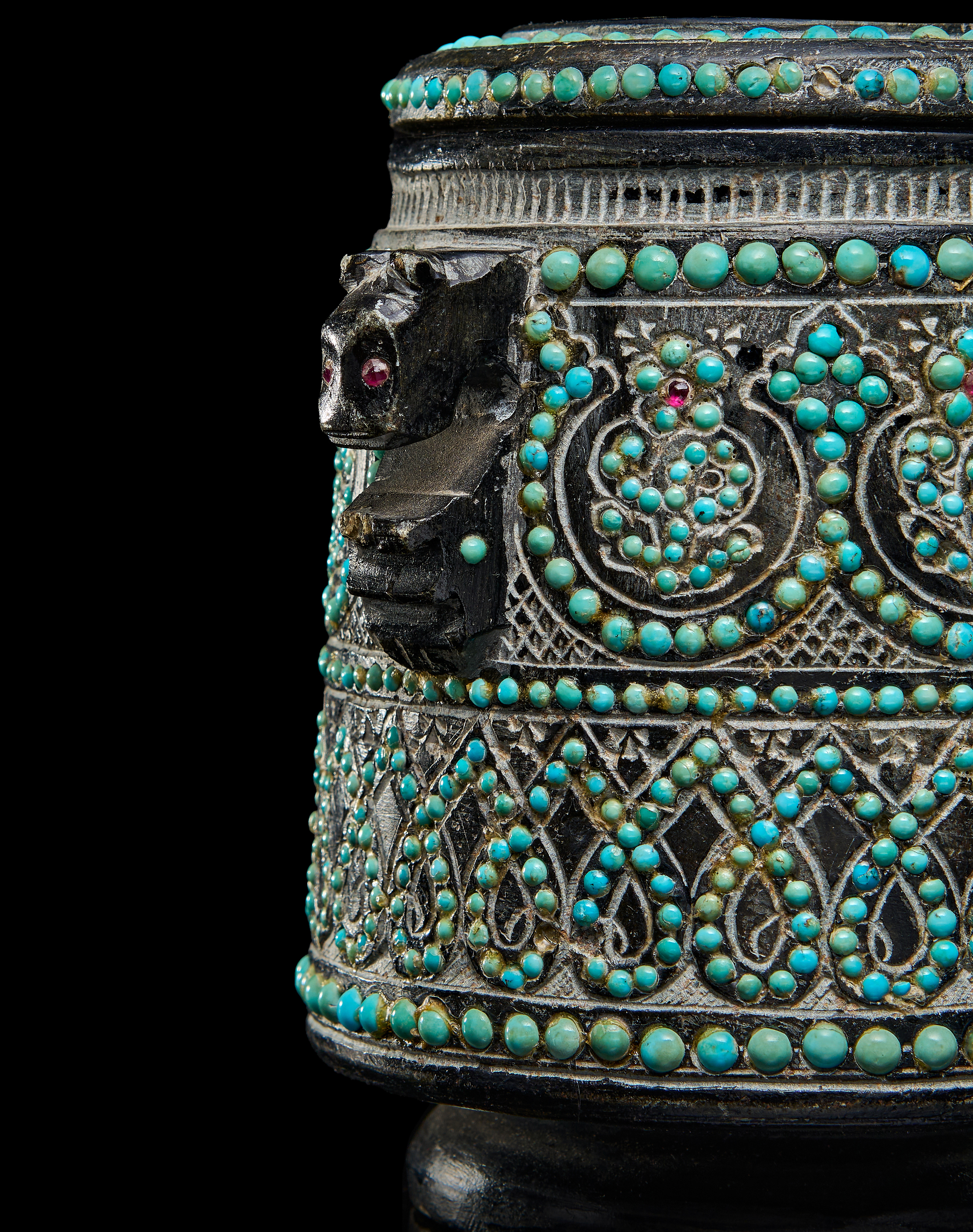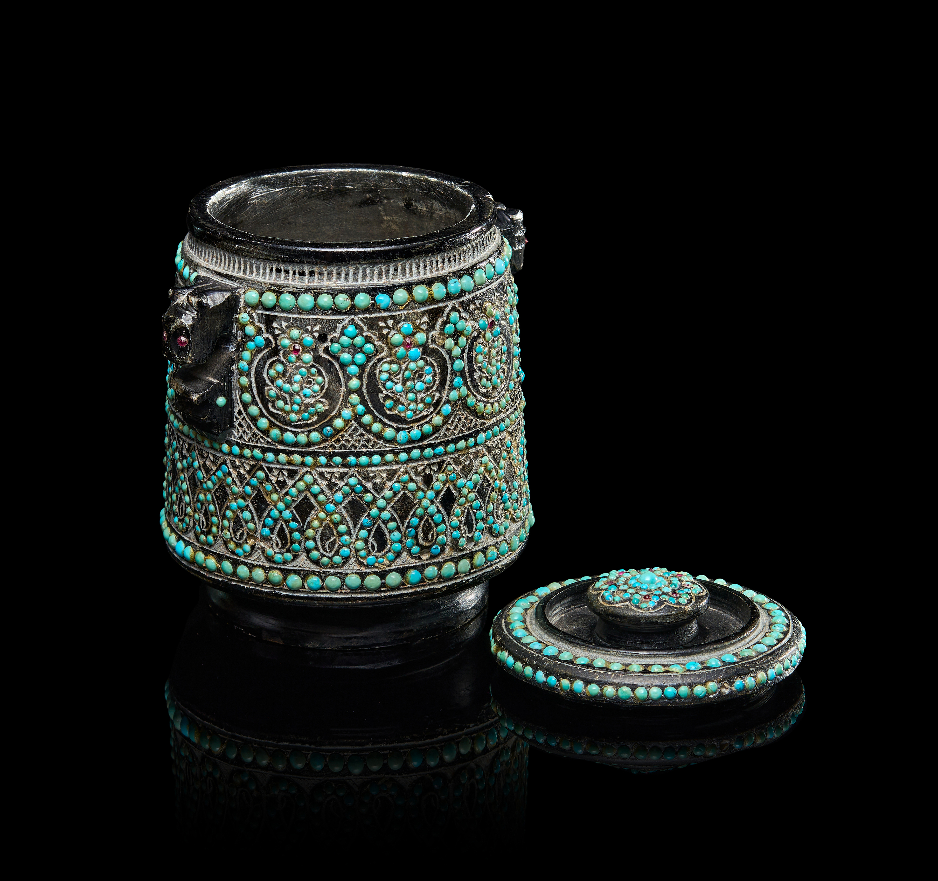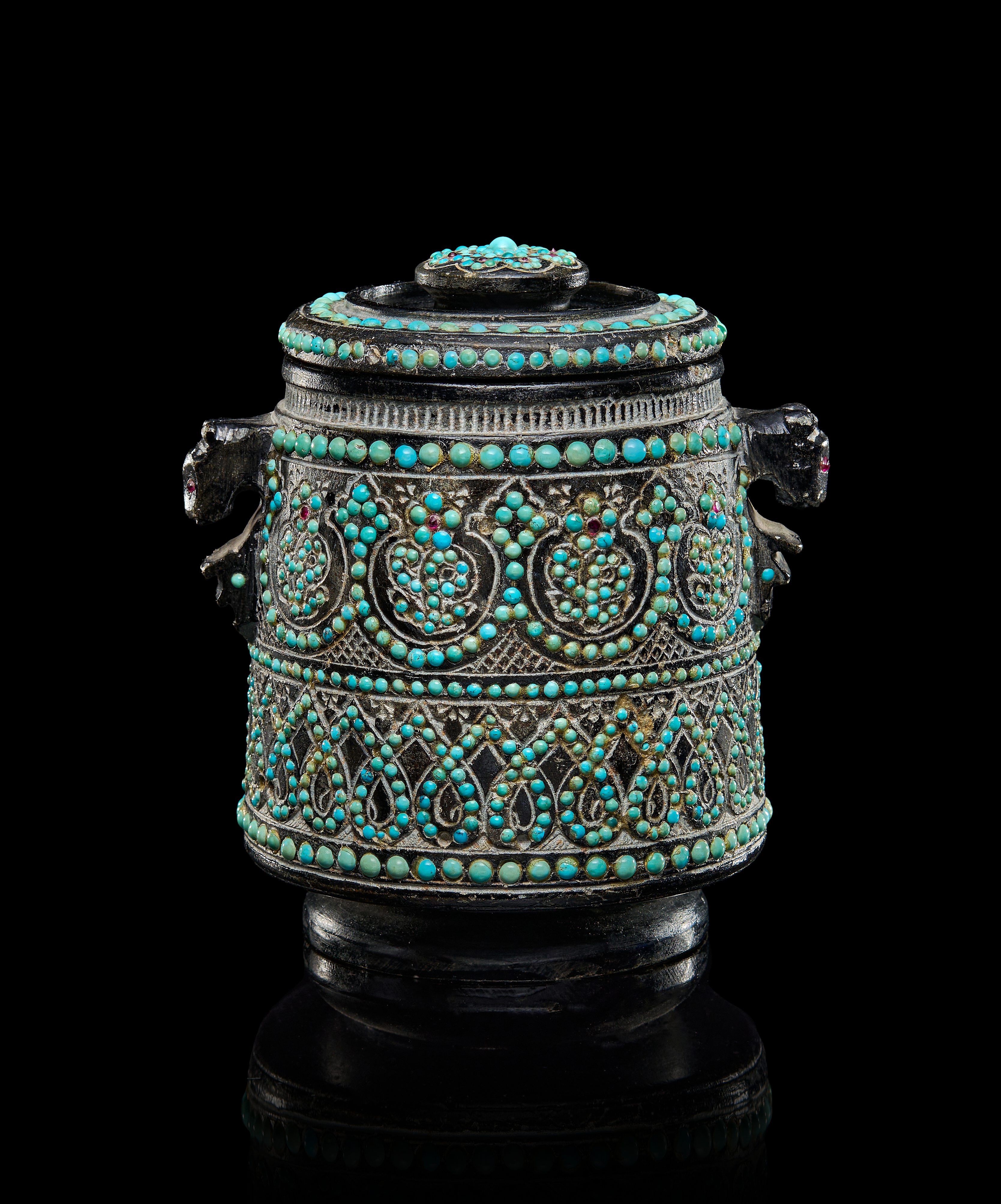 A RARE QAJAR TURQUOISE INSET CARVED STONE TEA CADDY, PERSIA, 19TH CENTURY