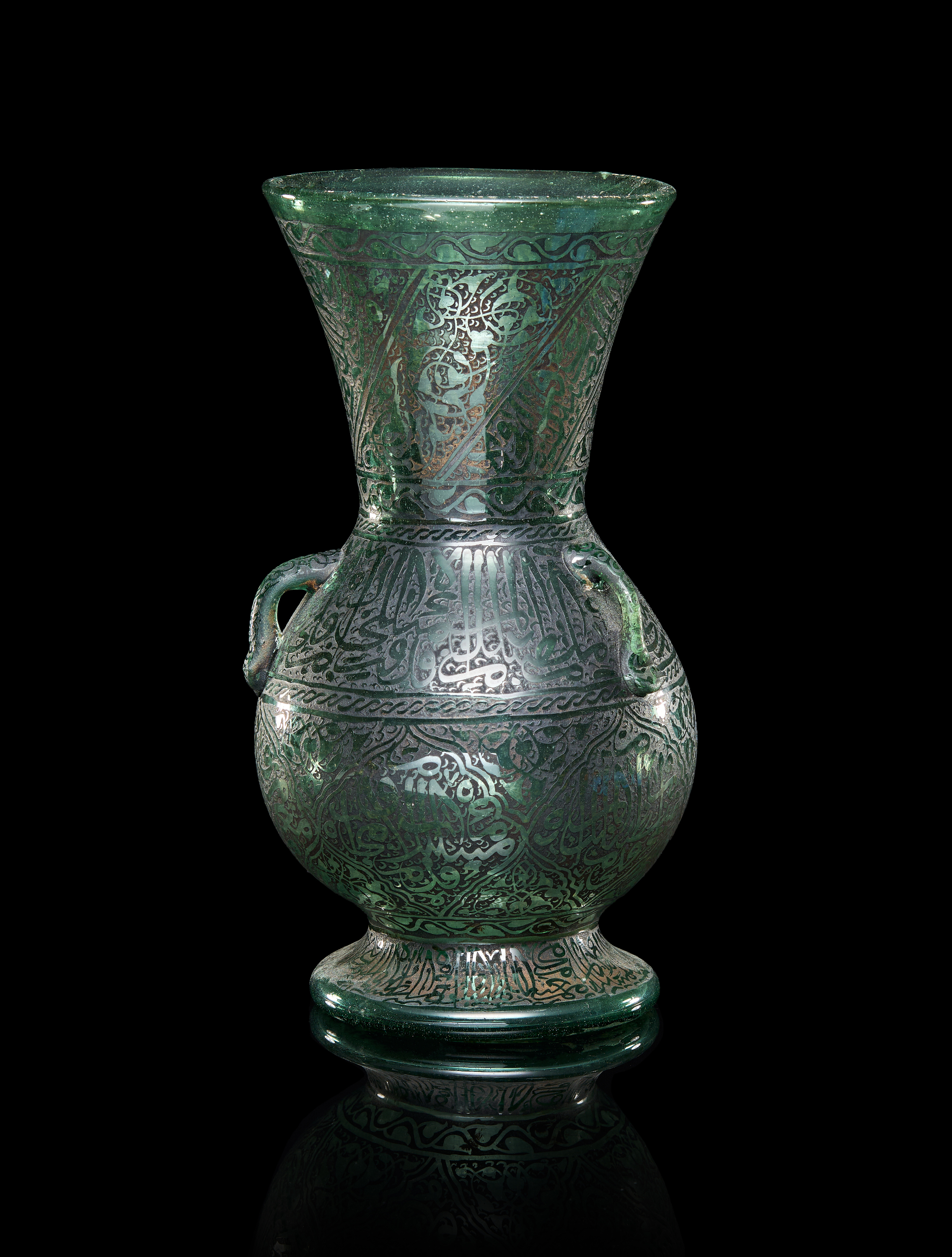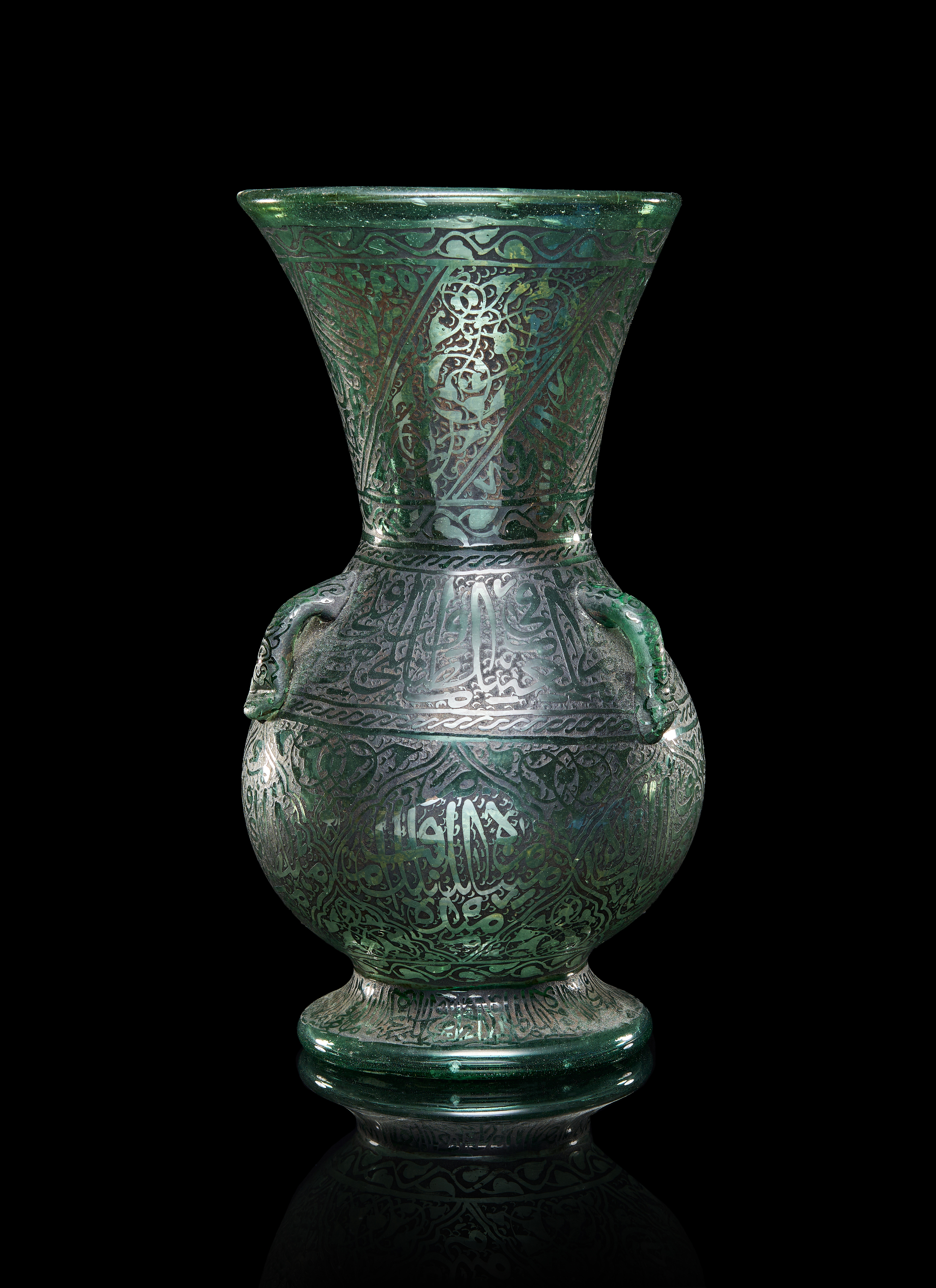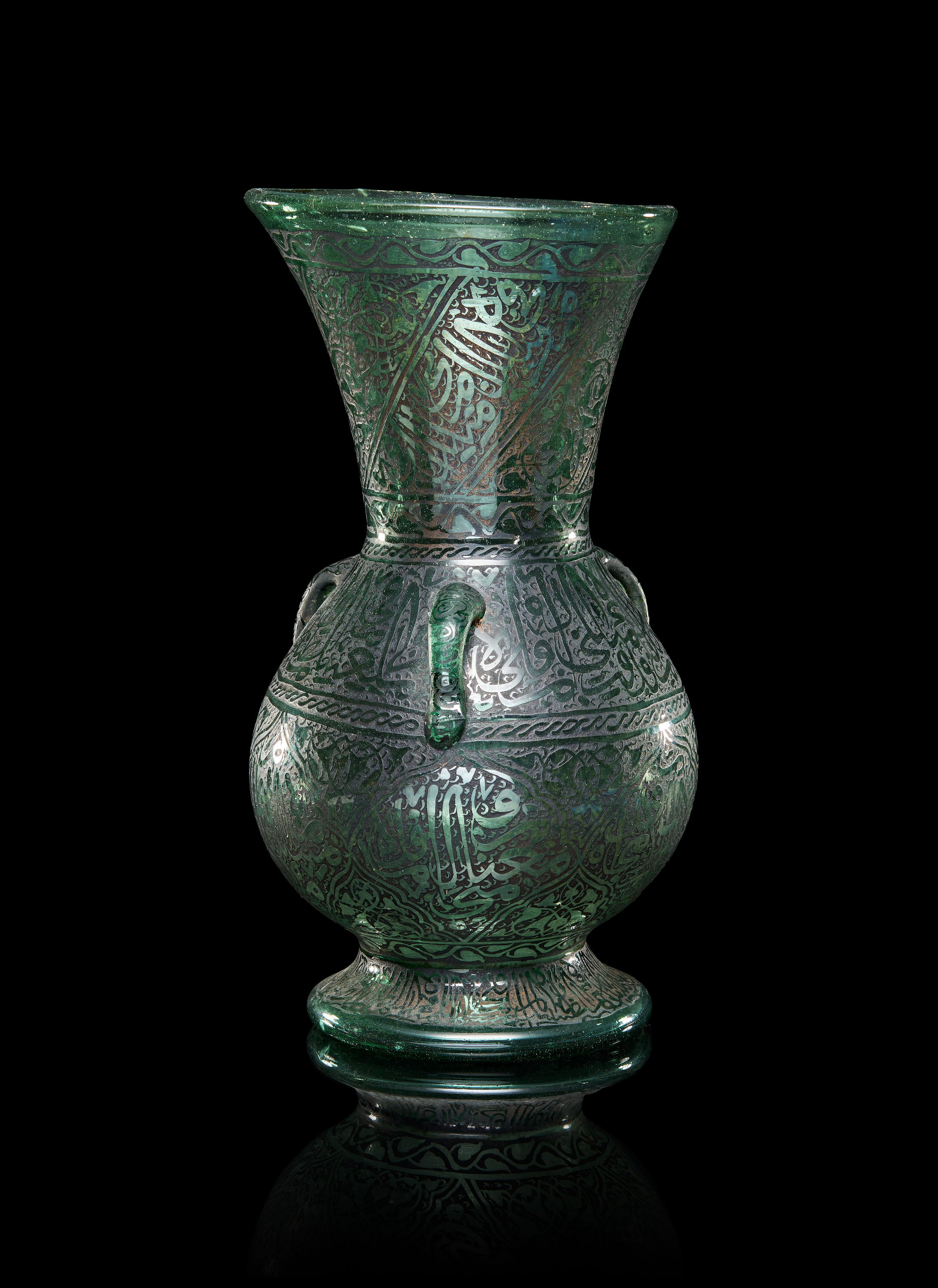 A GREEN ISLAMIC GLASS MOSQUE OIL LAMP, LATE 19TH – EARLY 20TH CENTURY
