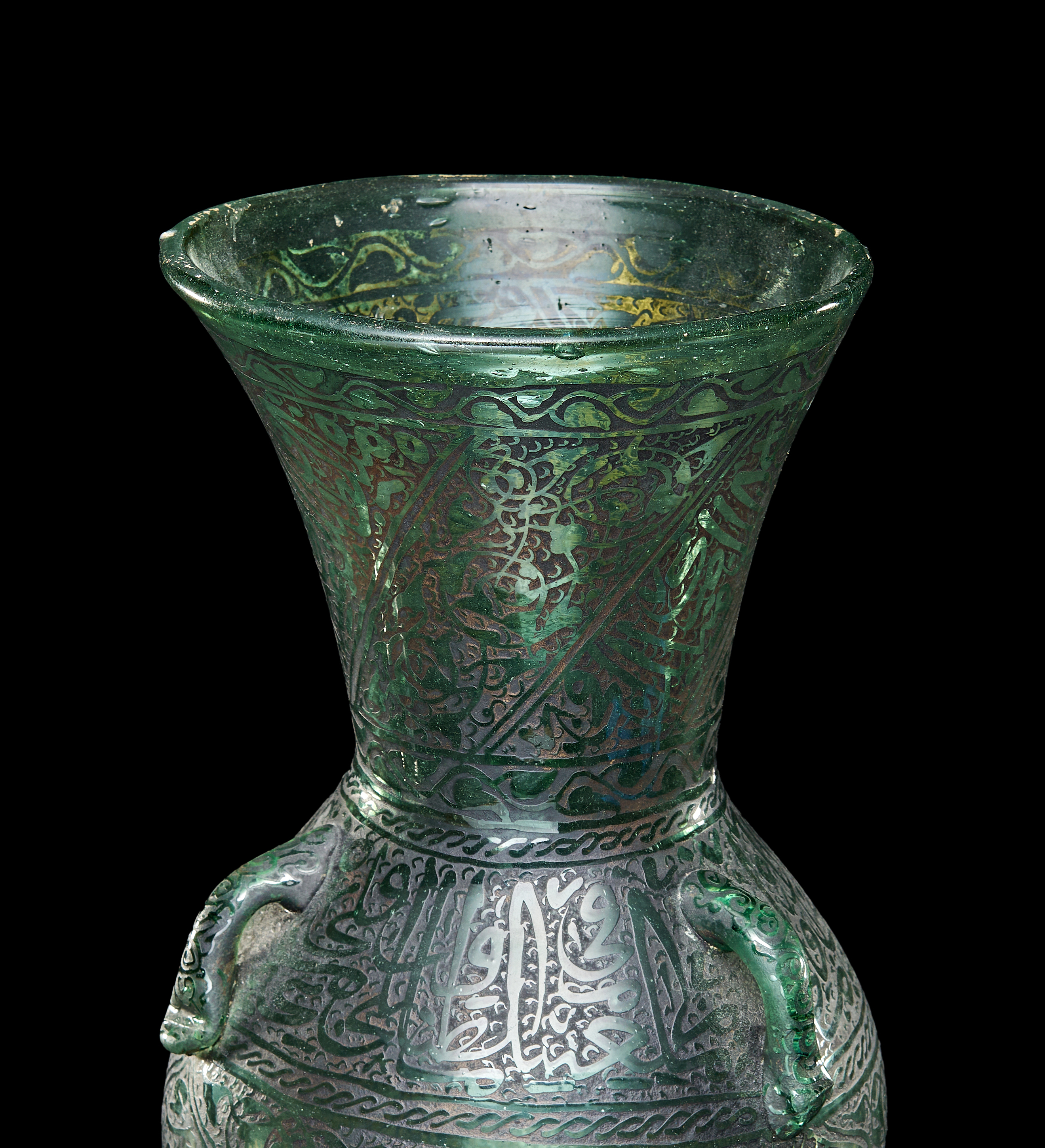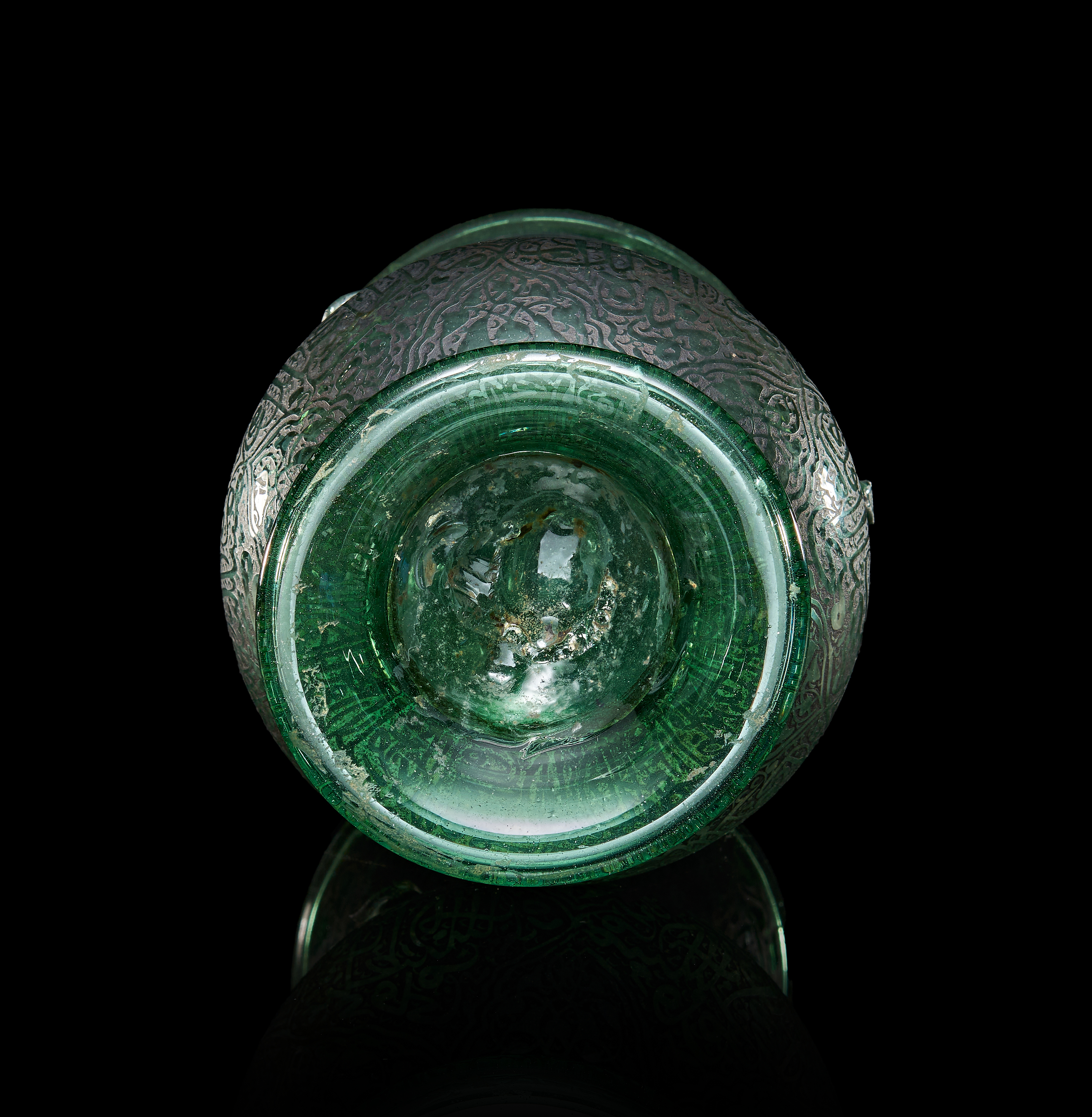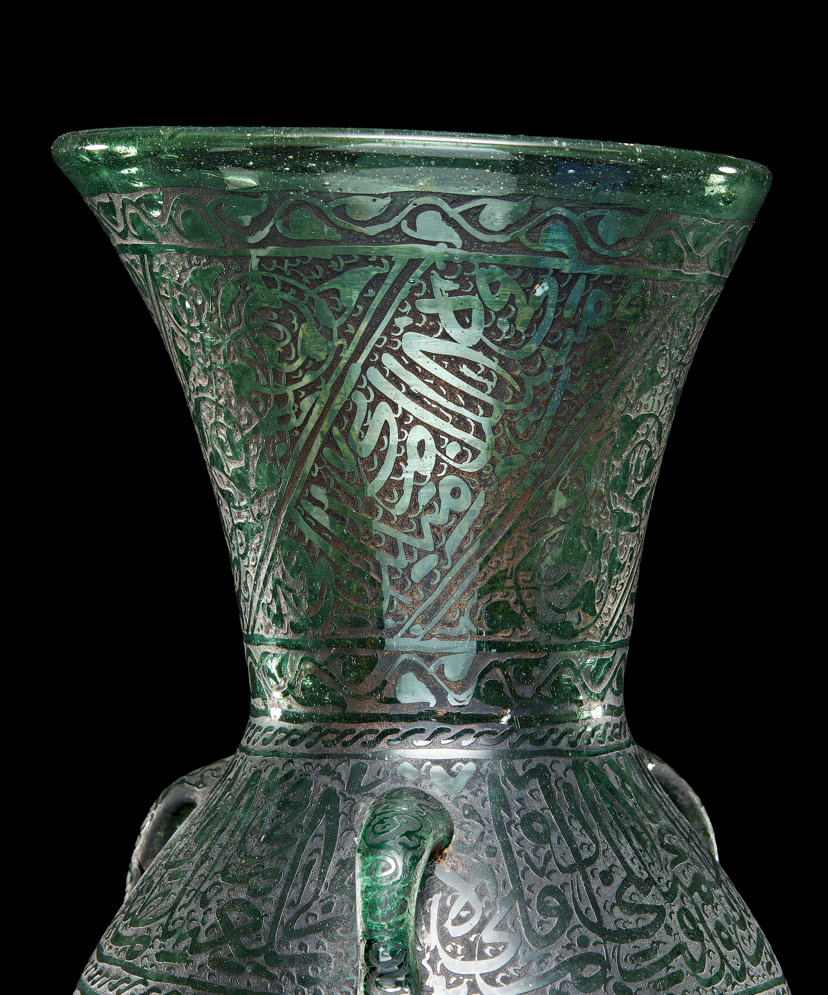 A GREEN ISLAMIC GLASS MOSQUE OIL LAMP, LATE 19TH – EARLY 20TH CENTURY
