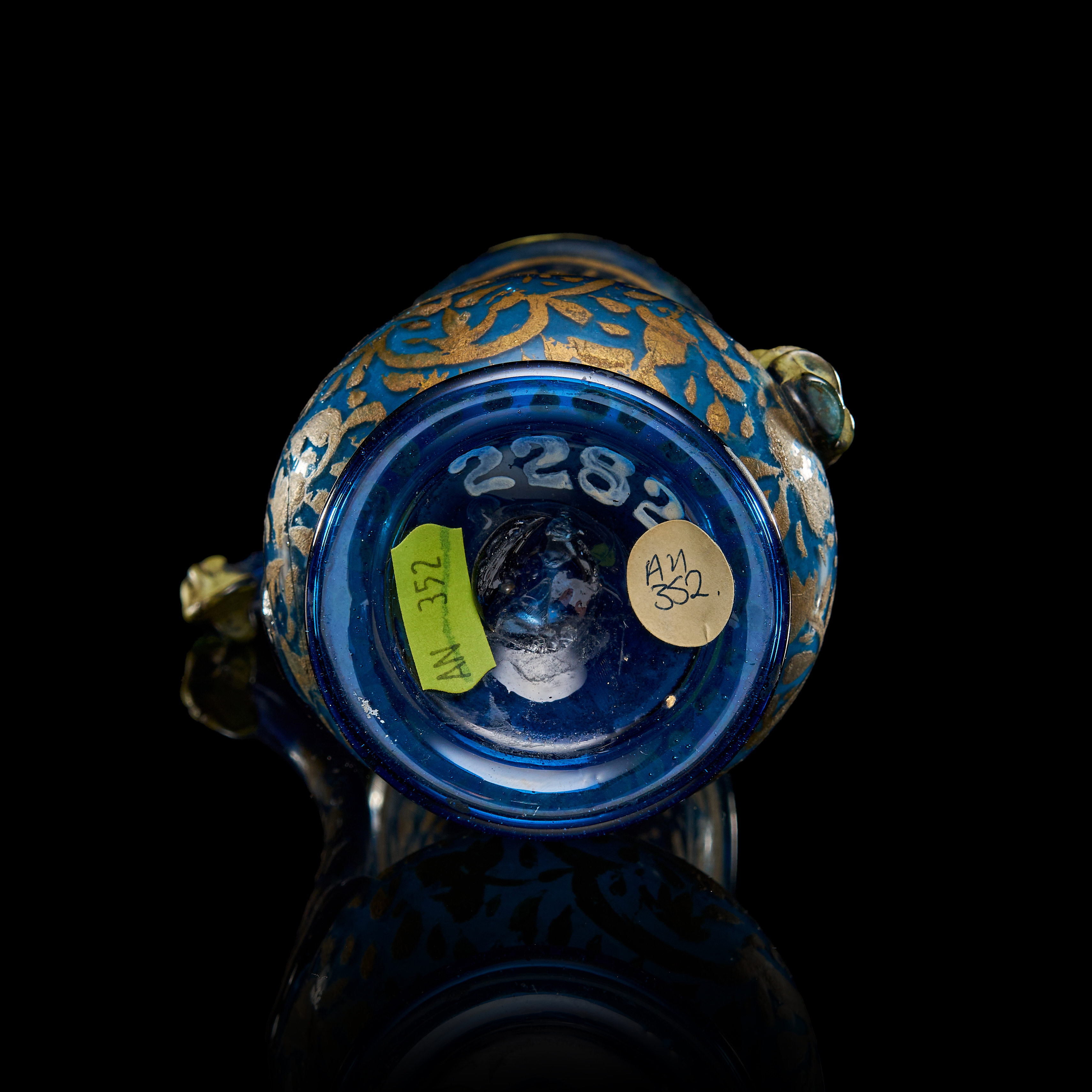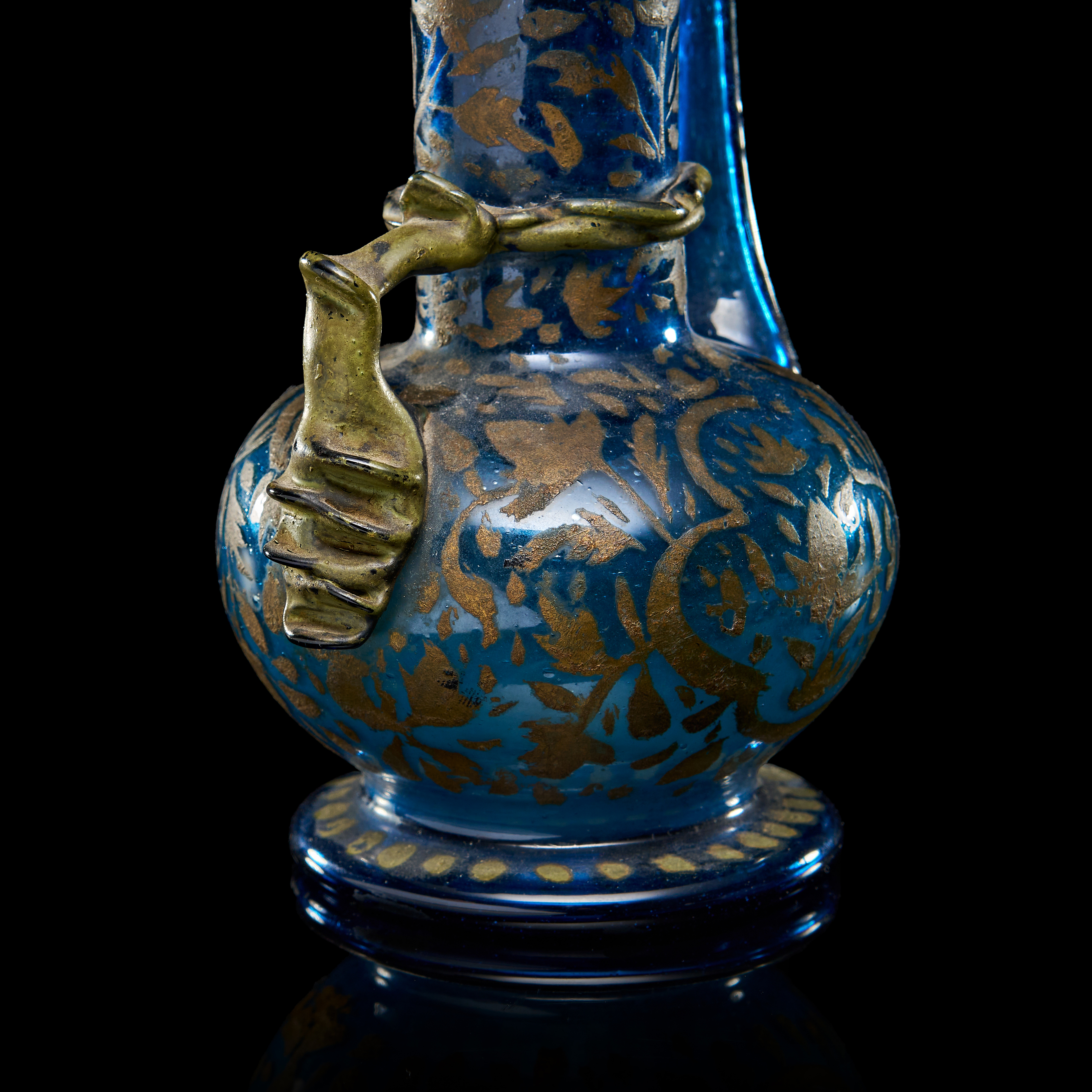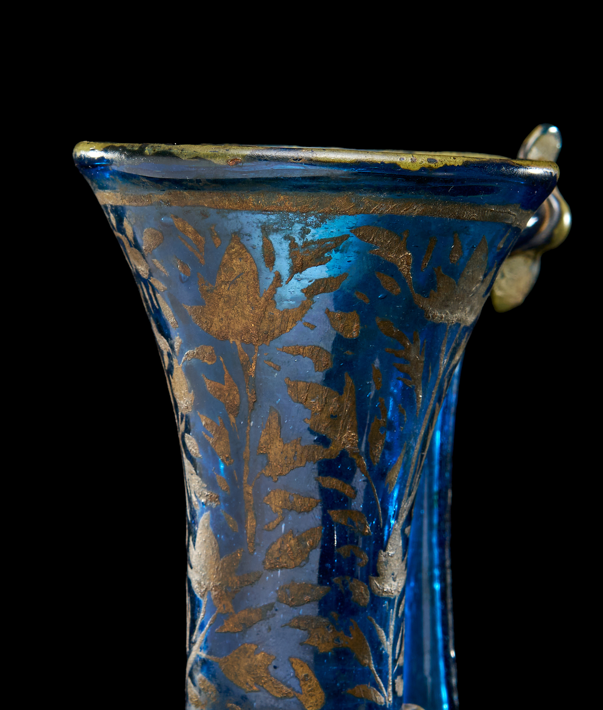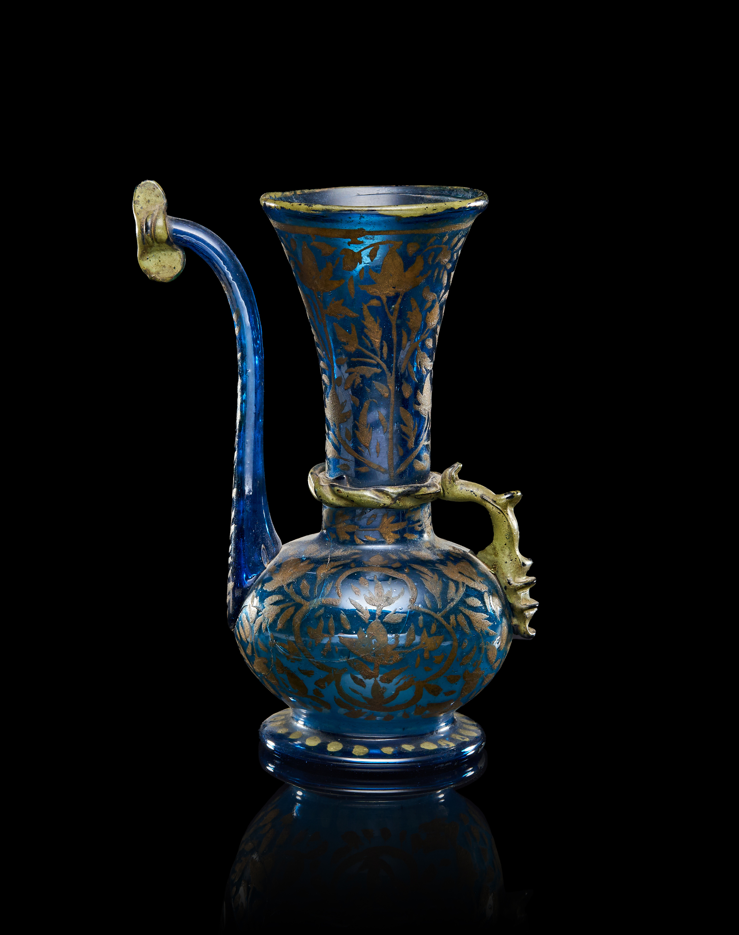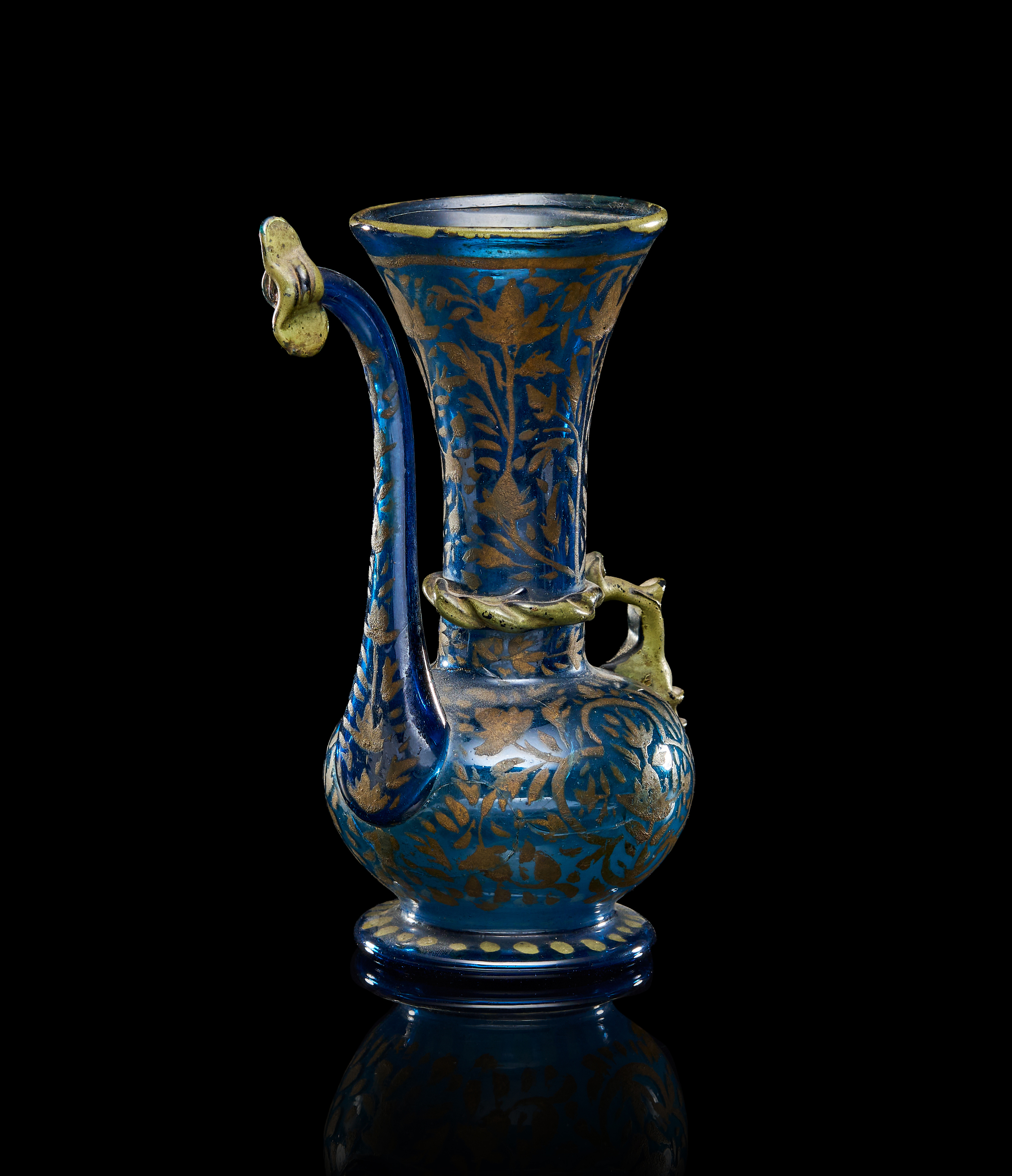A BLUE GLASS AND GOLD GILDING ISLAMIC EWER, SAFAVID, 17TH CENTURY