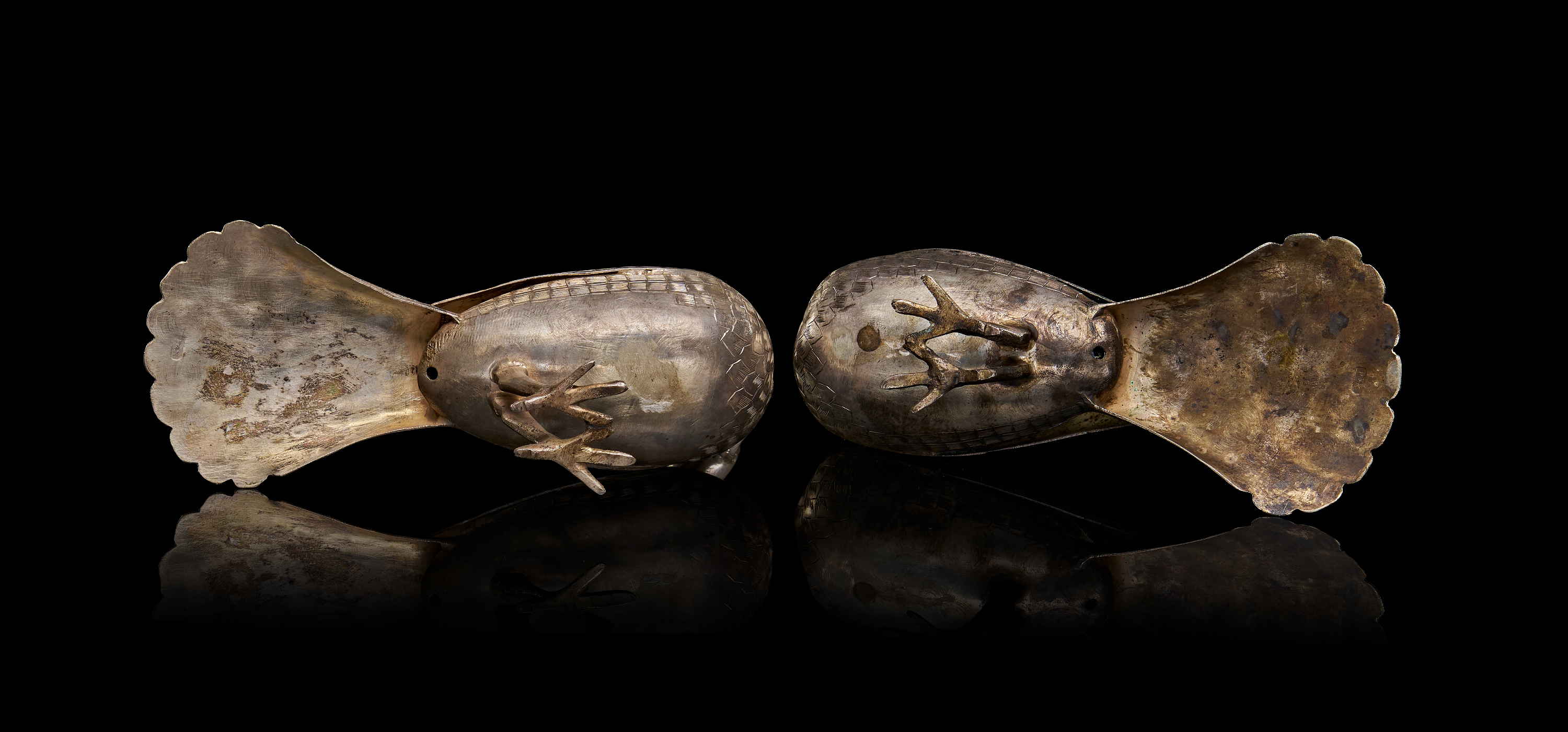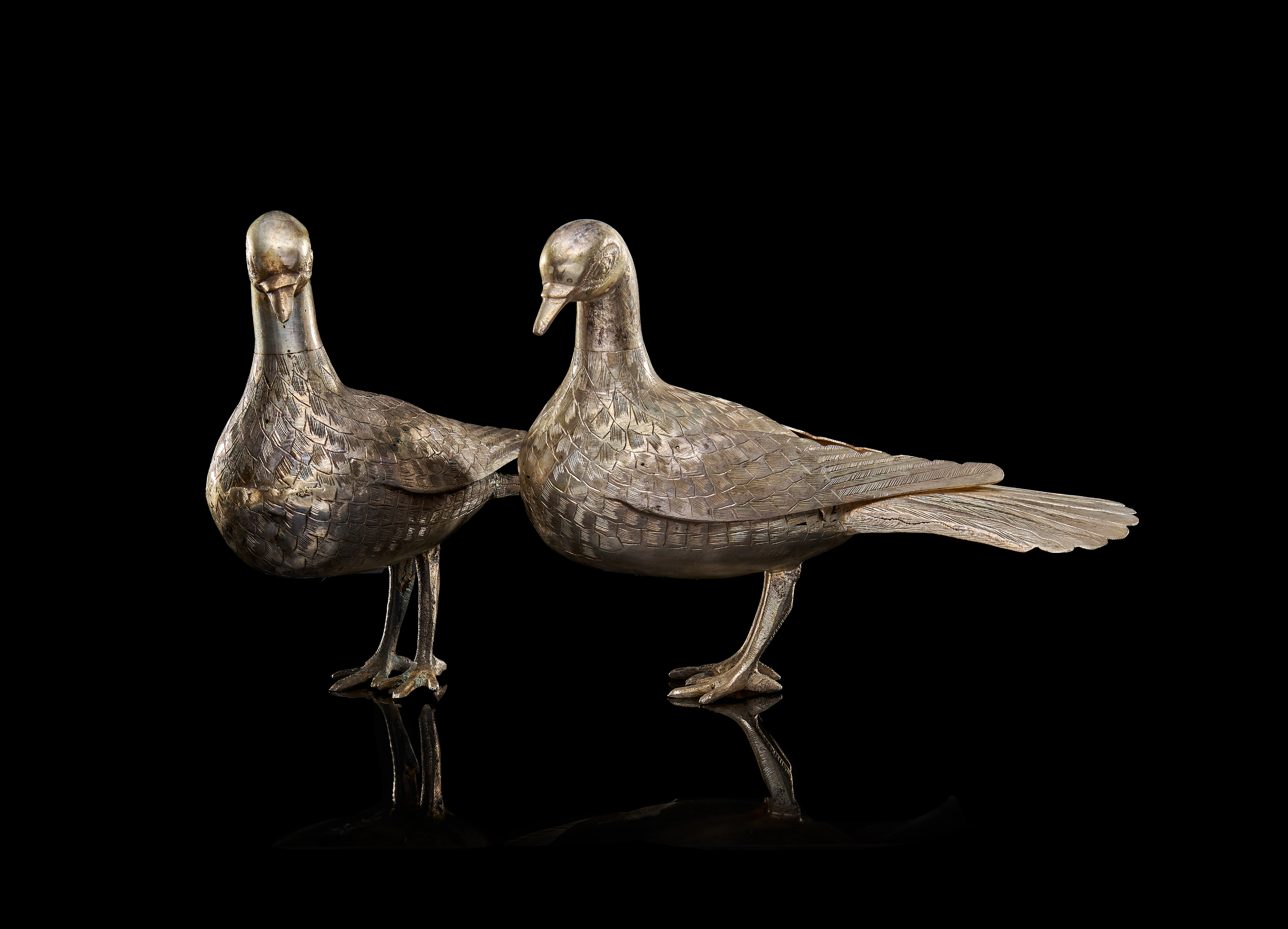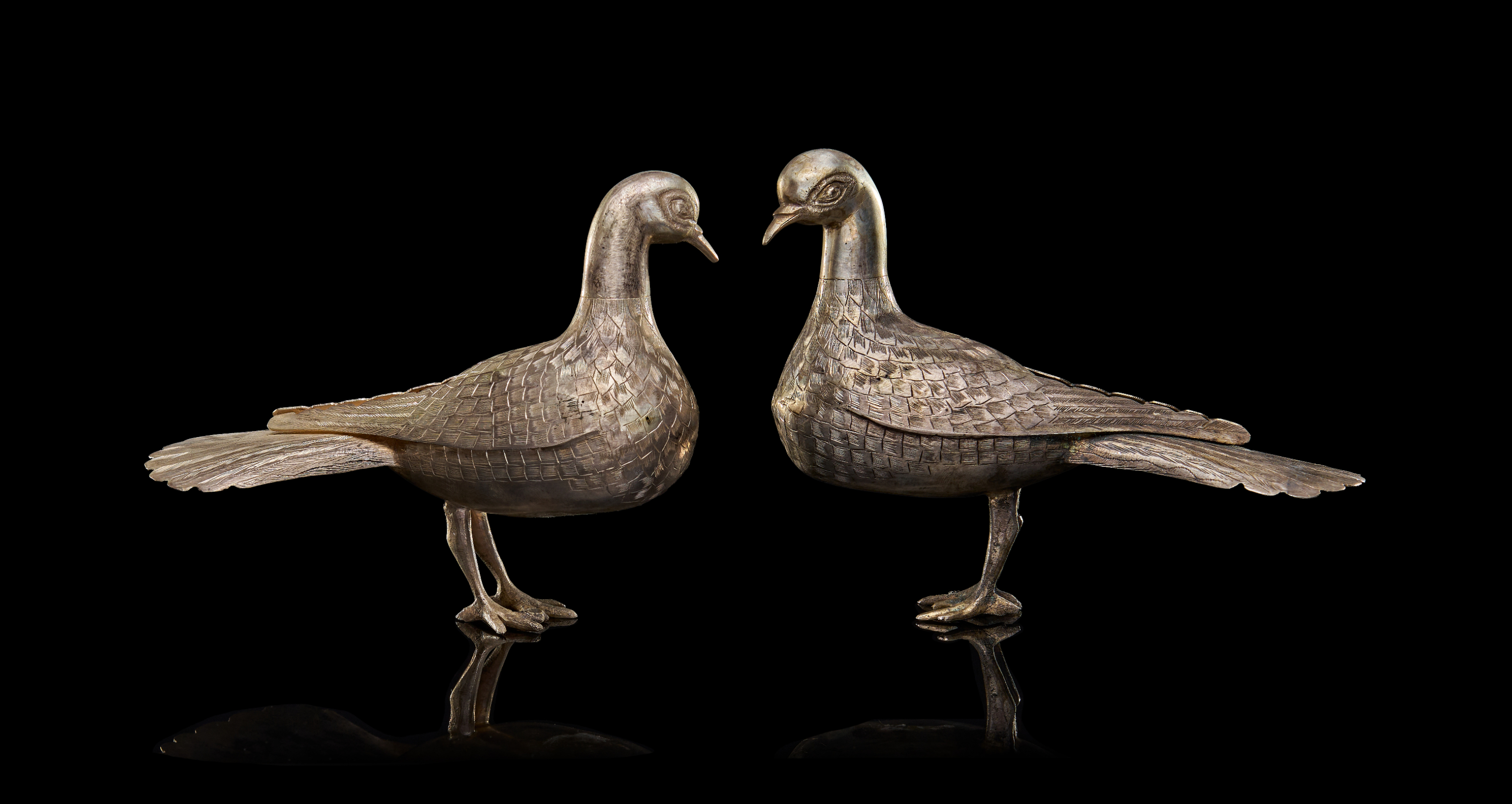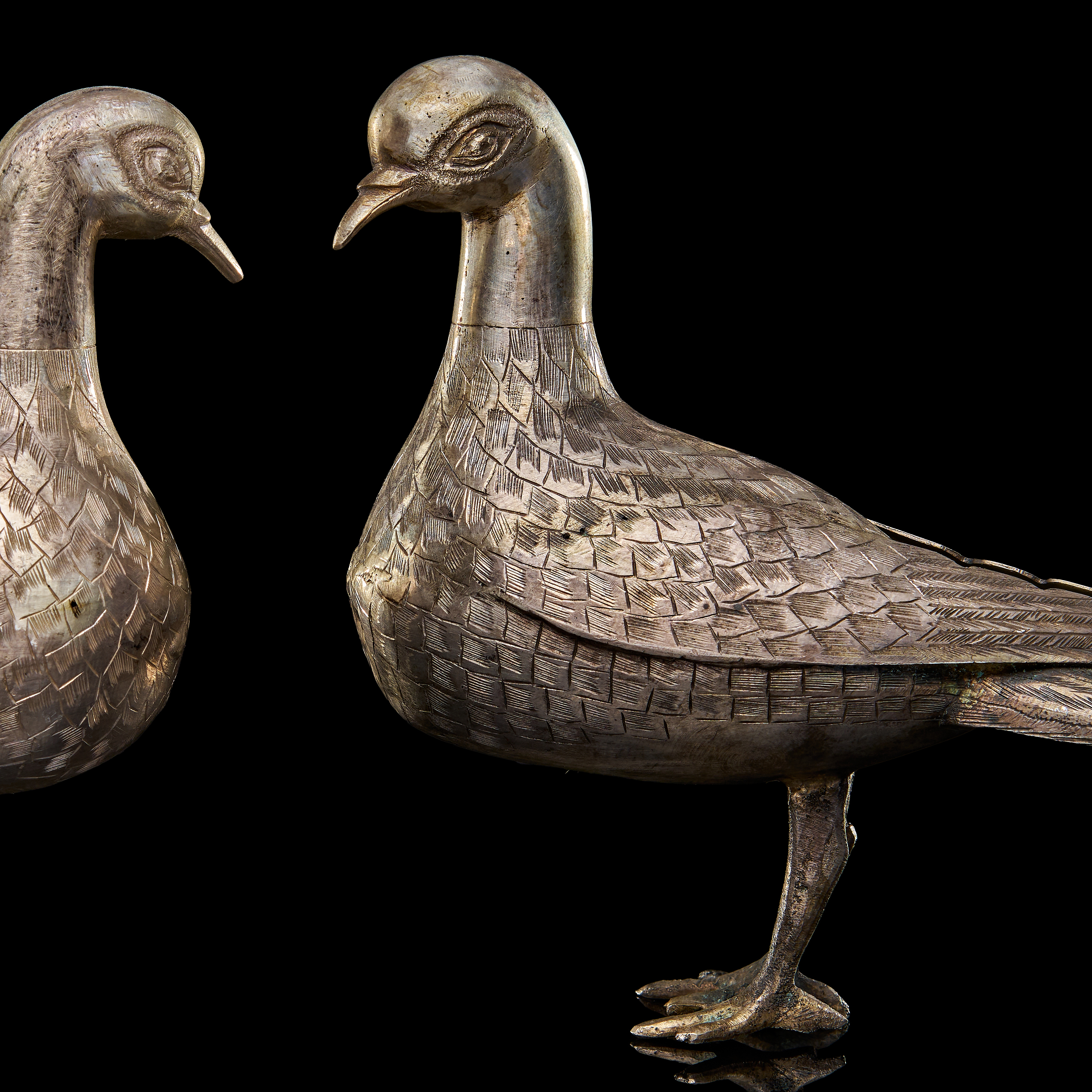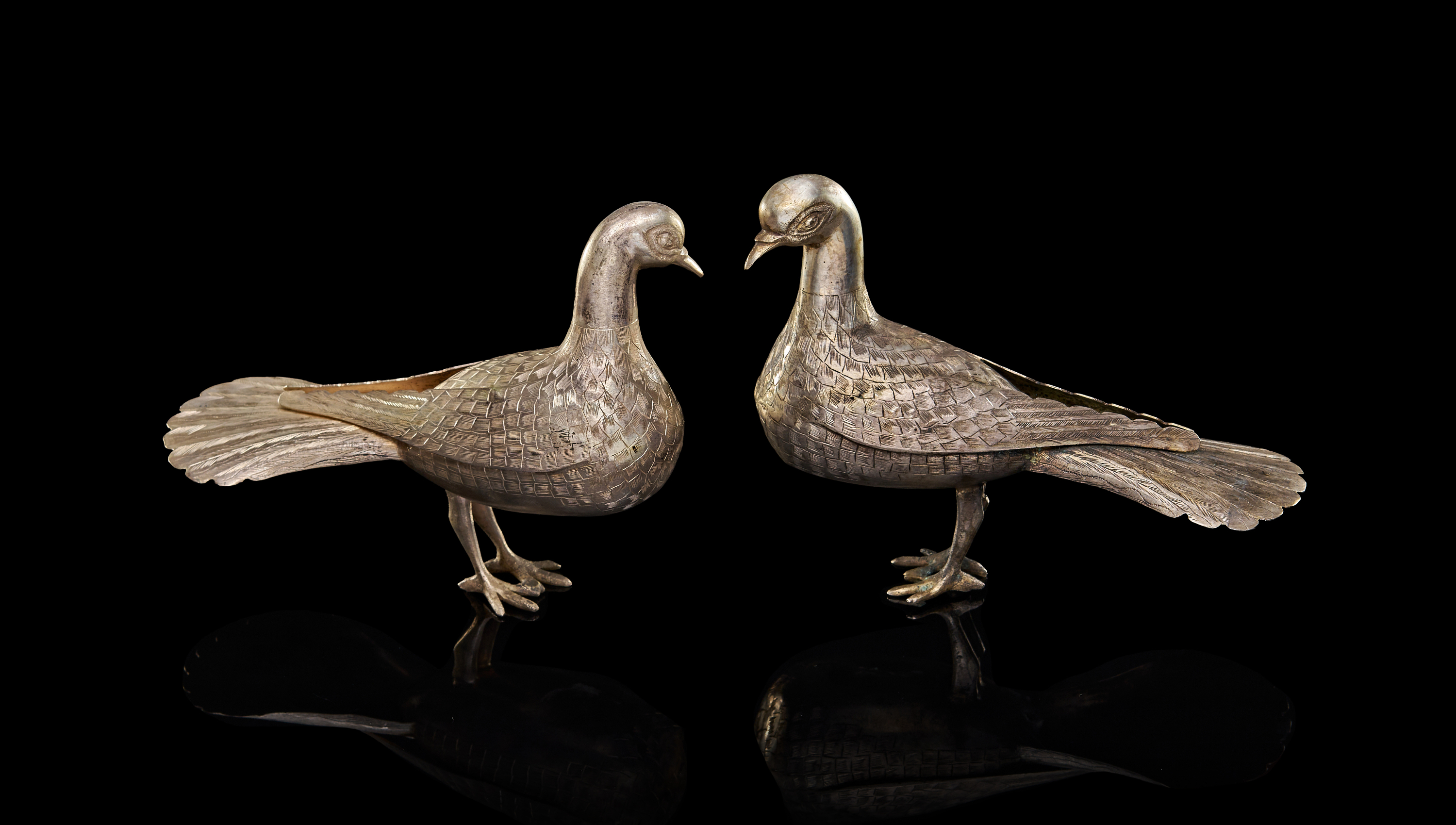 A PAIR OF SILVER PERSIAN BIRDS, 20TH CENTURY