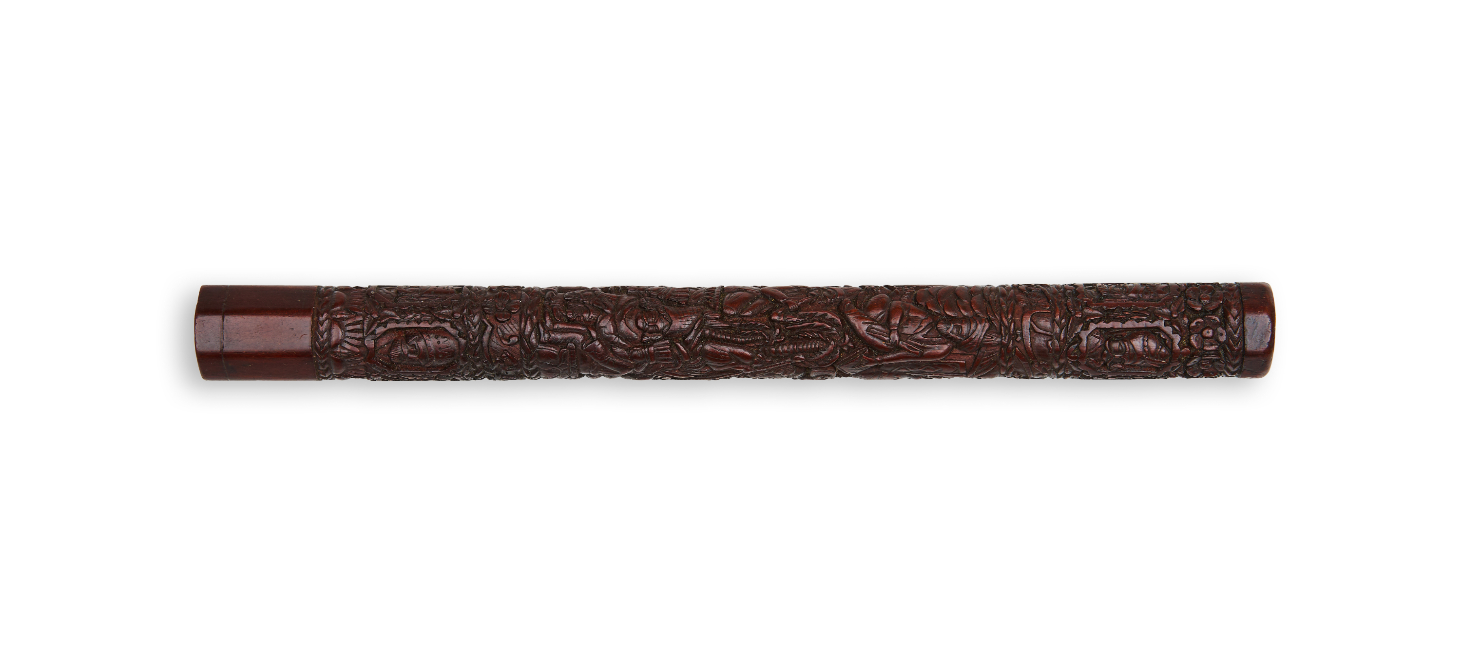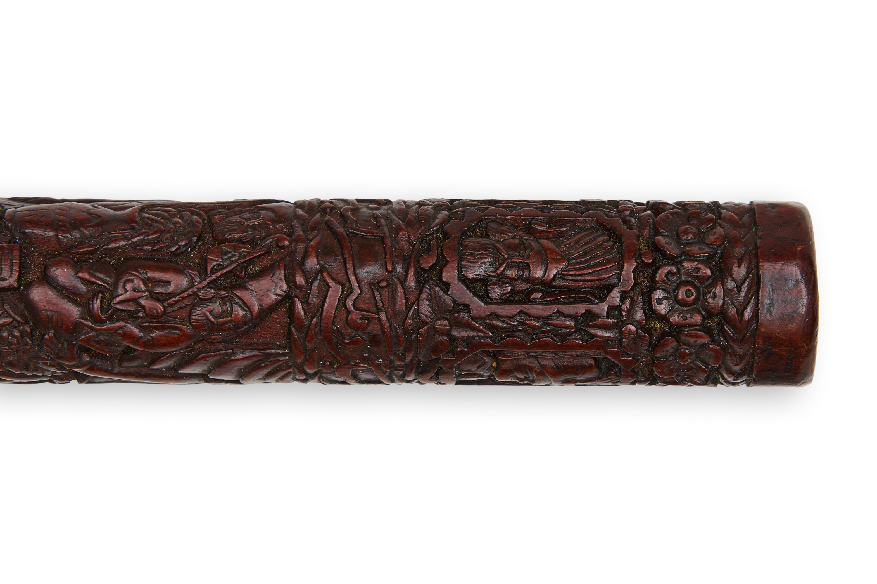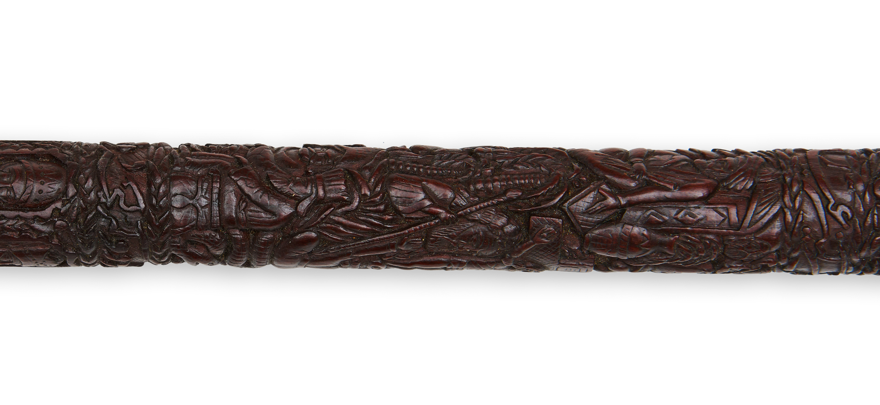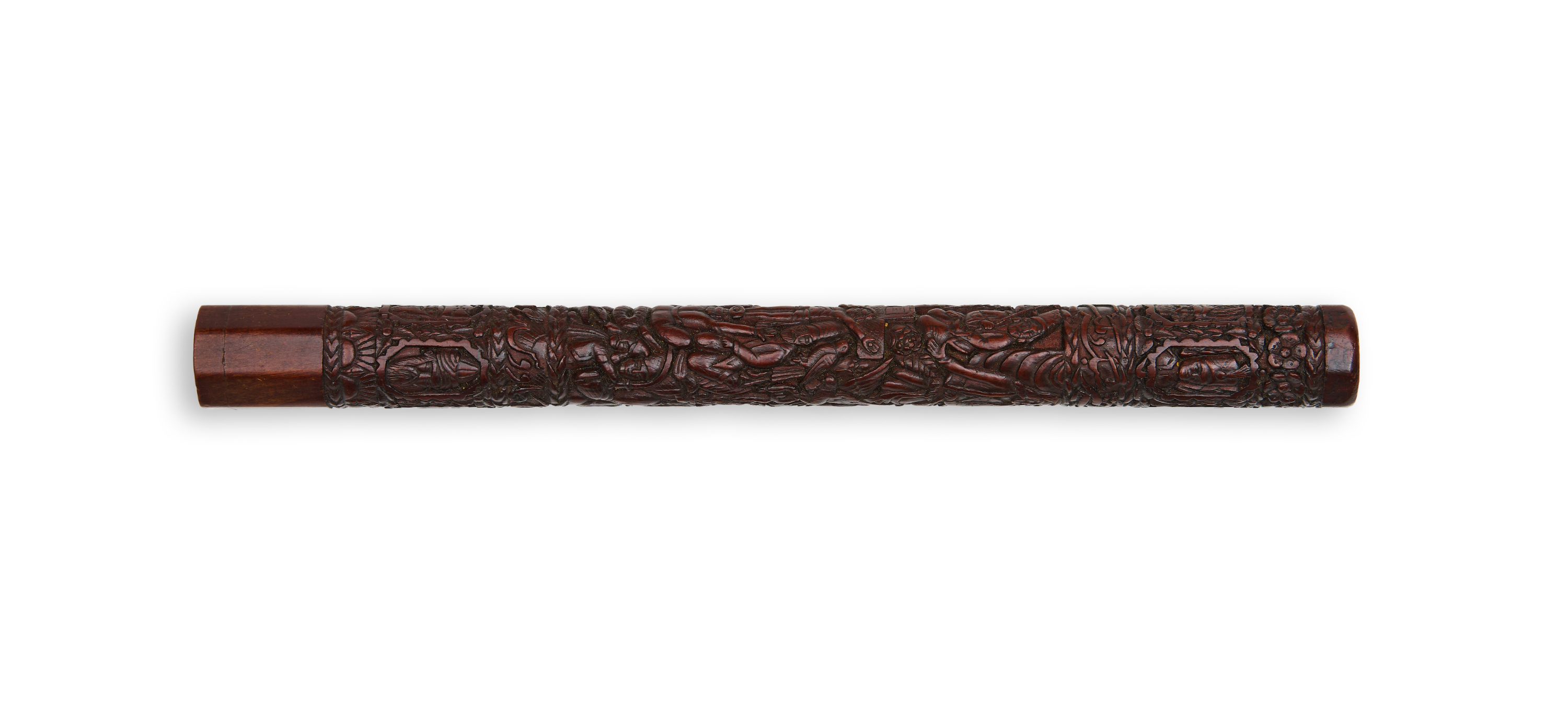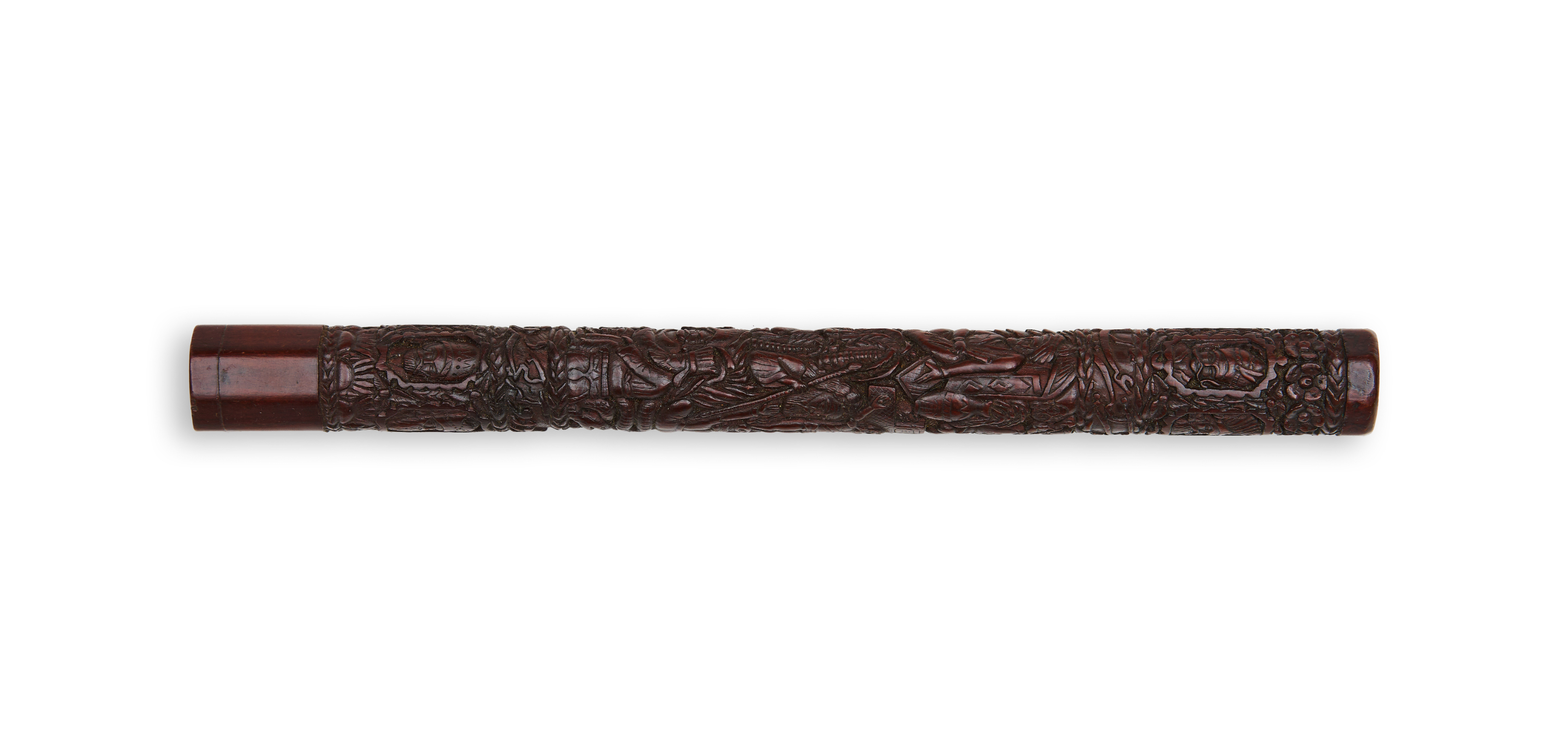 A very rare and fine 19th century Persian Qajar carved wooden dervish smoking pipe mouth piece depicting various Persian kings, dervish’s and religious figures.