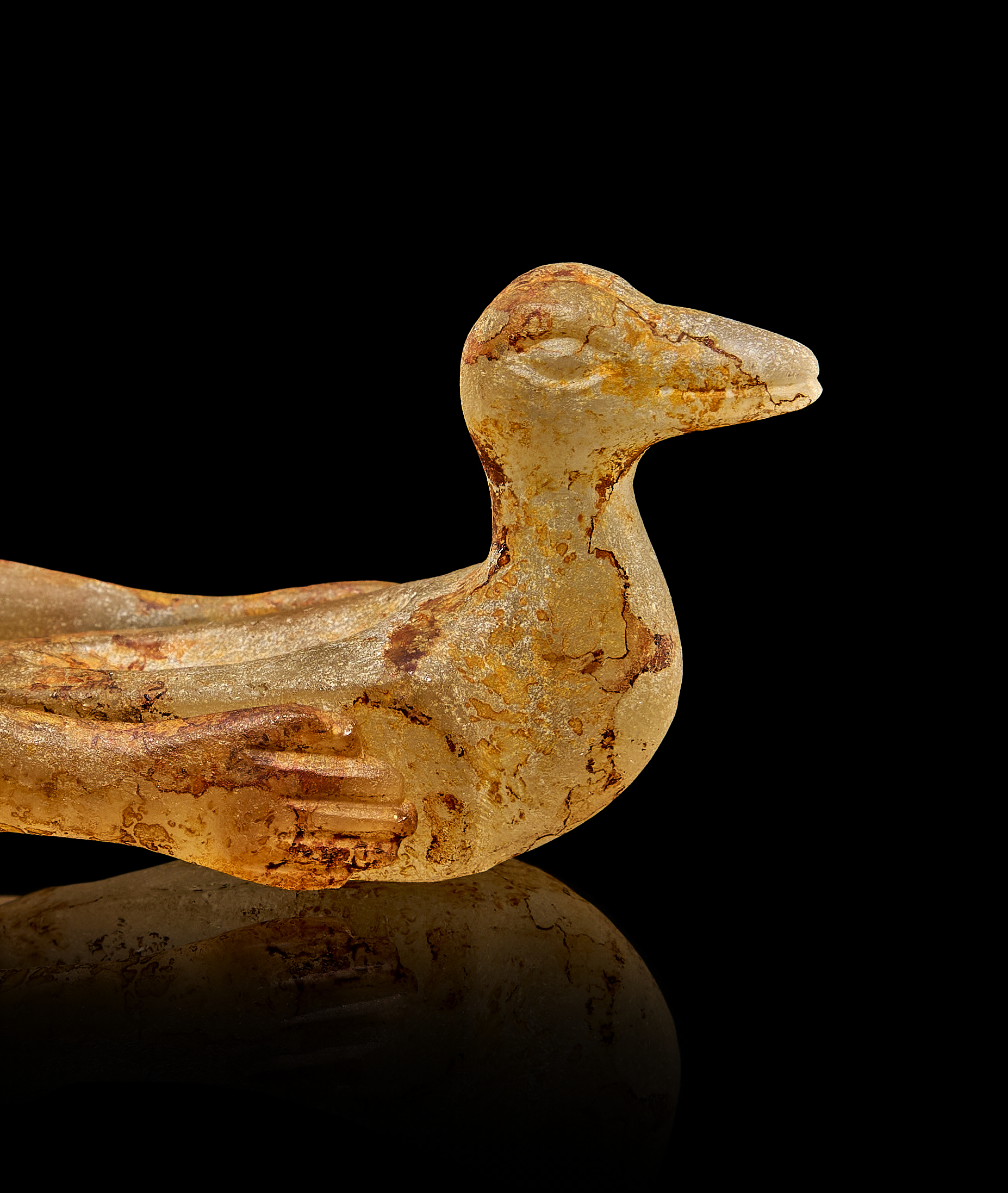 The duck float is equally detailed, with incised wings and a finely shaped head, exuding a sense of serenity and control. Light surface deposits and traces of ancient wear attest to the piece’s antiquity while enhancing its aesthetic appeal.