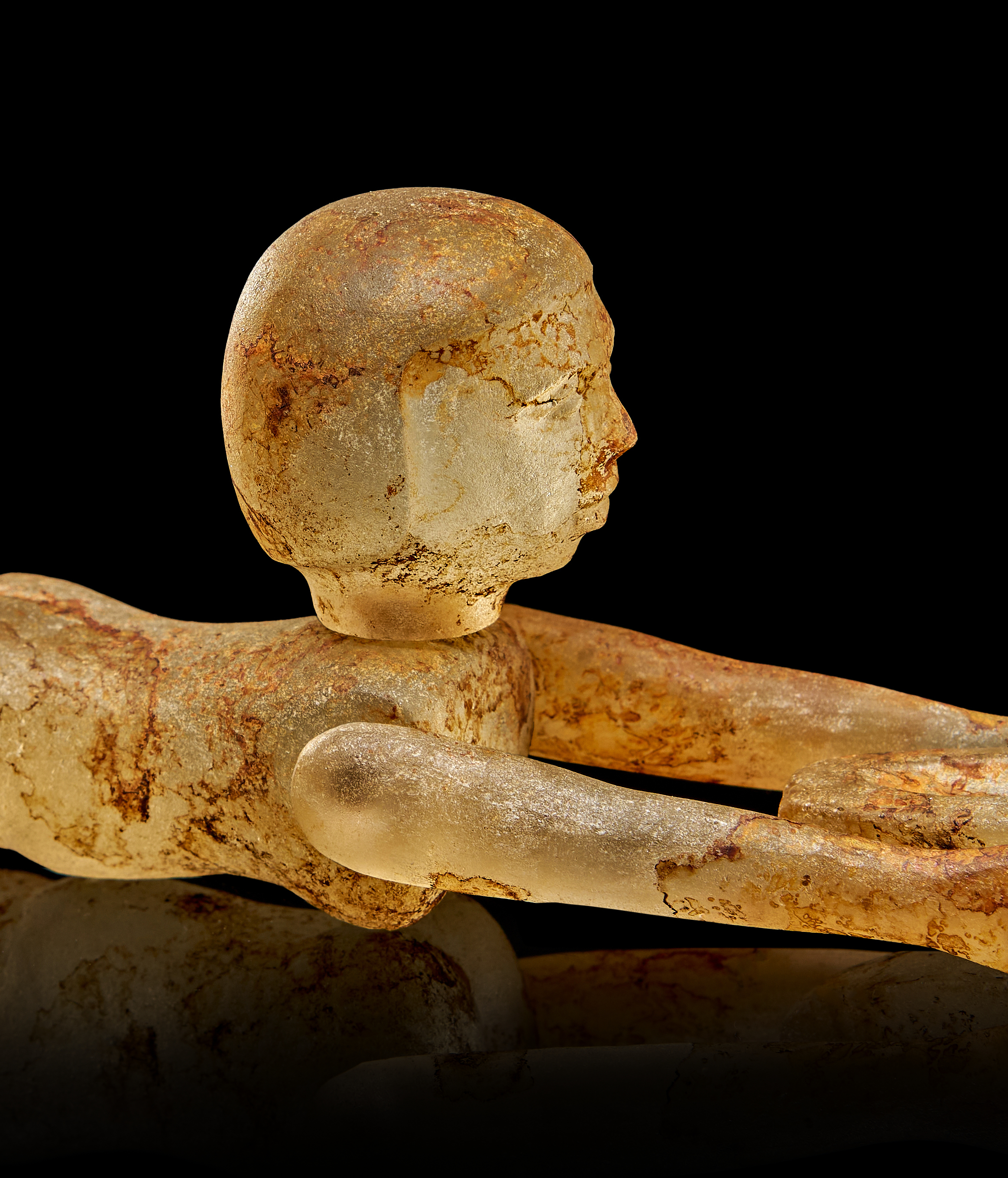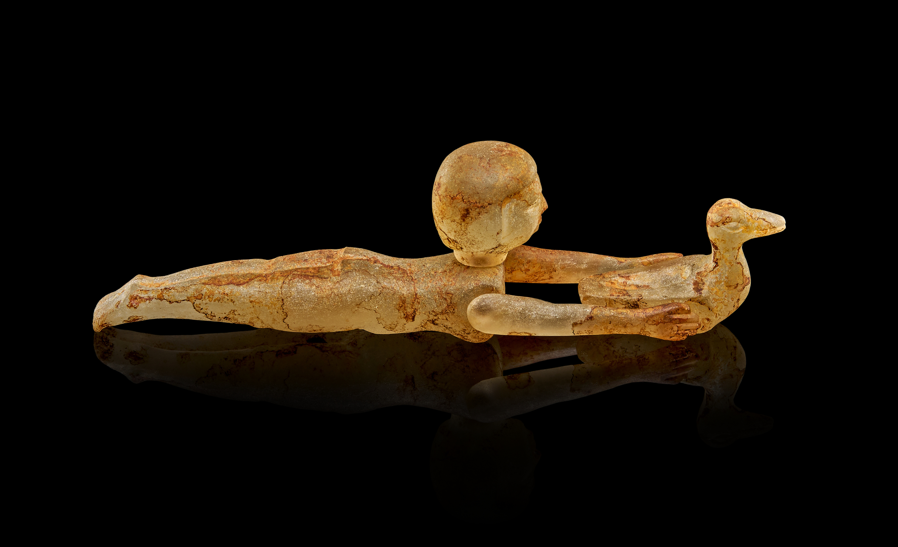 A rare and exceptionally well-preserved Egyptian figure carved from translucent rock crystal, depicting a young female swimmer in a dynamic prone pose. Originating from the New Kingdom period, this captivating piece dates to circa 1400–1300 B.C. The figure is shown fully outstretched, arms extended forward as she clasps a duck-shaped float—an iconic motif associated with leisure and river life along the Nile.
