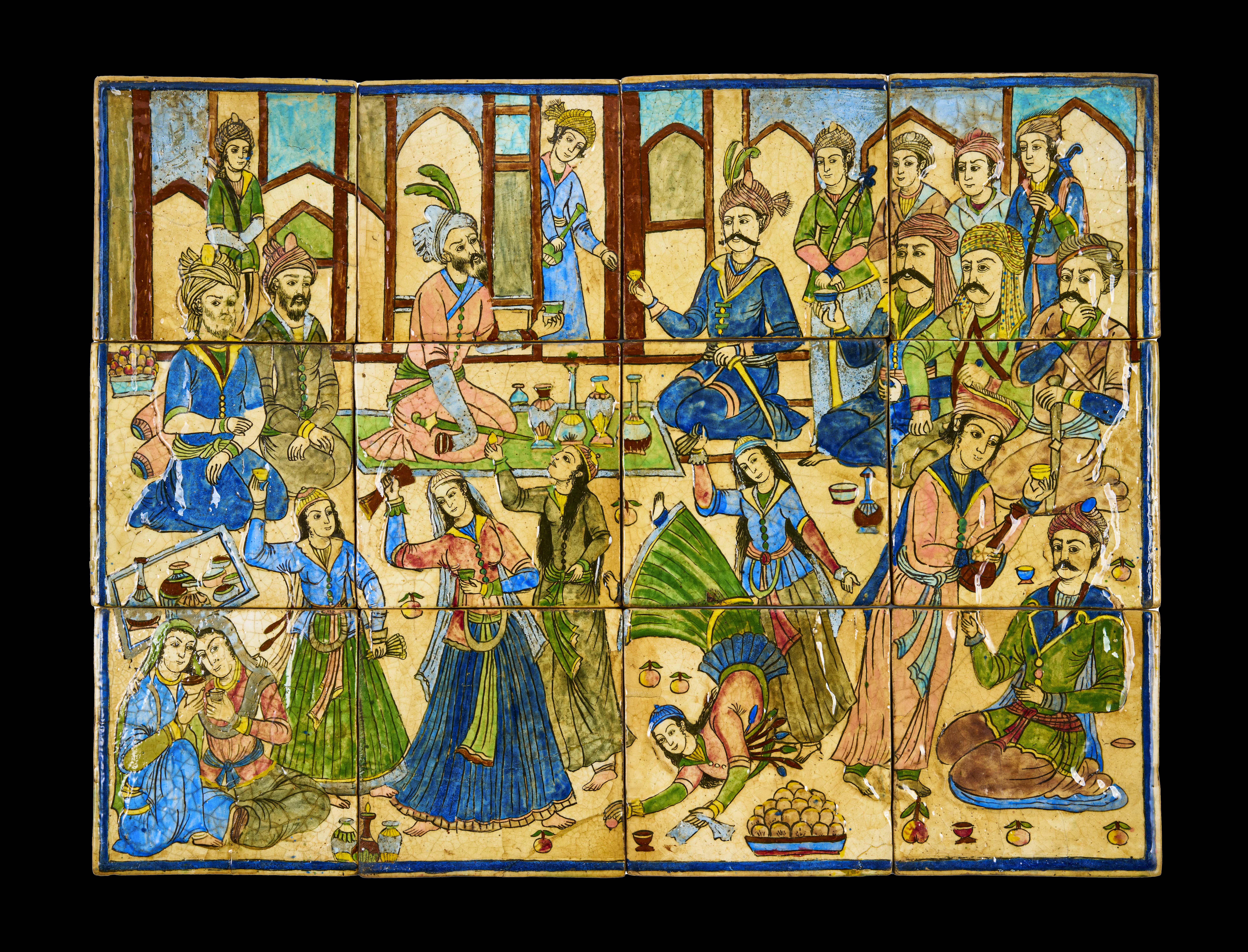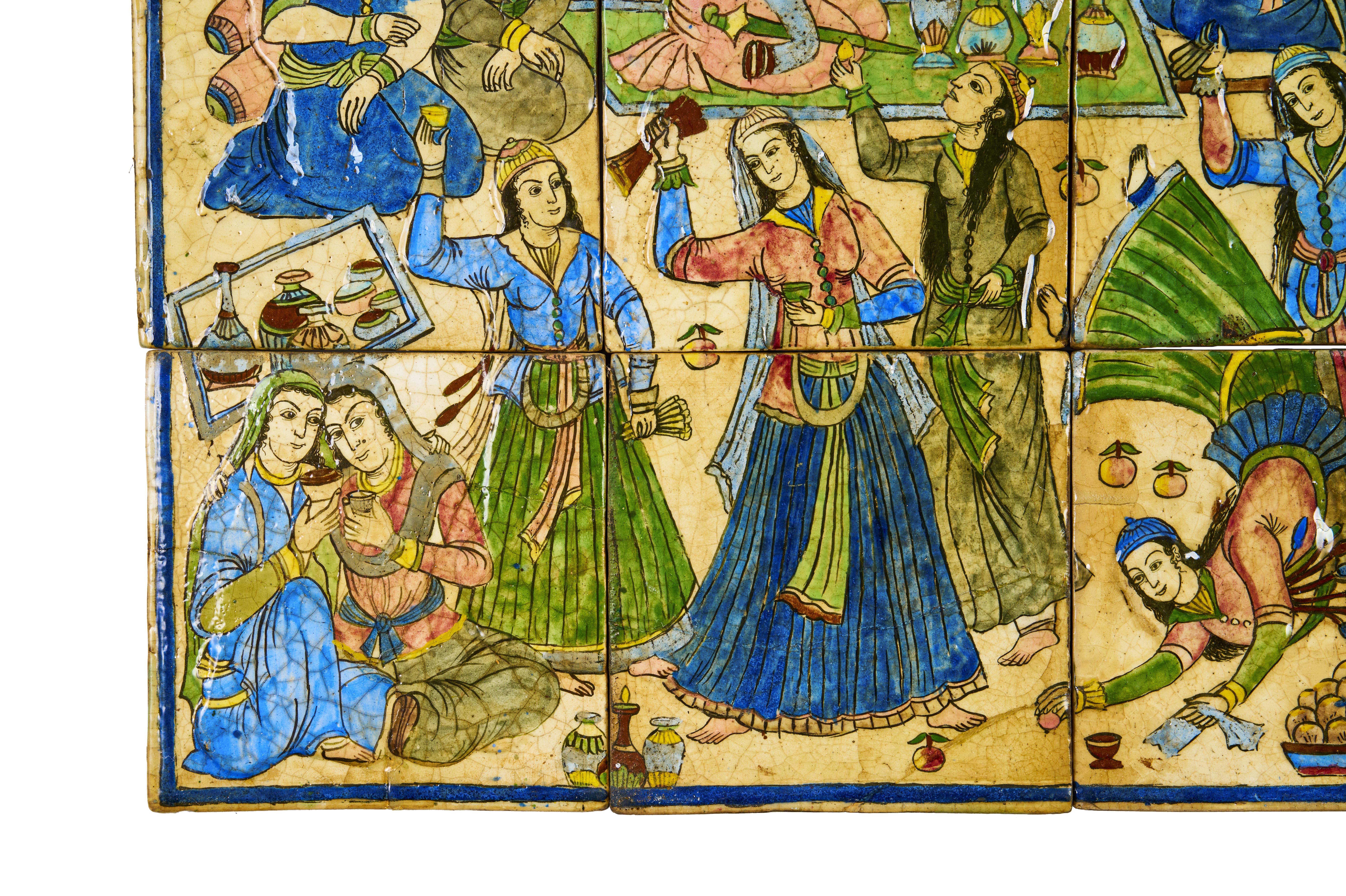 The tiles depicts a majestic courtly banquet scene, rich in colour and intricate detailing. The composition showcases Persian nobles and courtiers, dressed in vibrant traditional garments, engaged in festivities that include music, dance, and feasting.