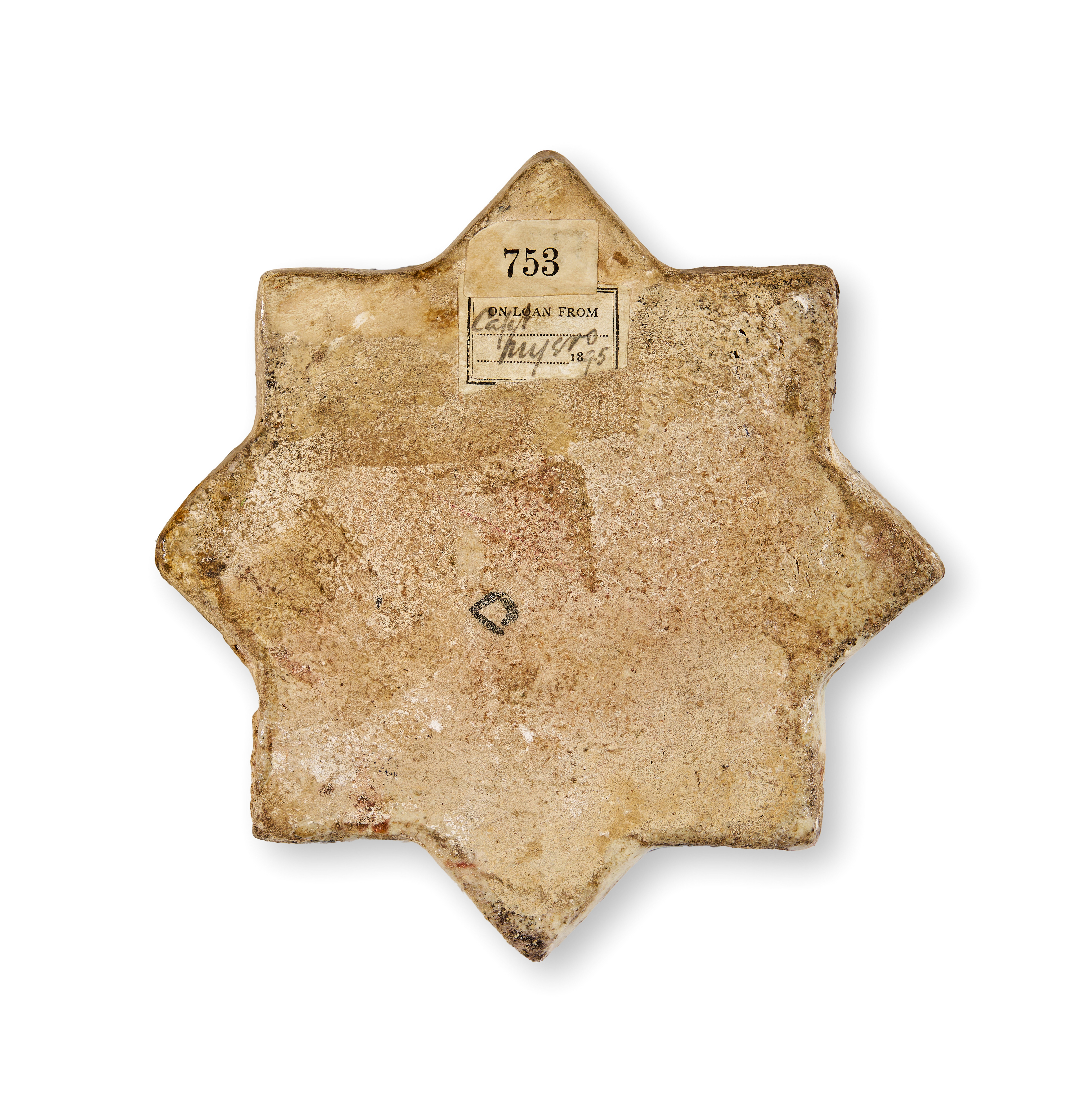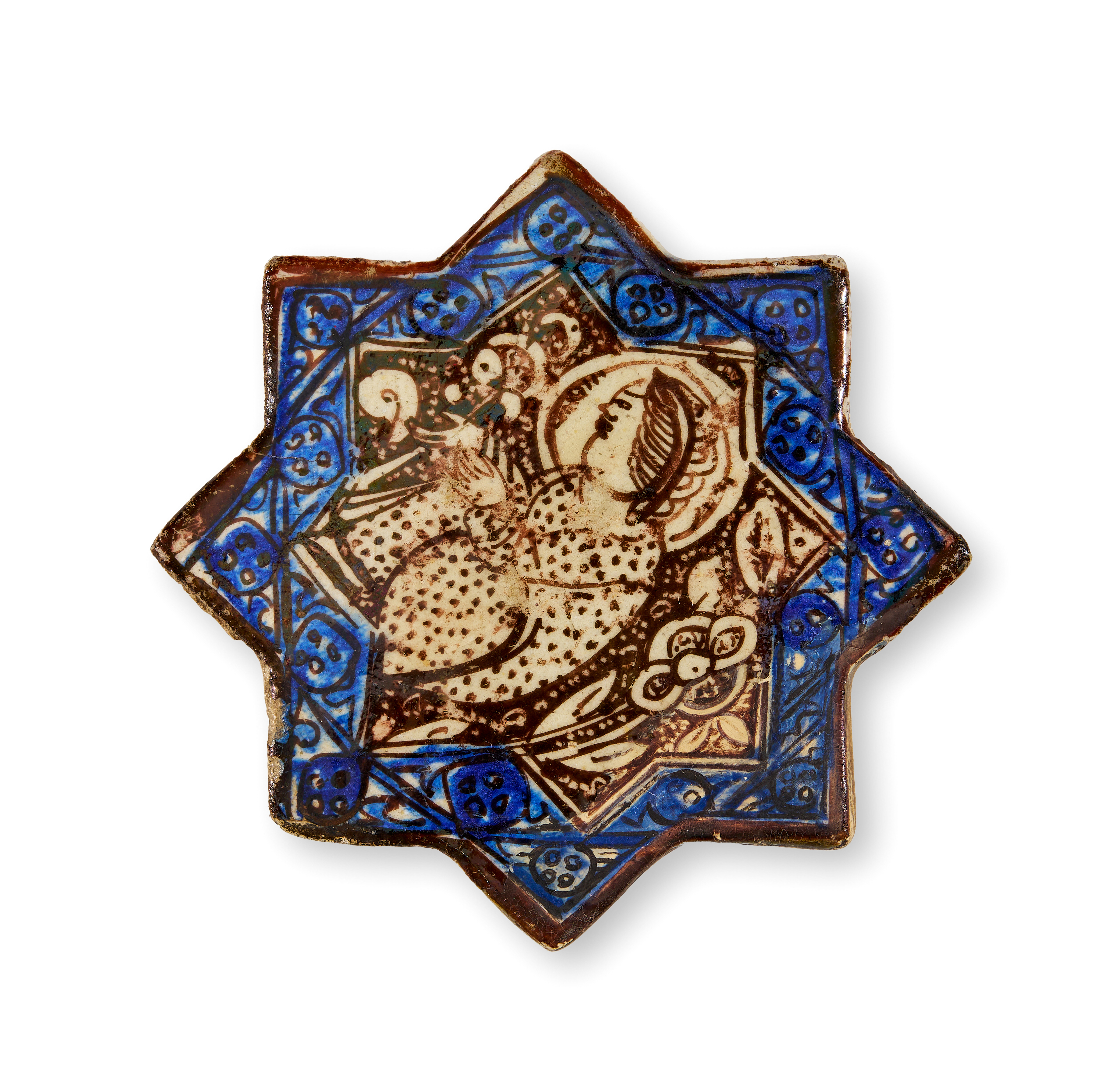 AN ILKHANID GLAZED POTTERY STAR TILE DEPICTS A SEATED FIGURE, PERSIA, 13TH – 14TH CENTURY