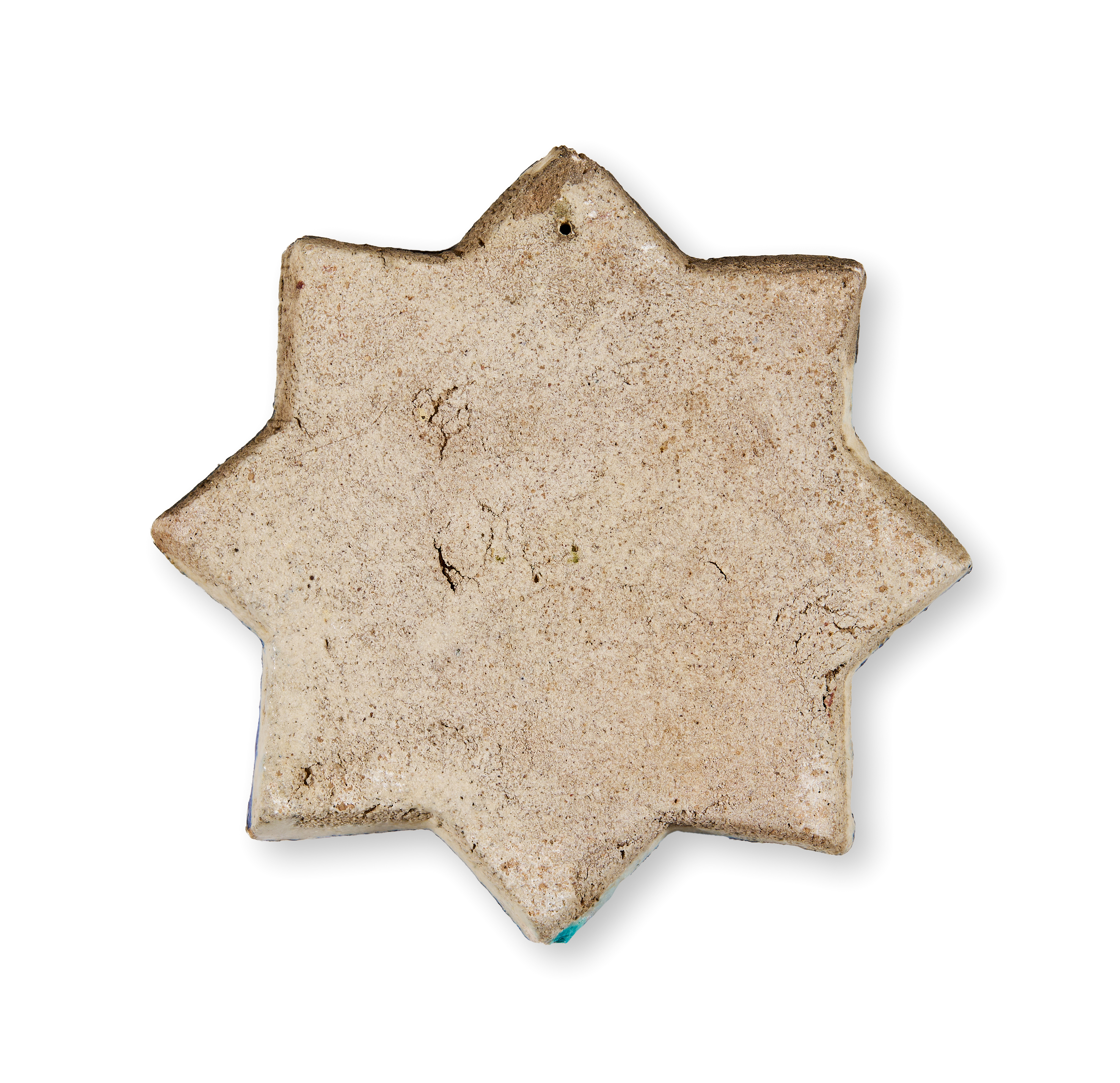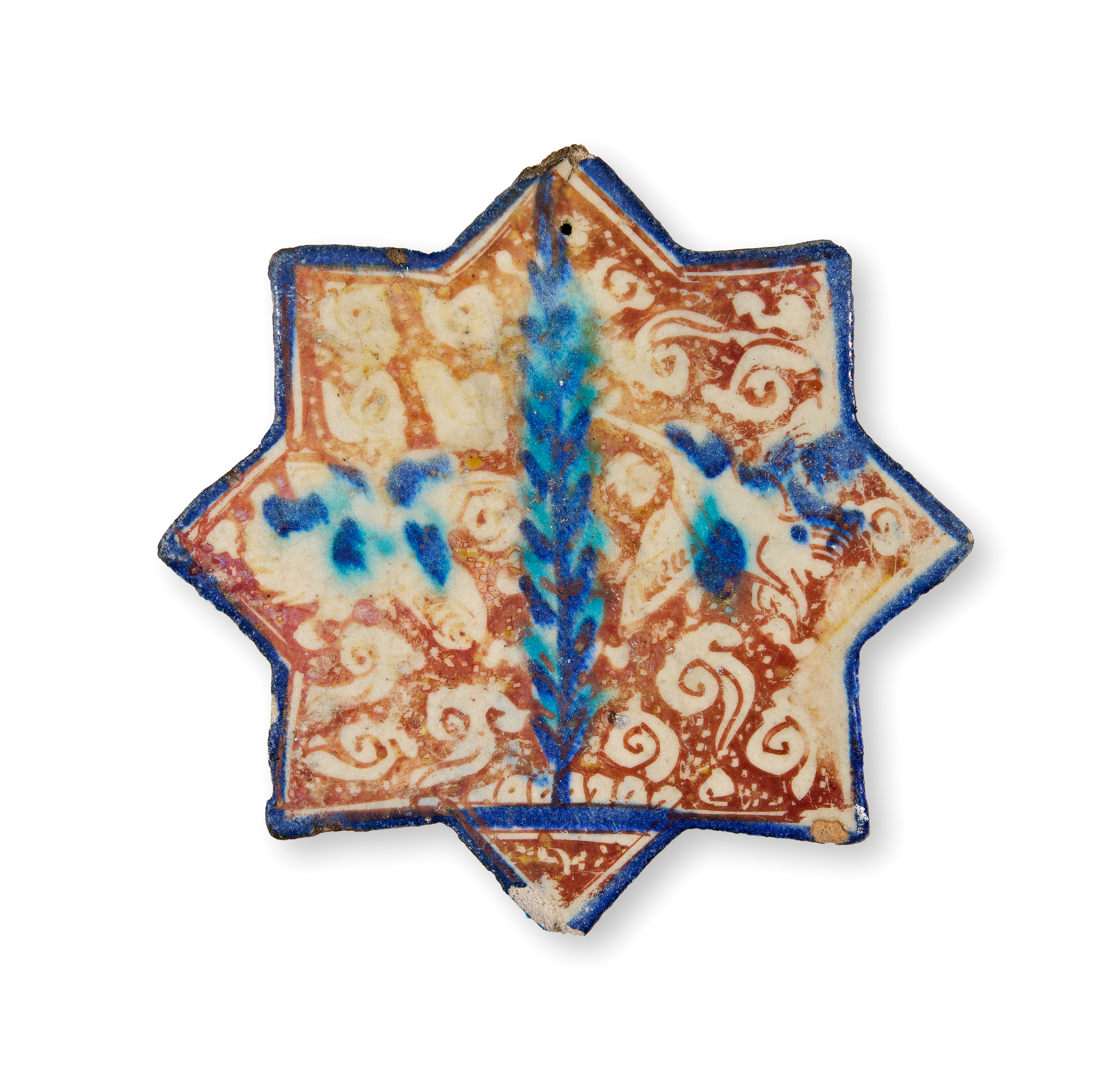 AN ILKHANID GLAZED POTTERY STAR TILE DEPICTS A TREE AND TWO BIRDS, PERSIA, 13TH – 14TH CENTURY
