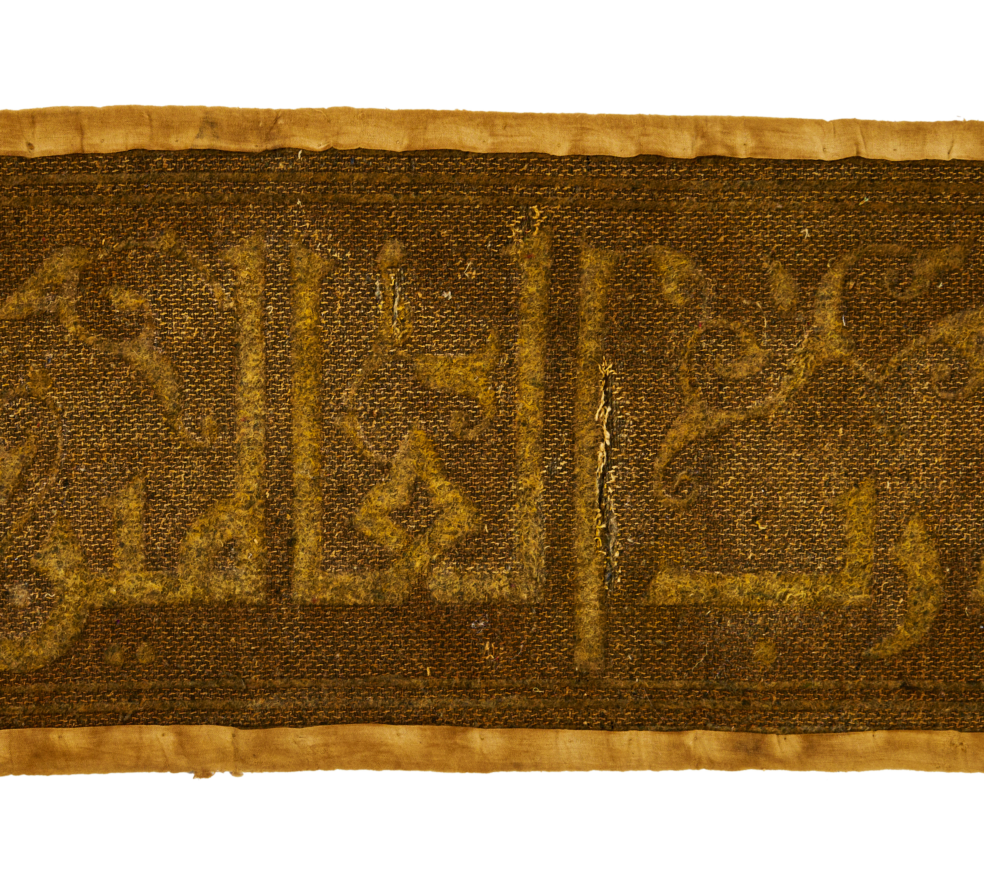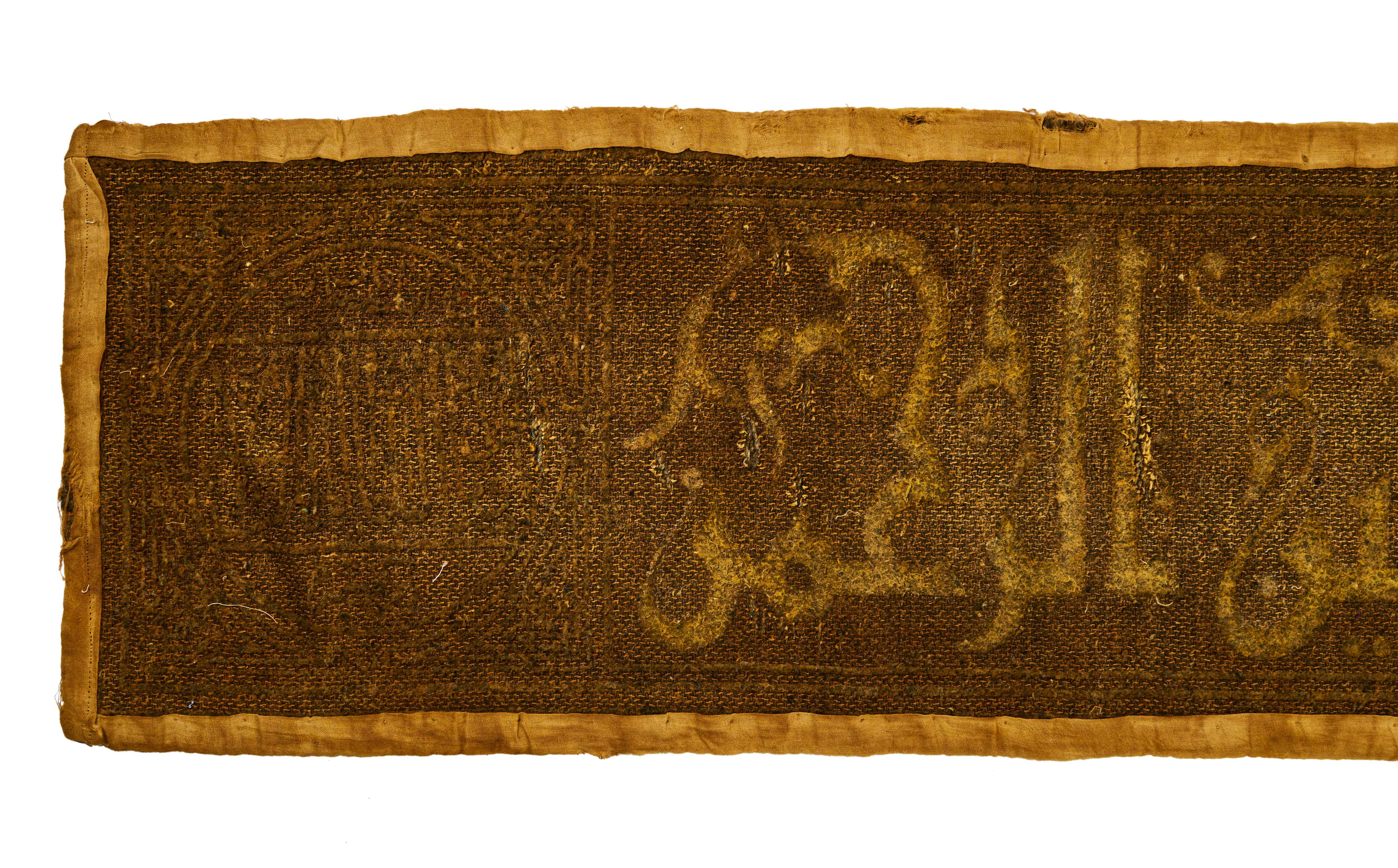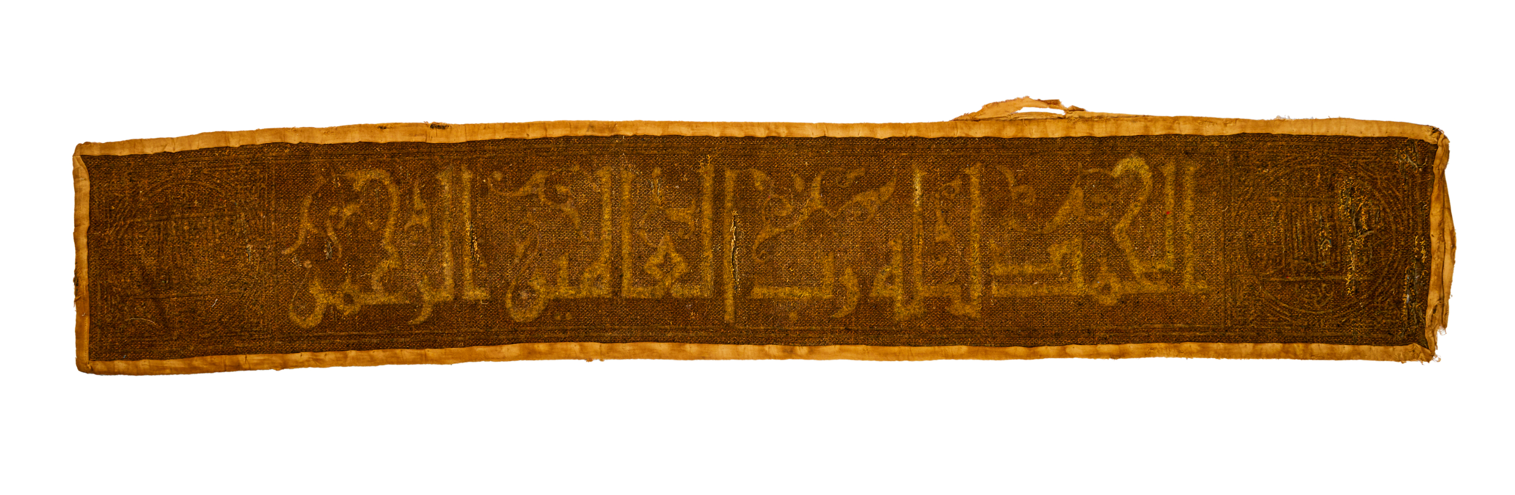 An 18th-century Mamluk-style textile panel featuring Quranic calligraphy. The panel is long and narrow, with intricate golden embroidery on a brown fabric base. The inscription, written in traditional Arabic calligraphy, includes the phrase:
