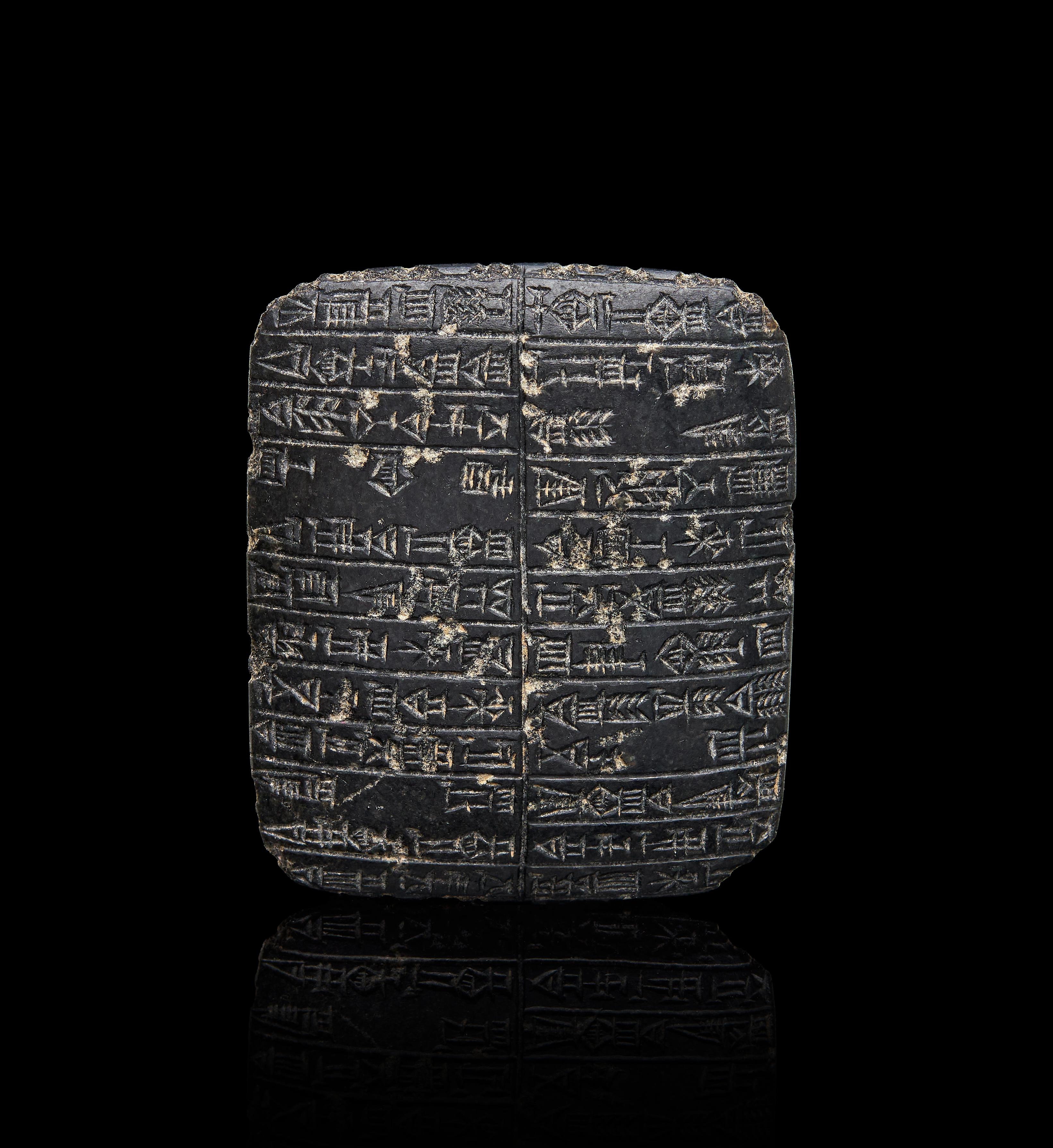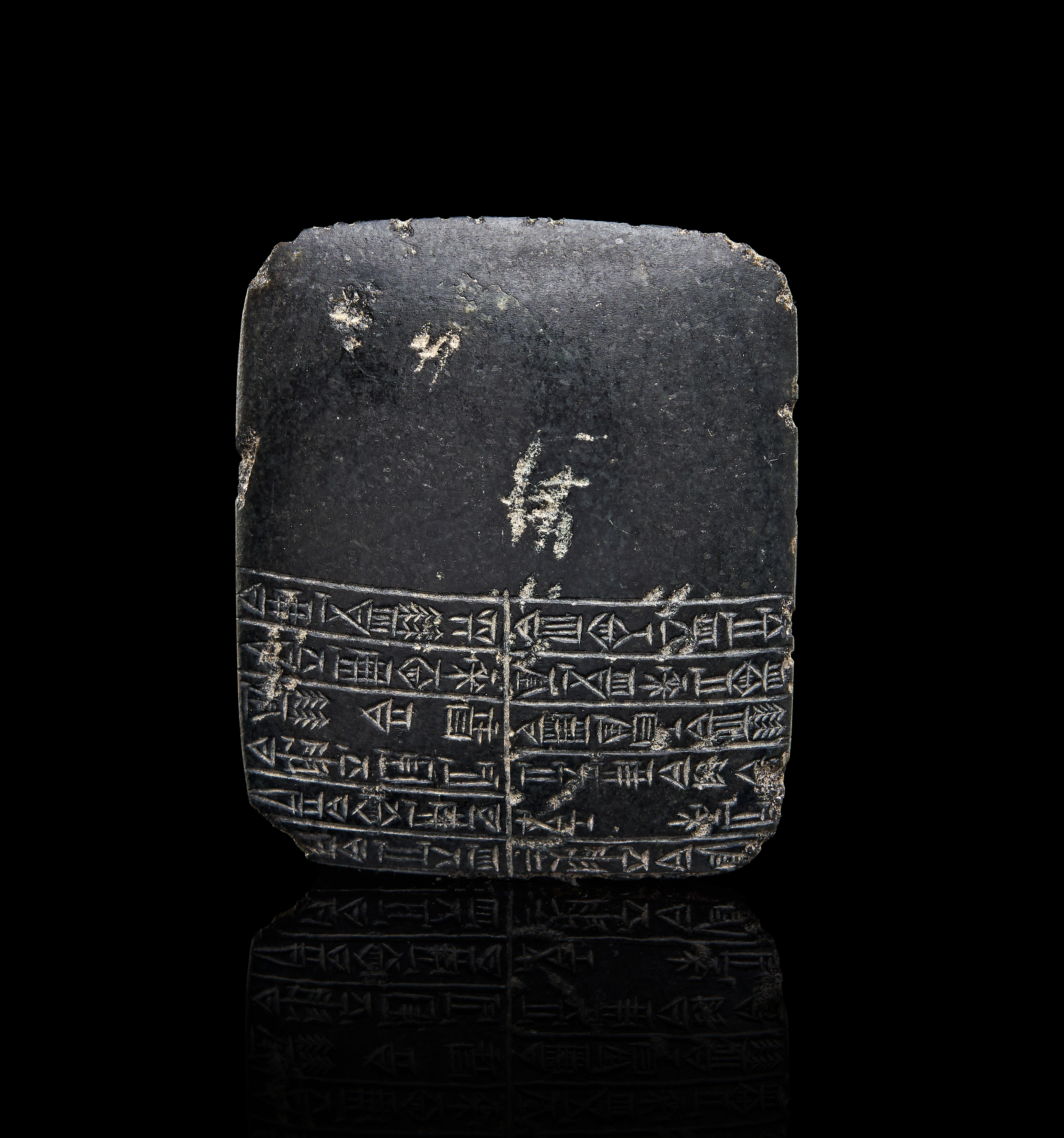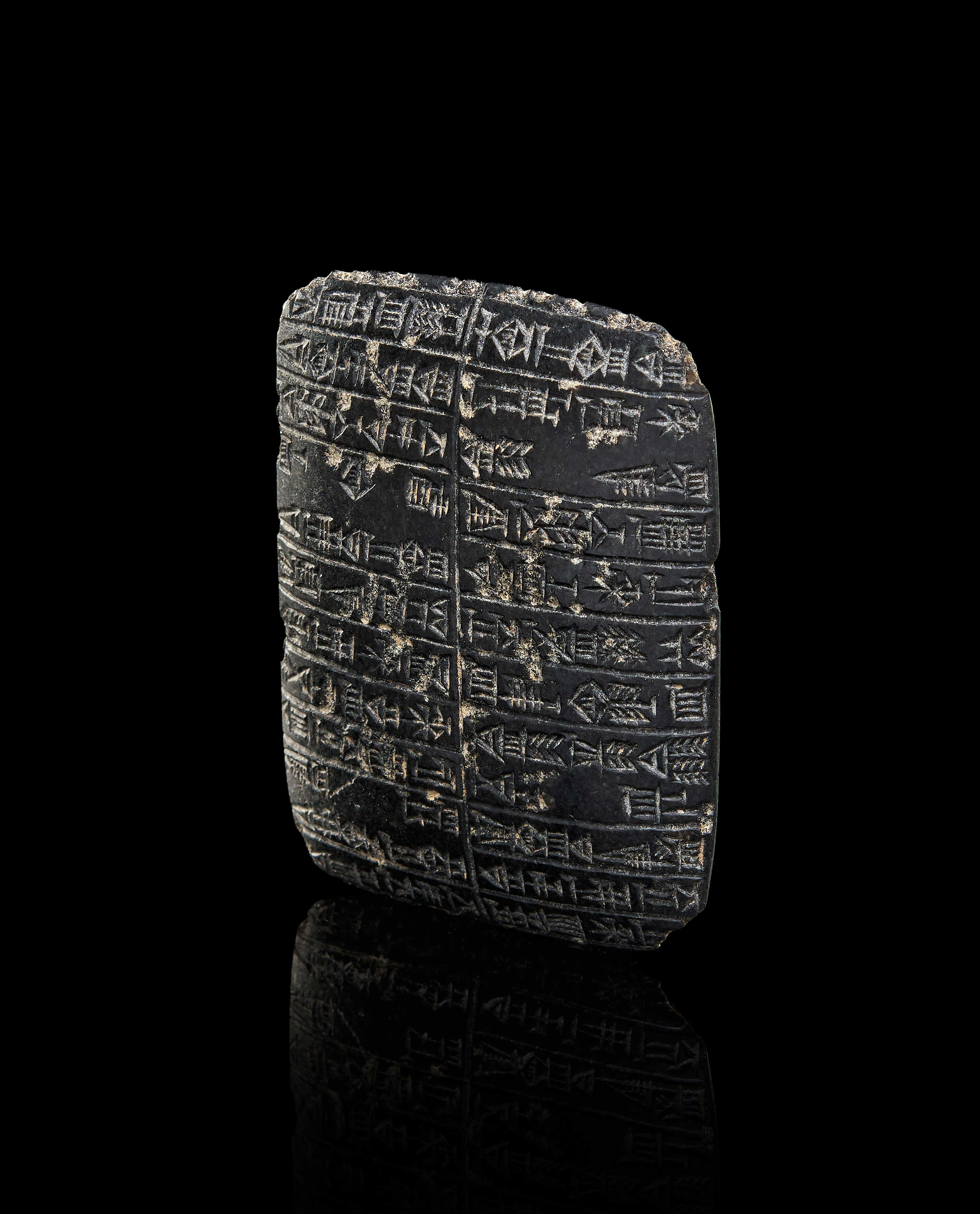 A BLACK STEATITE PLAQUE DEDUCTION TO A CERTIN TEMPLE IN UR PRYAYER TO GOD SHAMASH, AKKADIAN, 2022-1850 B.C