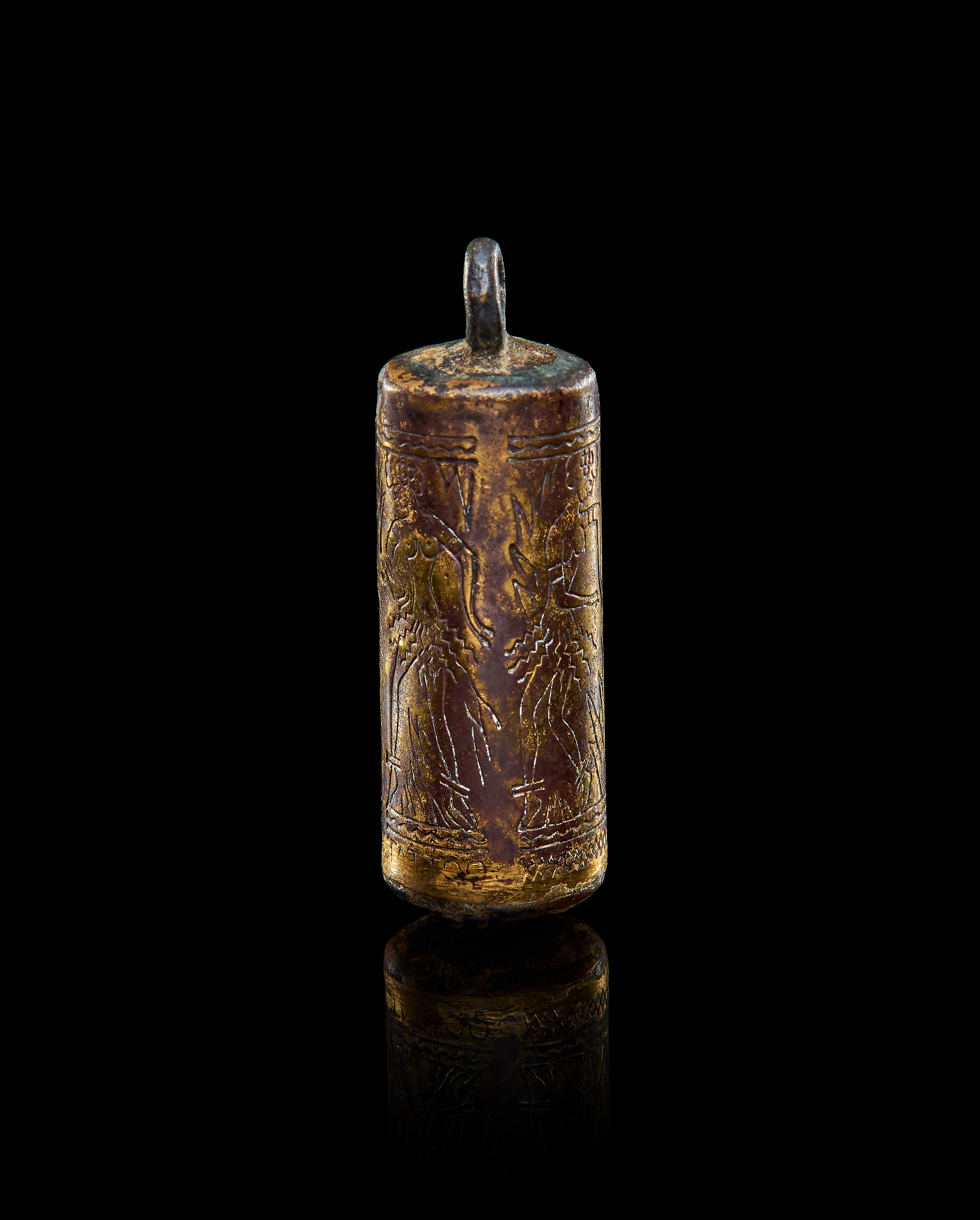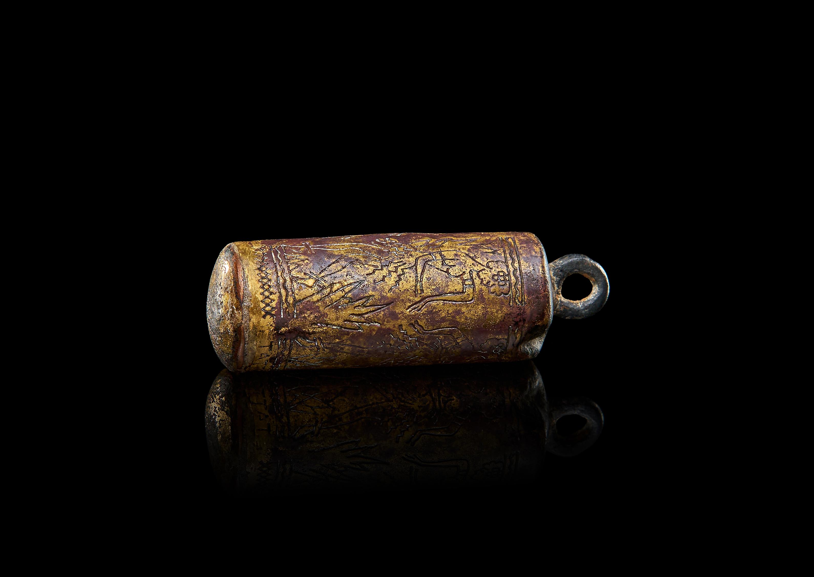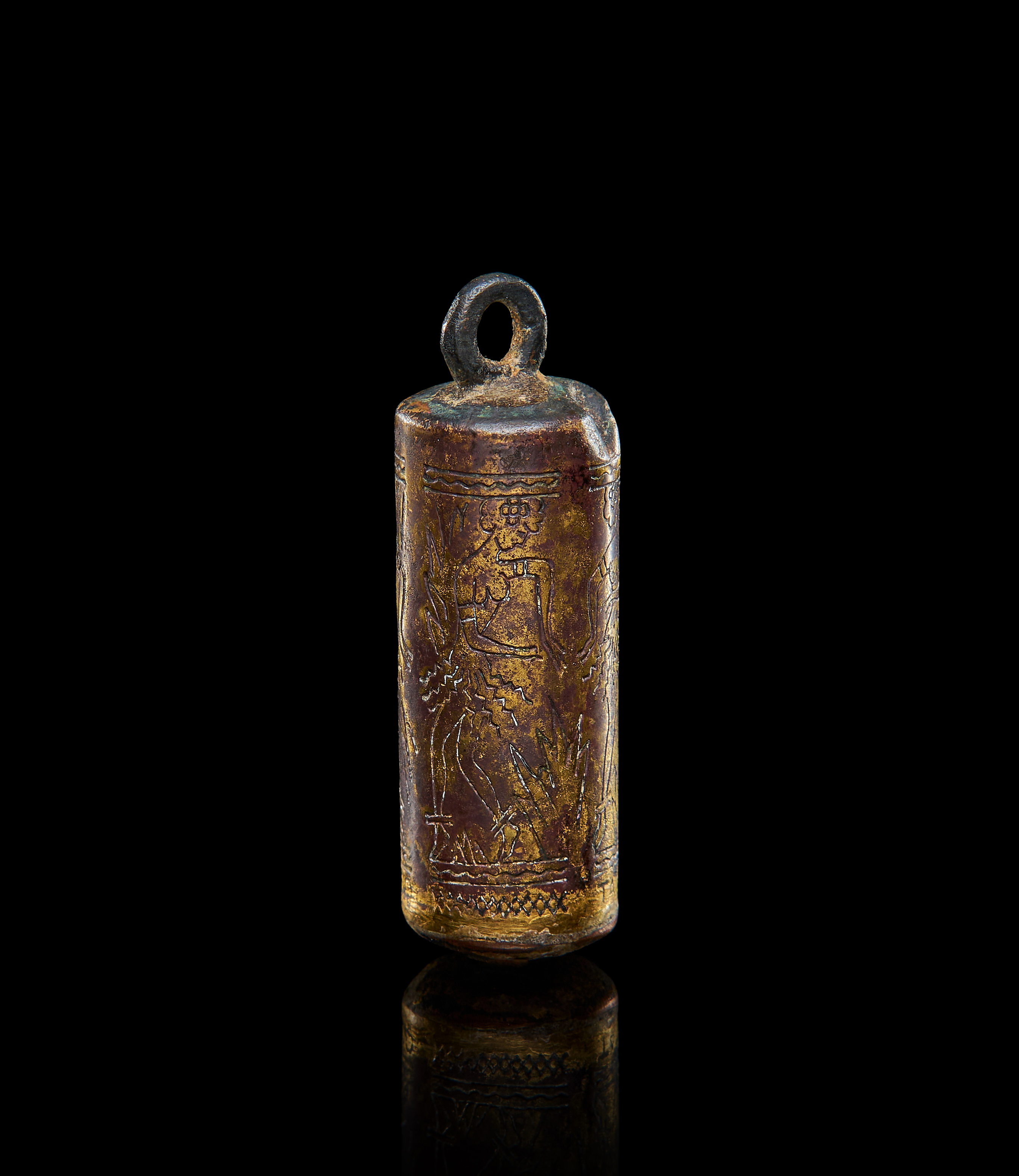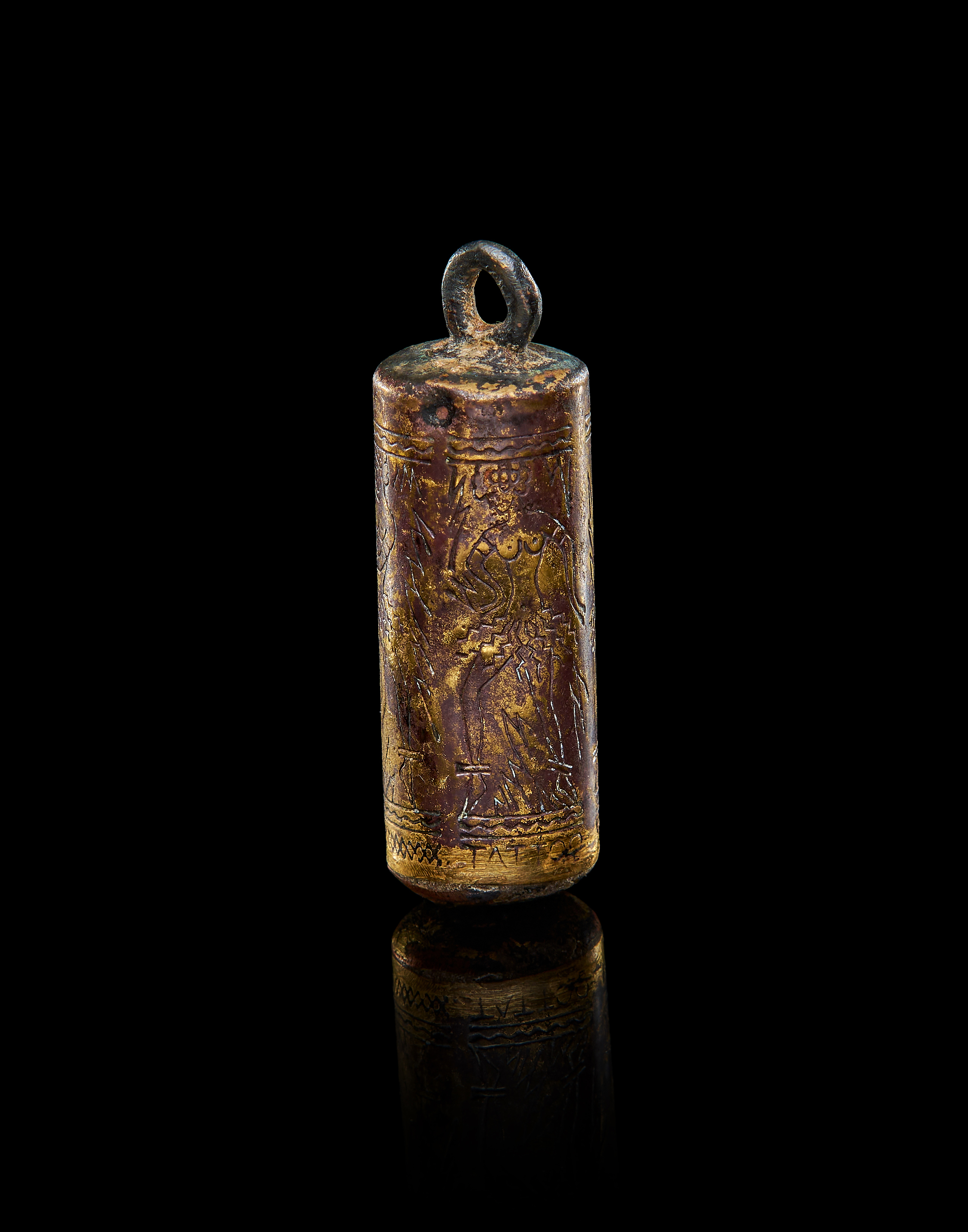 A GILDED COPPER CYLINDRICAL PENDANT DEPICTS A NAKED FEMALE DANCERS, PROBABLY ROMAN PERIOD